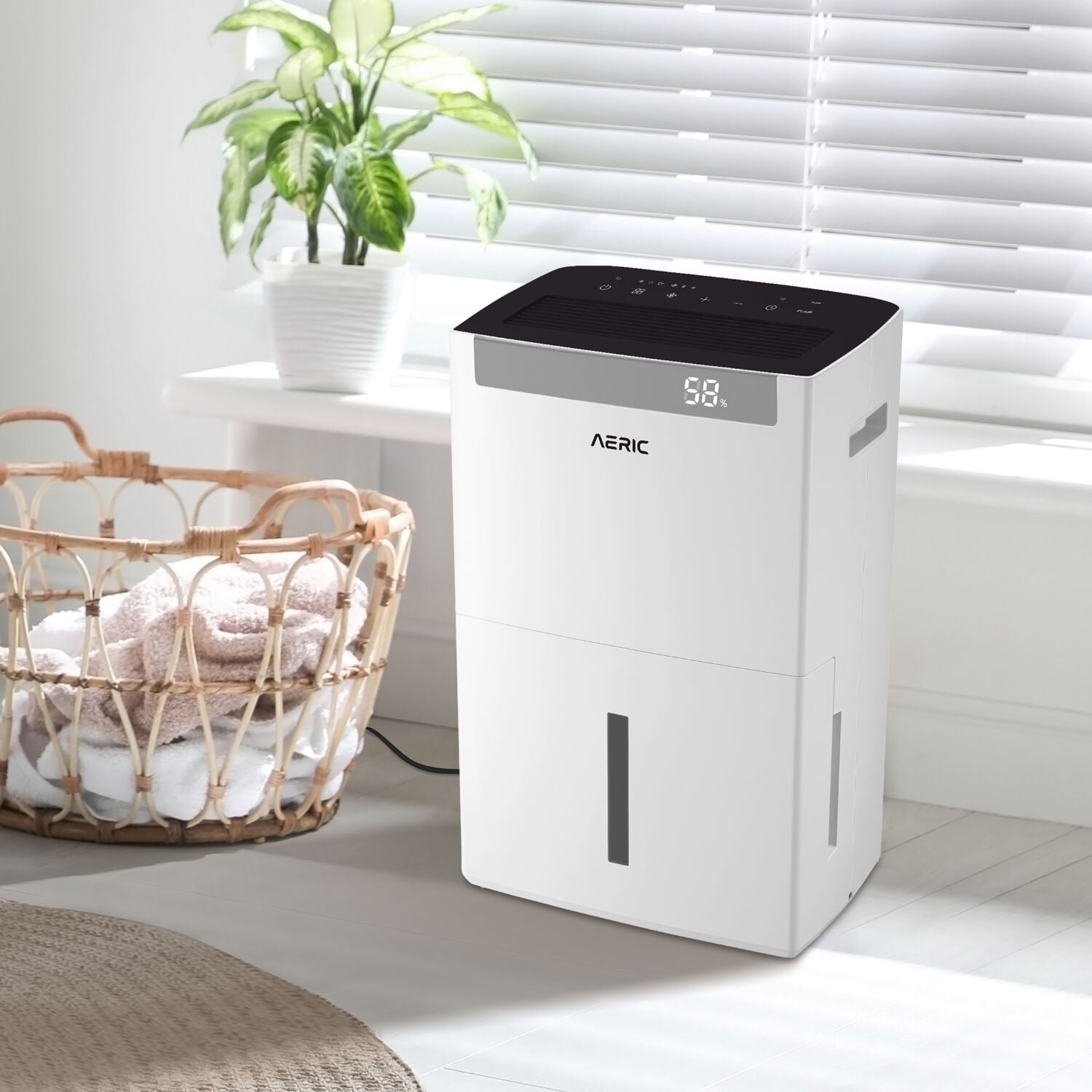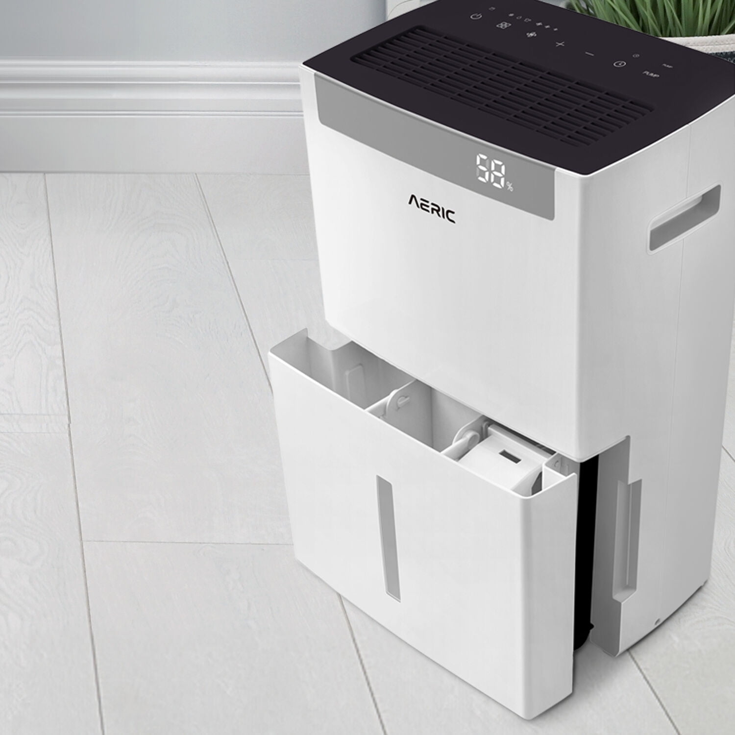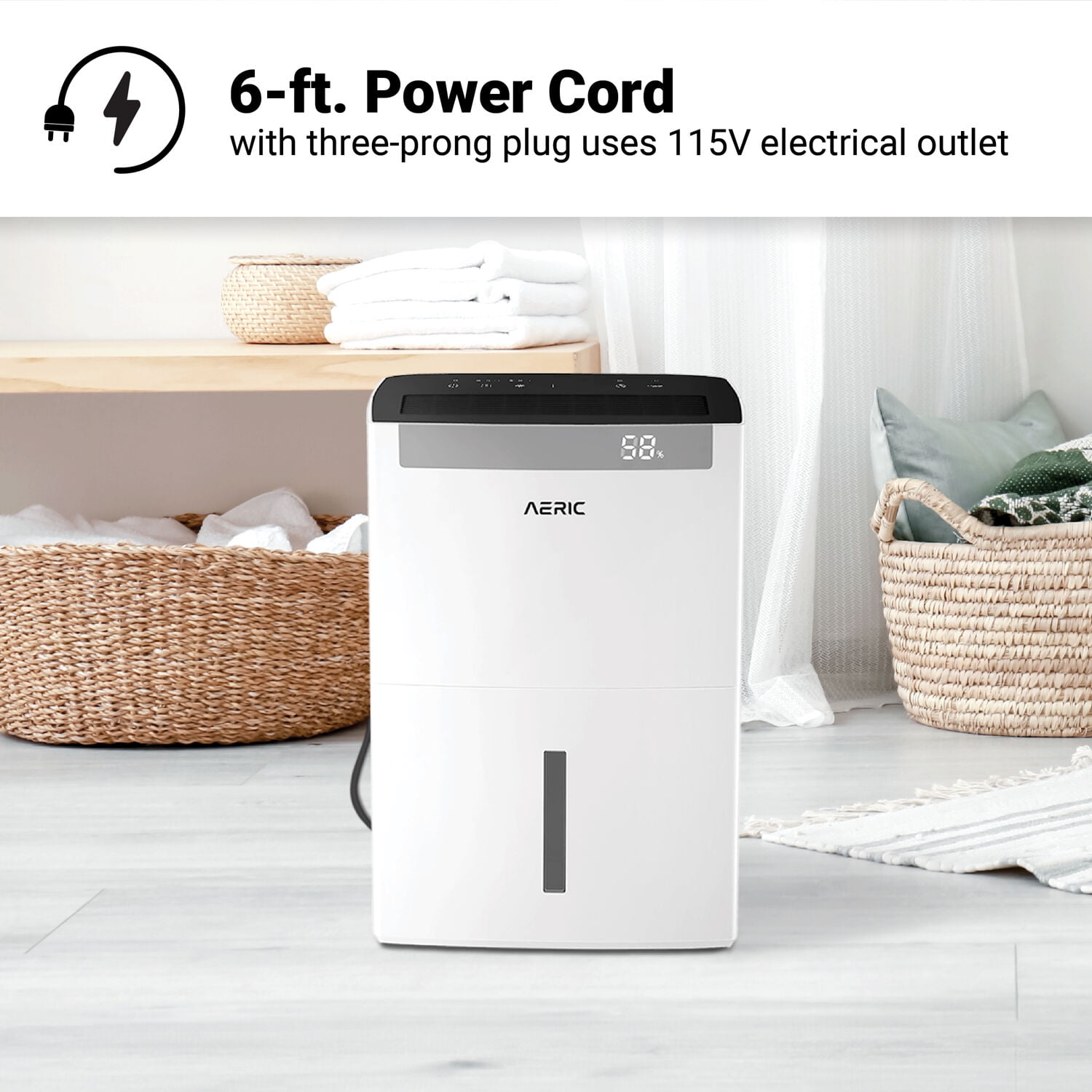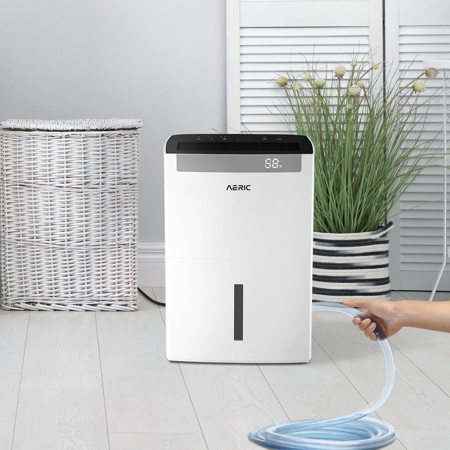 The Energy Star top-rated Aeric 50-pint dehumidifier removes 50 pints of moisture from the air each day, humidistat controls up to 90% humidity, removing dampness and protecting your home from excess moisture. With the touch of a button, the LED digital display allows you to adjust humidity levels for maximum comfort. With a bucket size of 16.7 pints, you will be able to eliminate excess moisture while also not straining to lift and empty heavy buckets. With a compact size and a modern design, the Aeric unit is a subtle and sleek addition to any space. Perfect for garages, basements, bedrooms, and more, the unit makes a significant impact wherever you need it. Enjoy a washable and reusable filter to always guarantee a clean running unit and fresh airflow. Designed with 2 fan speeds and a 24 hour on/off programmable timer, the Aeric dehumidifier works around when you need it most. Aeric 4500 sq. ft. 50 Pint Dehumidifier,1 Piece, White, AERD501P