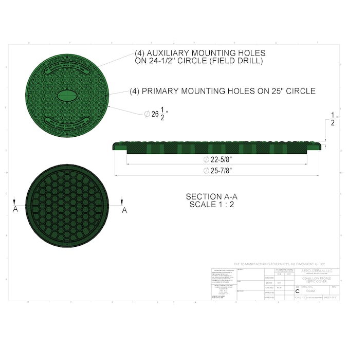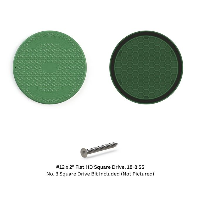 Low profile cover adds only 1/2 in. to the riser. Fits 24 in. inside diameter ribbed and smooth wall pipe. Green structural foam hope. Includes four (4) stainless steel screws to attach cover to riser ring. Compressible rubber gasket.