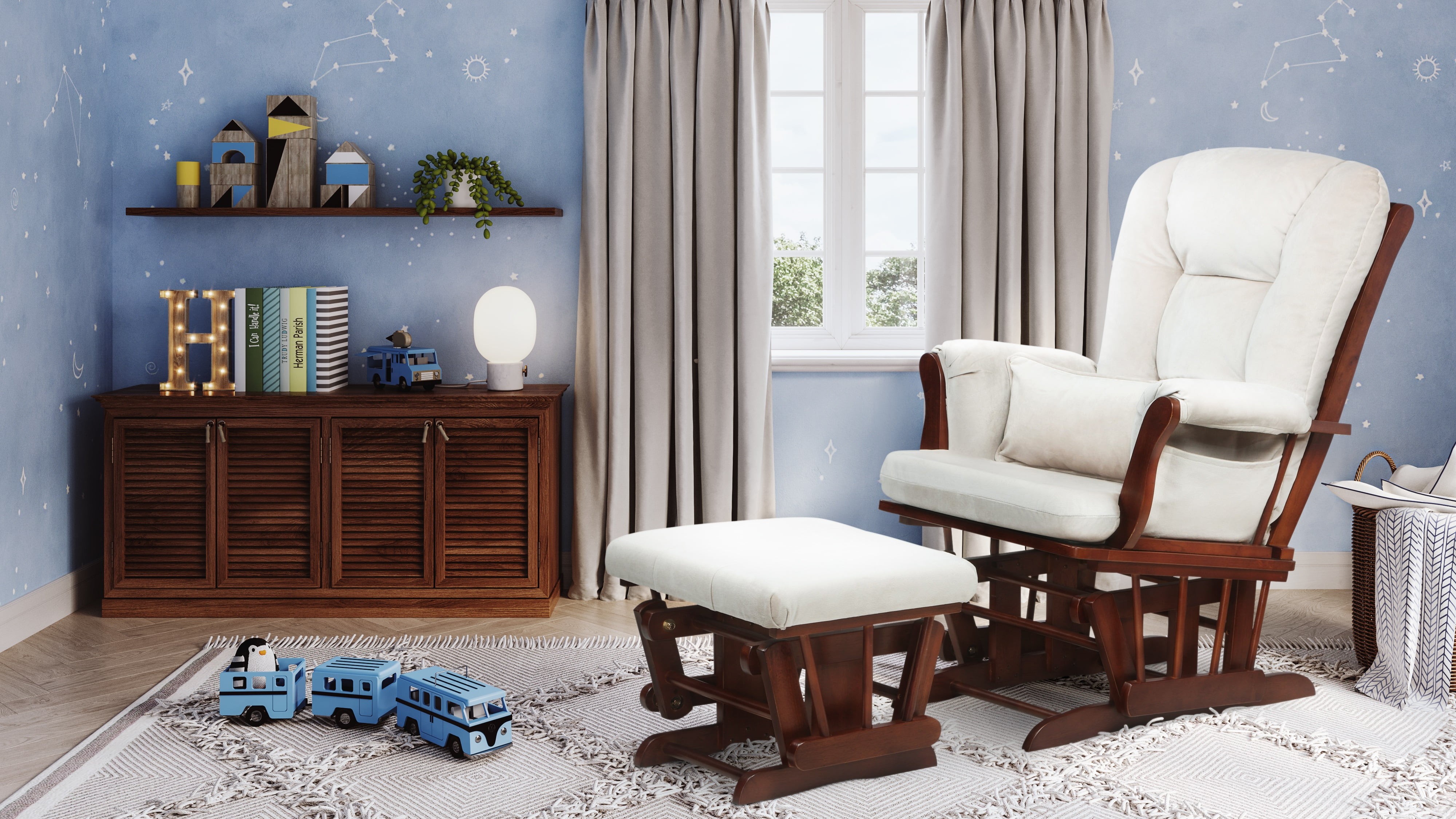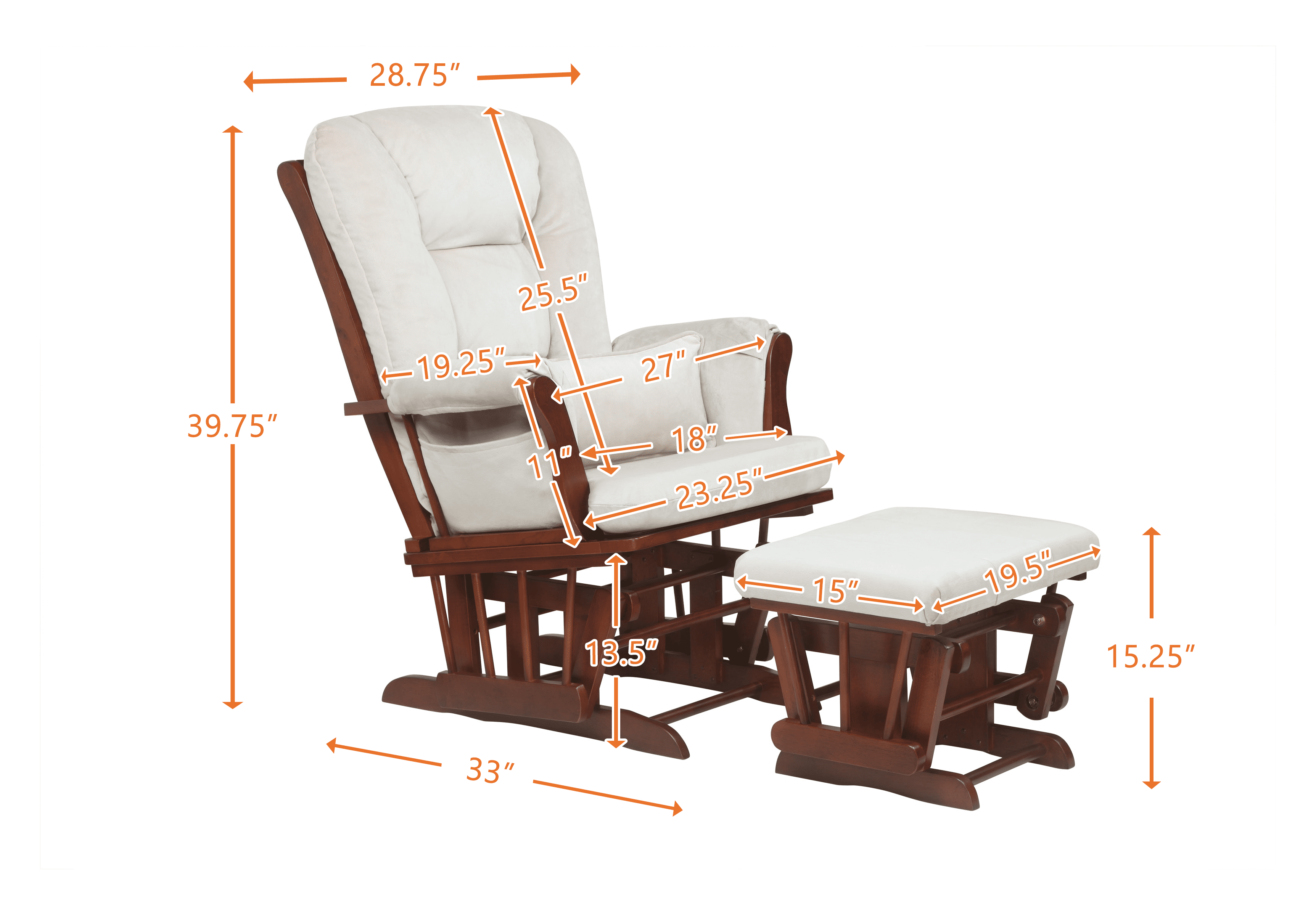 AFG Alice Glider and Ottoman Top quality steel ball bearing glides Made from wood, fabric and metal Overall Dimension: 34 in. W x 27 in. D x 40 in. H (44 lbs.) The Alice Glider Chair & Ottoman provides comfortable seating in the nursery, living room, or office. It is ideal for nursing a baby, watching TV, or simply relaxing after a long day of work. The sturdy hardwood construction and generous padding on the seat, back, arms, pillow and ottoman will ensure your enjoyment. Top quality steel ball bearing glides on both the chair and ottoman make the gliding action incredibly smooth and quiet. It’s all about luxury and comfort and makes a wonderful gift.