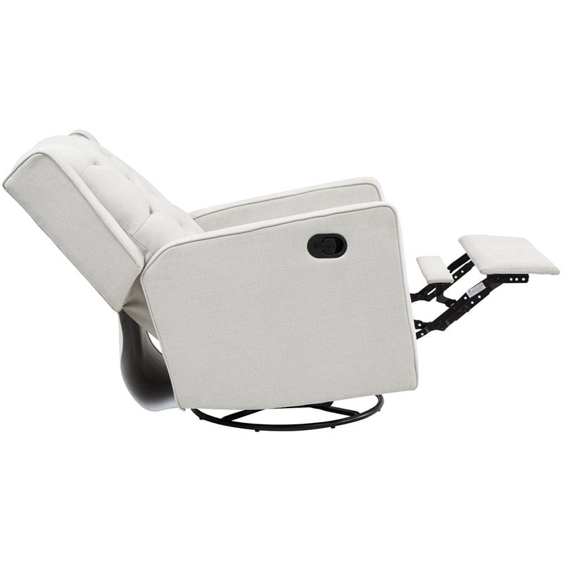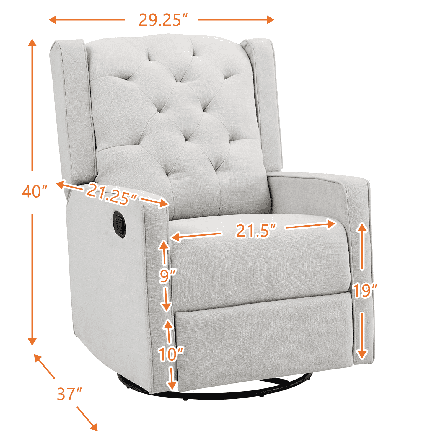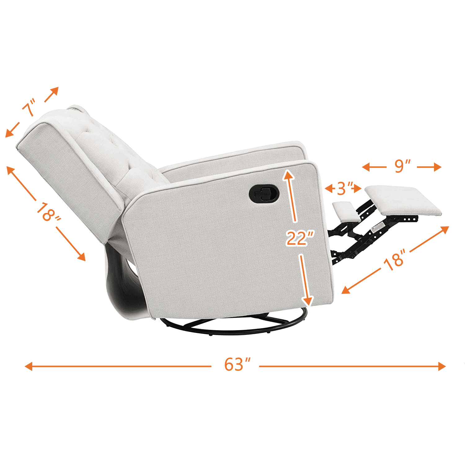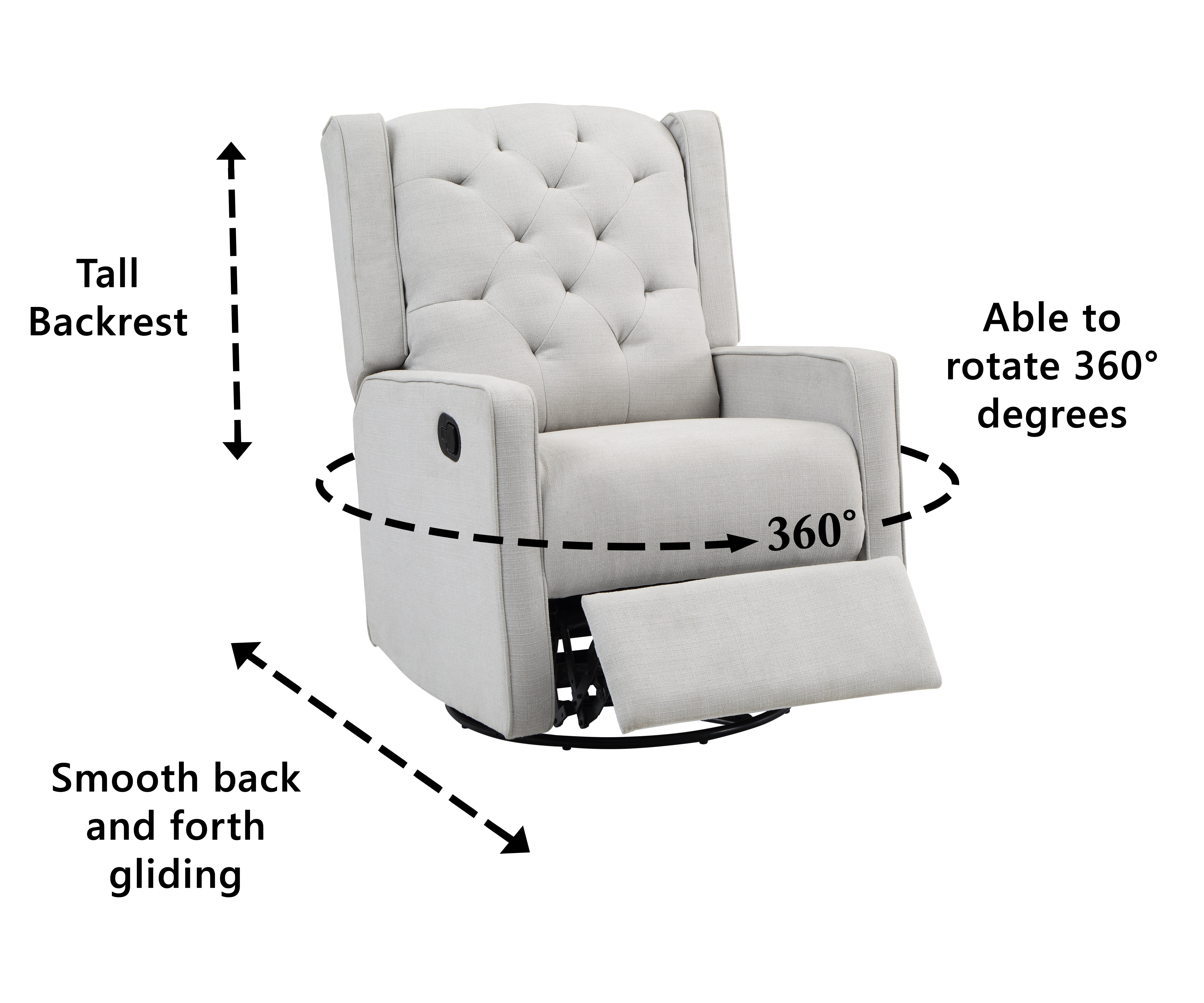 Thickly padded armrest, back, and seat cushions provide long-lasting comfort and support with a generous seating room. The manual pull reclining mechanism ensures additional back and leg support. Manual recliner mechanism located on the exterior, right-hand side of the arm rest Clipped squared arms Smooth and quiet steel ball bearing gliding and swiveling system. Back and seat cushions are removable for easy care and cleaning. Available Color(s): Gray