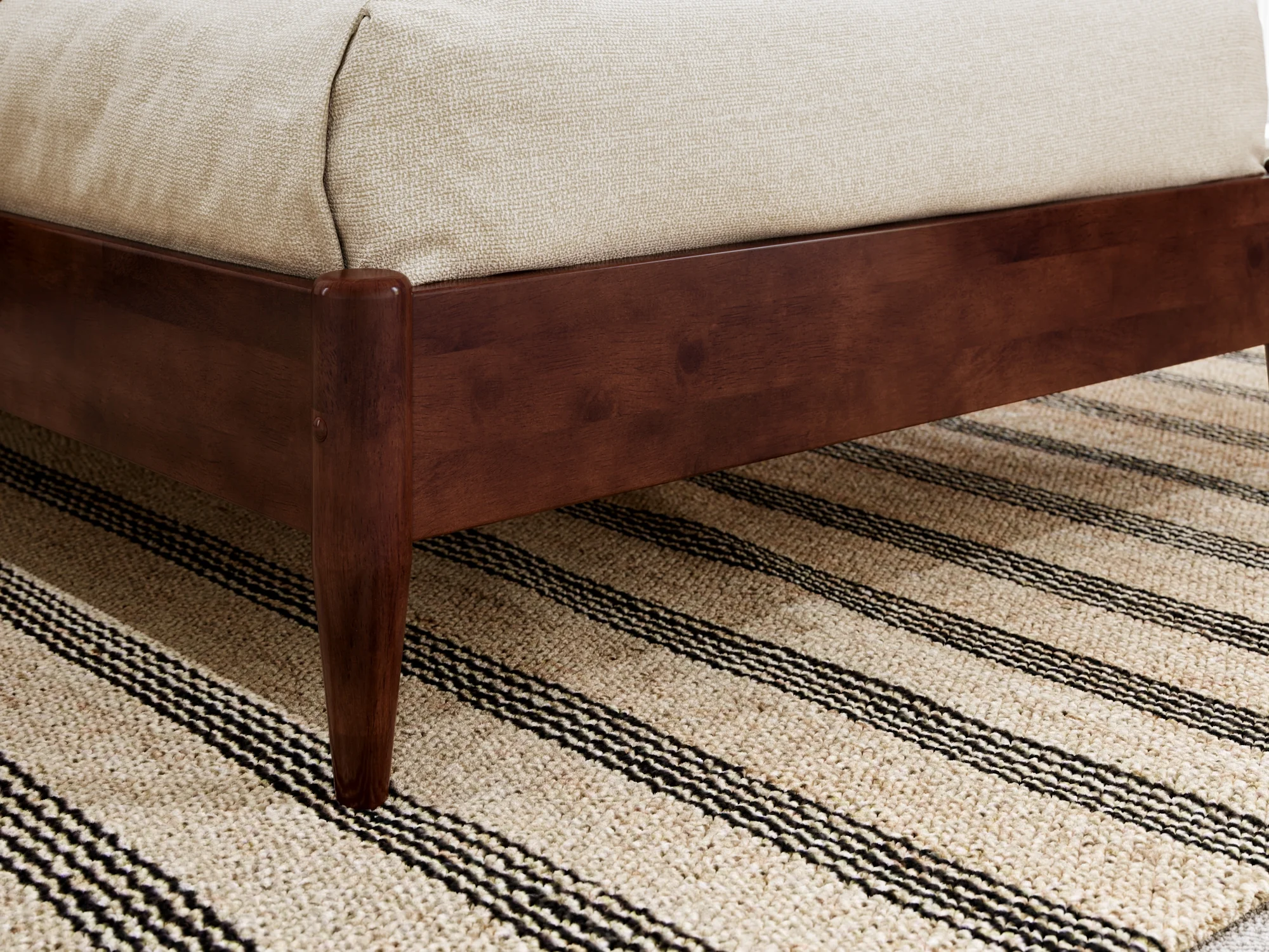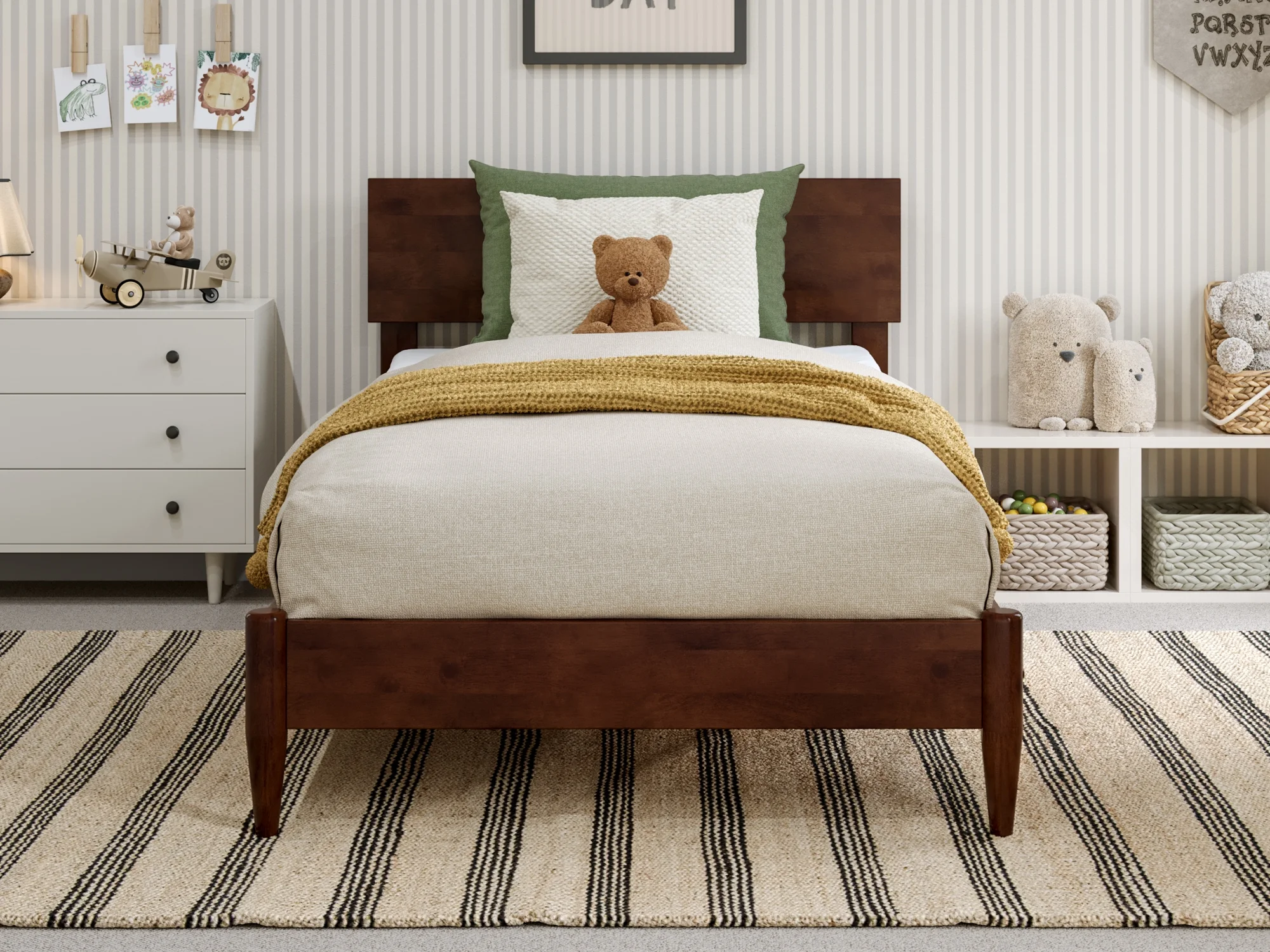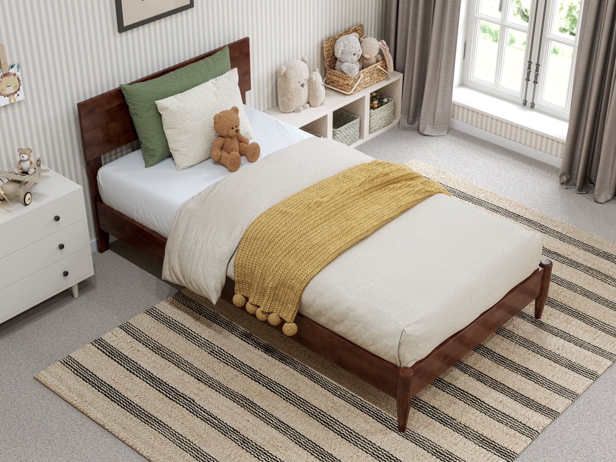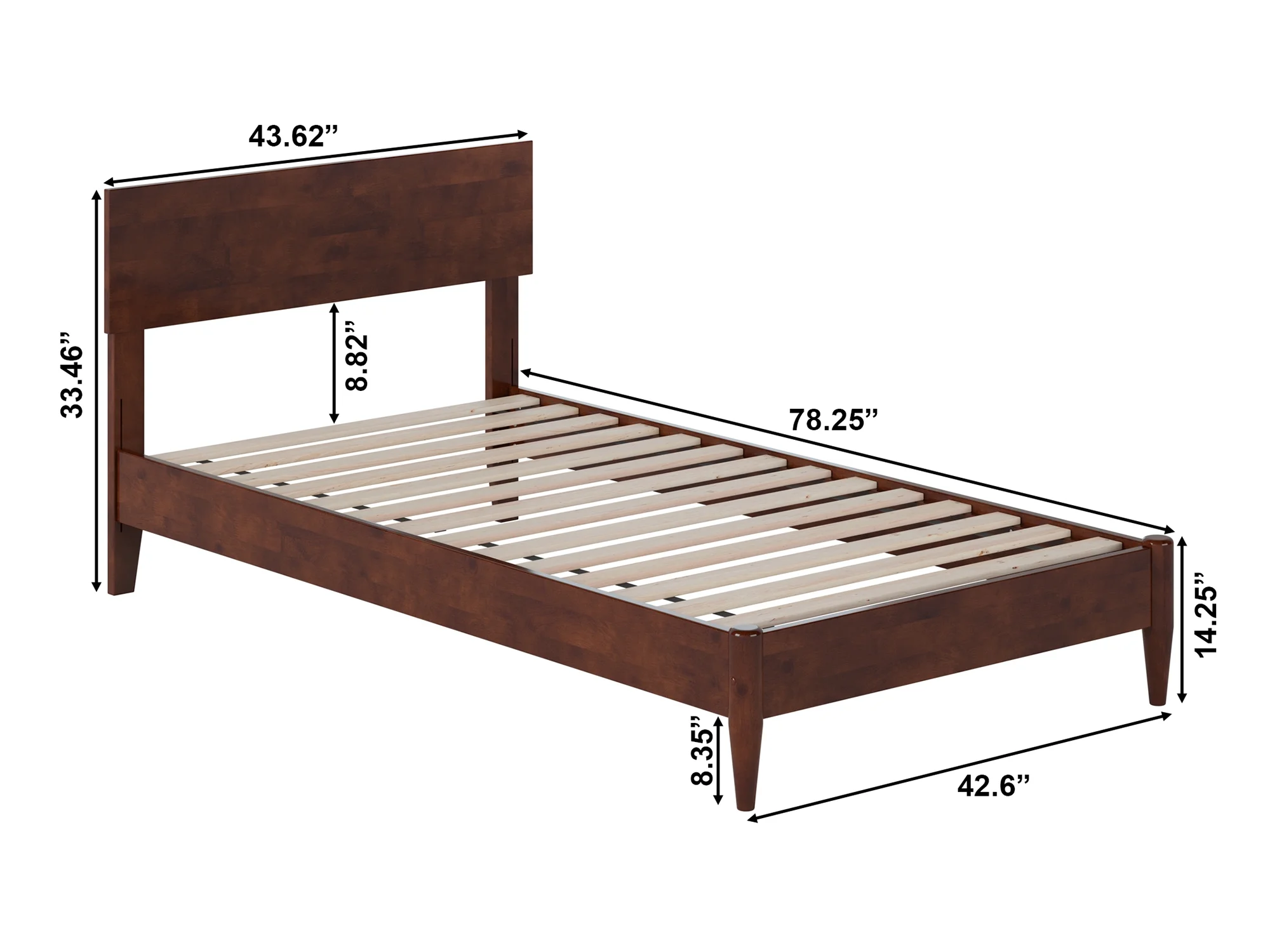 AFI Aria Twin Modern Solid Wood Low Profile Platform Bed, Walnut Designed to Last a Lifetime: Our sturdy, low-profile bed frame is expertly crafted from solid hardwood, guaranteeing long-lasting strength and durability Modern Design: The low wood panel headboard offers a clean and refined backdrop for your bedroom that adjusts up or down to accommodate a range of mattress heights No Box Spring Needed: Reliable and robust wood slats are designed to support and extend the life of your mattress without the need for a box spring or foundation Charging Station: Includes Surface Mount Turbo Charger, 6-foot cord, ETL listed, 18GA wire, 2 USB Ports .5V/3.5A Recommended Mattress Height: 8-12 inches Mattress not included Assembled Dimensions: L:78.25″ x W:43.62″ x H:33.46″ Weight Capacity: 600 lbs. Country Of Origin: Vietnam