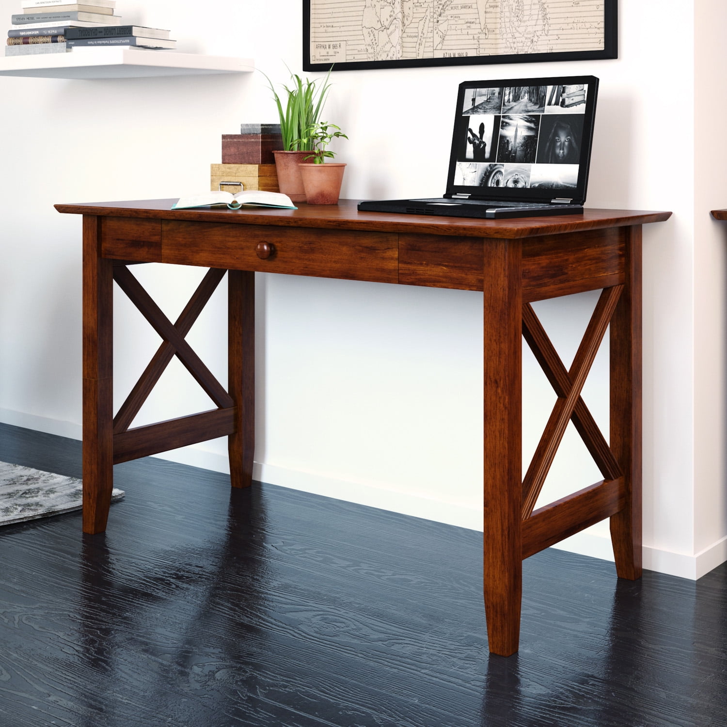 Home Office Must Have: Spacious desktop means you won’t need to pull up extra tables to get the space you deserve. This desk has enough room for multiple monitors, laptop, notebooks, files, décor and most importantly, your coffee High Quality Craftmanship: Solid Hardwood and Durable High Build Five Step Finish ensures longevity of the desk Features Spacious Storage Drawer: extra space for all of your work essentials Assembled Dimensions: 48”L x 24”W x 29.38”H