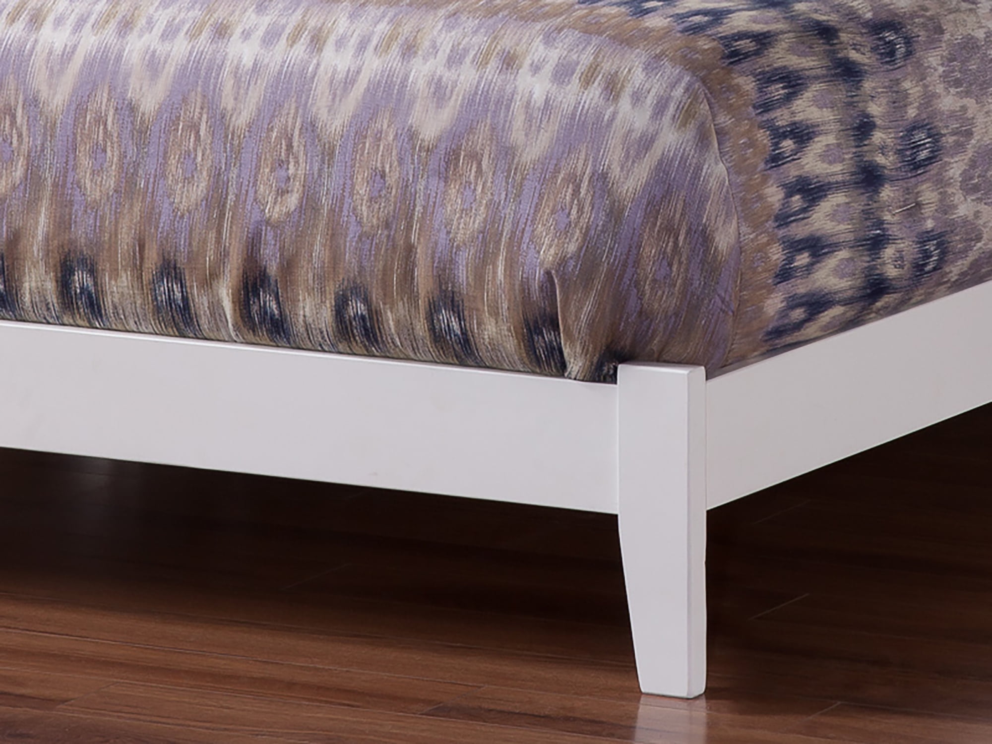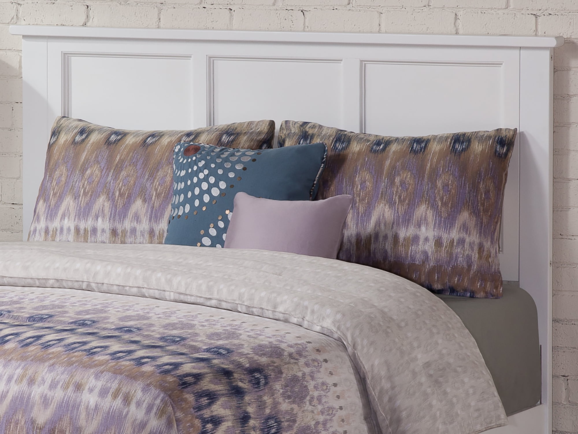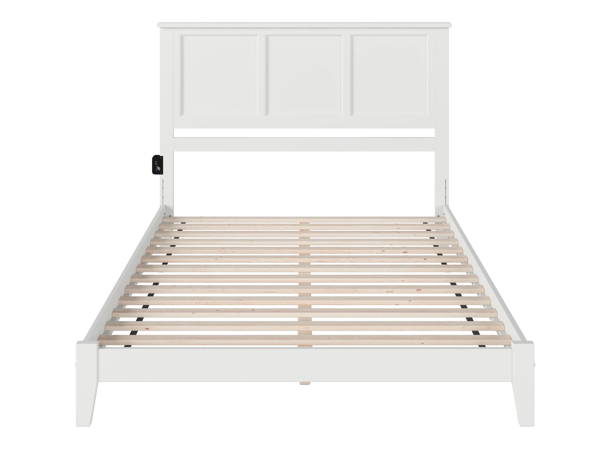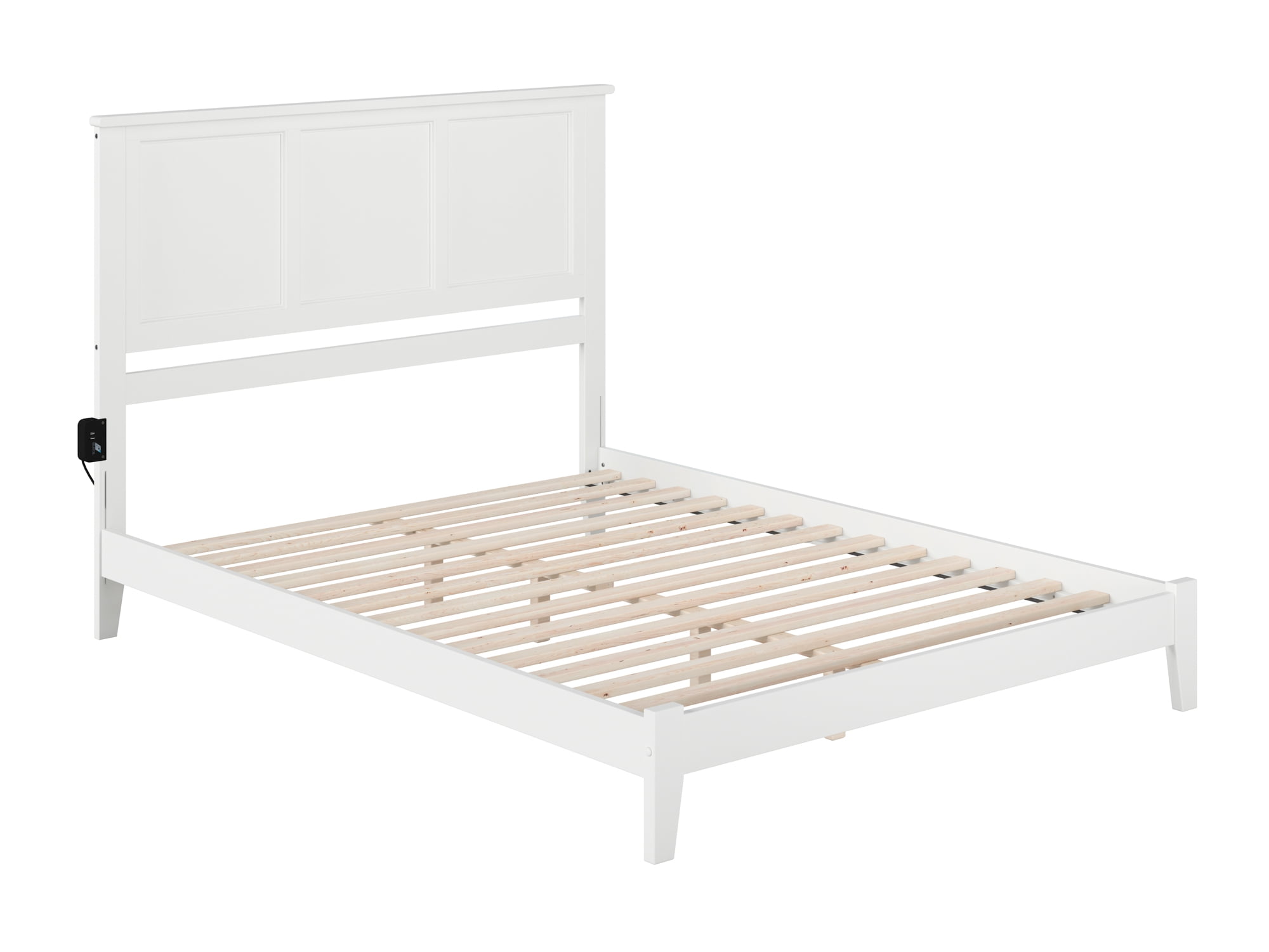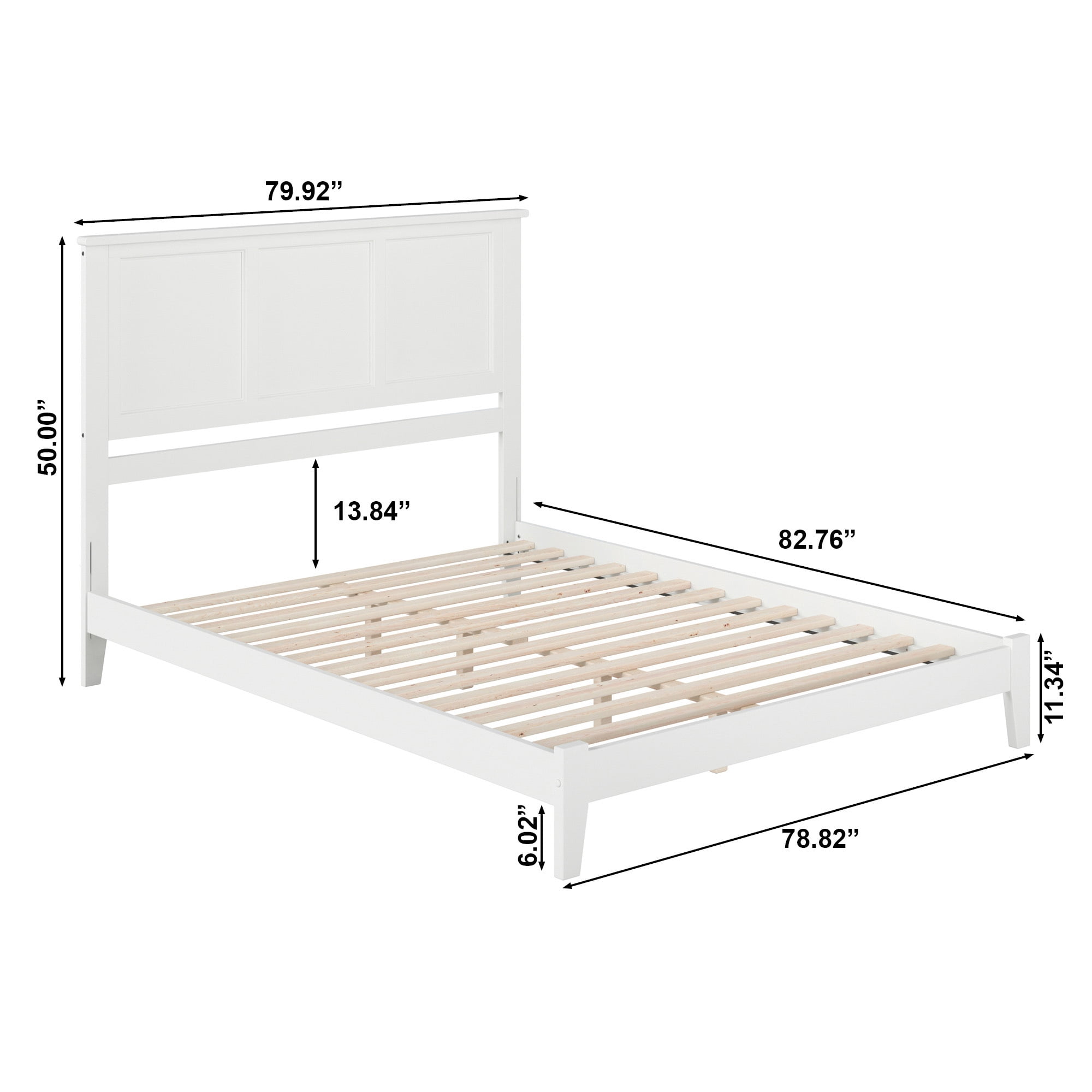AFI Madison King Low Profile Wood Platform Bed Frame with Panel Headboard in White Low Profile Bed frame crafted from Solid Hardwood and Veneer Recommended Mattress Height: 10″-14″ Traditional Headboard That Will Last A Lifetime: Sturdy, Solid Wood Construction features simple, traditional panel design that will complement any room. No Box Spring Needed: Designed for lasting durability, our slat kit supports your mattress to increase airflow for a more comfortable, cooler sleep. Charging Station: Includes Surface Mount Turbo Charger, 6-foot cord, ETL listed, 18GA wire, 2 USB Ports .5V/3.5A Weight Capacity: 800 lbs Assembled Dimensions: 82.76in L x 79.92in W x 50in H