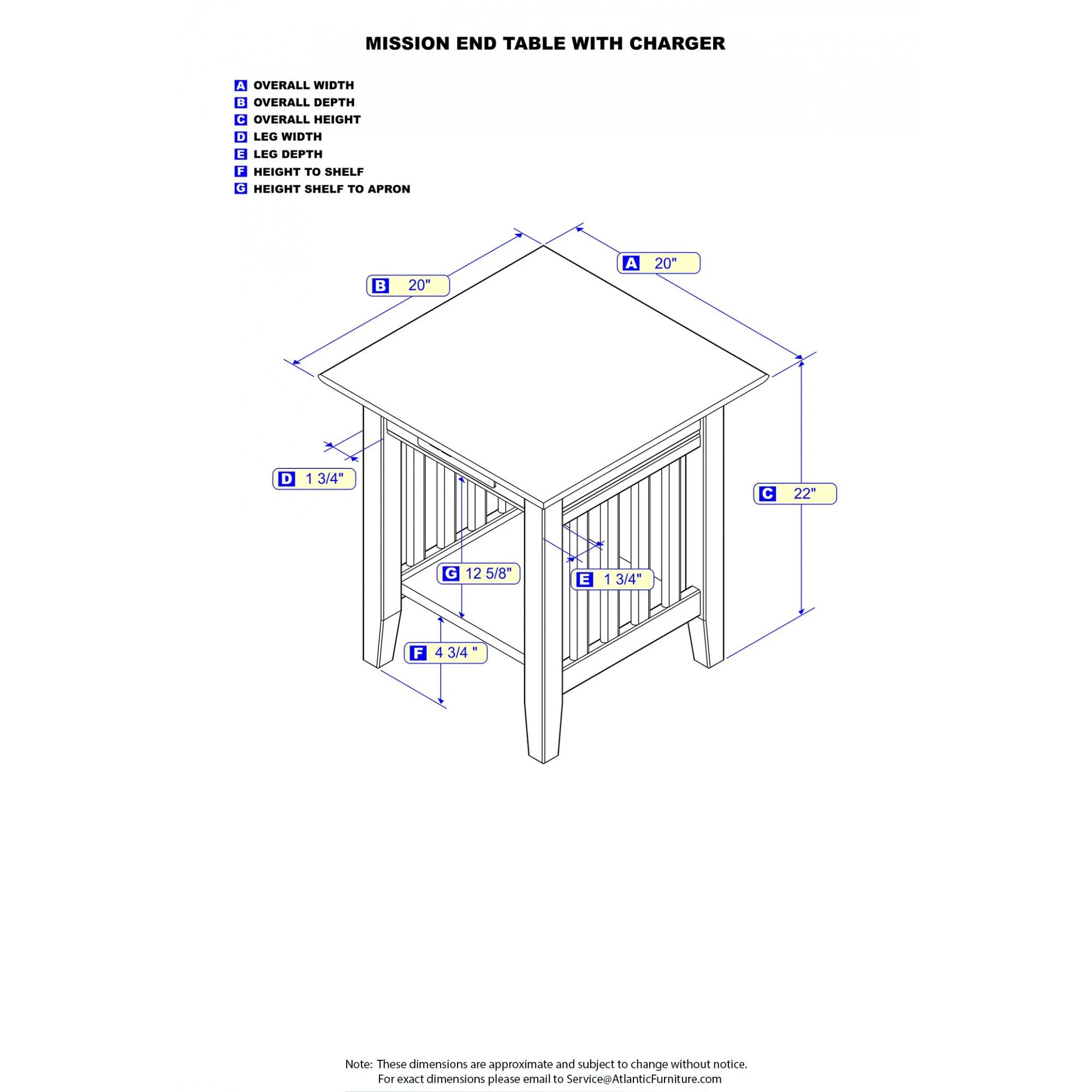 Compact and Multi-Use. Our End tables are a great addition to any home. Perfect for bedrooms, college dorms, living rooms or dens. The compact size allows it to fit ideally next to chairs or couches. High Quality Craftmanship: Solid Hardwood and Durable High Build Five Step Finish ensures longevity of the table Convenient Design: Allows you to have table space anywhere! Our Tables will blend in all types of rooms, whether it is traditional, contemporary, rustic or transitional. Charging Station: Added charging station means you will always have your most important devices charged and ready to help you conquer your day Ships in 1 Box Assembled Dimensions: 20”L x 20”W x 22”H