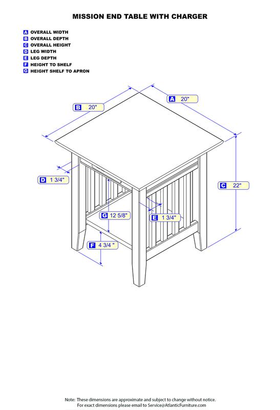 Compact and Multi-Use. Our End tables are a great addition to any home. Perfect for bedrooms, college dorms, living rooms or dens. The compact size allows it to fit ideally next to chairs or couches. High Quality Craftmanship: Solid Hardwood and Durable High Build Five Step Finish ensures longevity of the table Convenient Design: Allows you to have table space anywhere! Our Tables will blend in all types of rooms, whether it is traditional, contemporary, rustic or transitional. Charging Station: Added charging station means you will always have your most important devices charged and ready to help you conquer your day Ships in 1 Box Assembled Dimensions: 20”L x 20”W x 22”H
