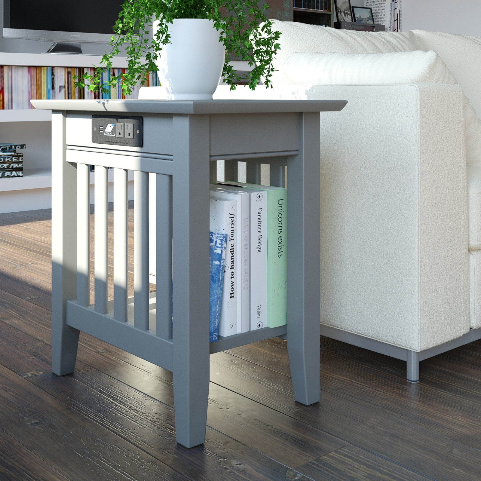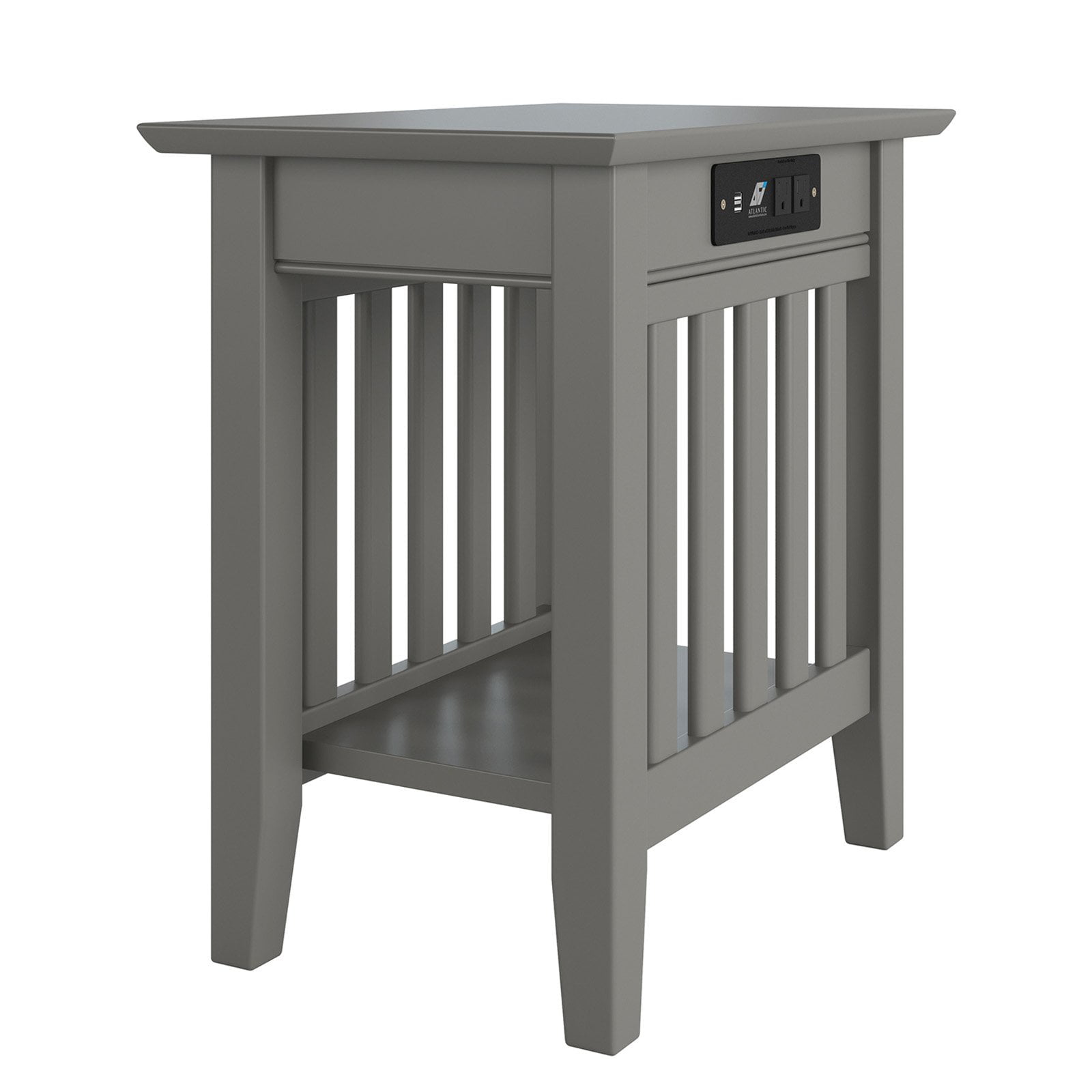 AFI Mission Solid Wood Side Table with Built-in Charging Station, Grey