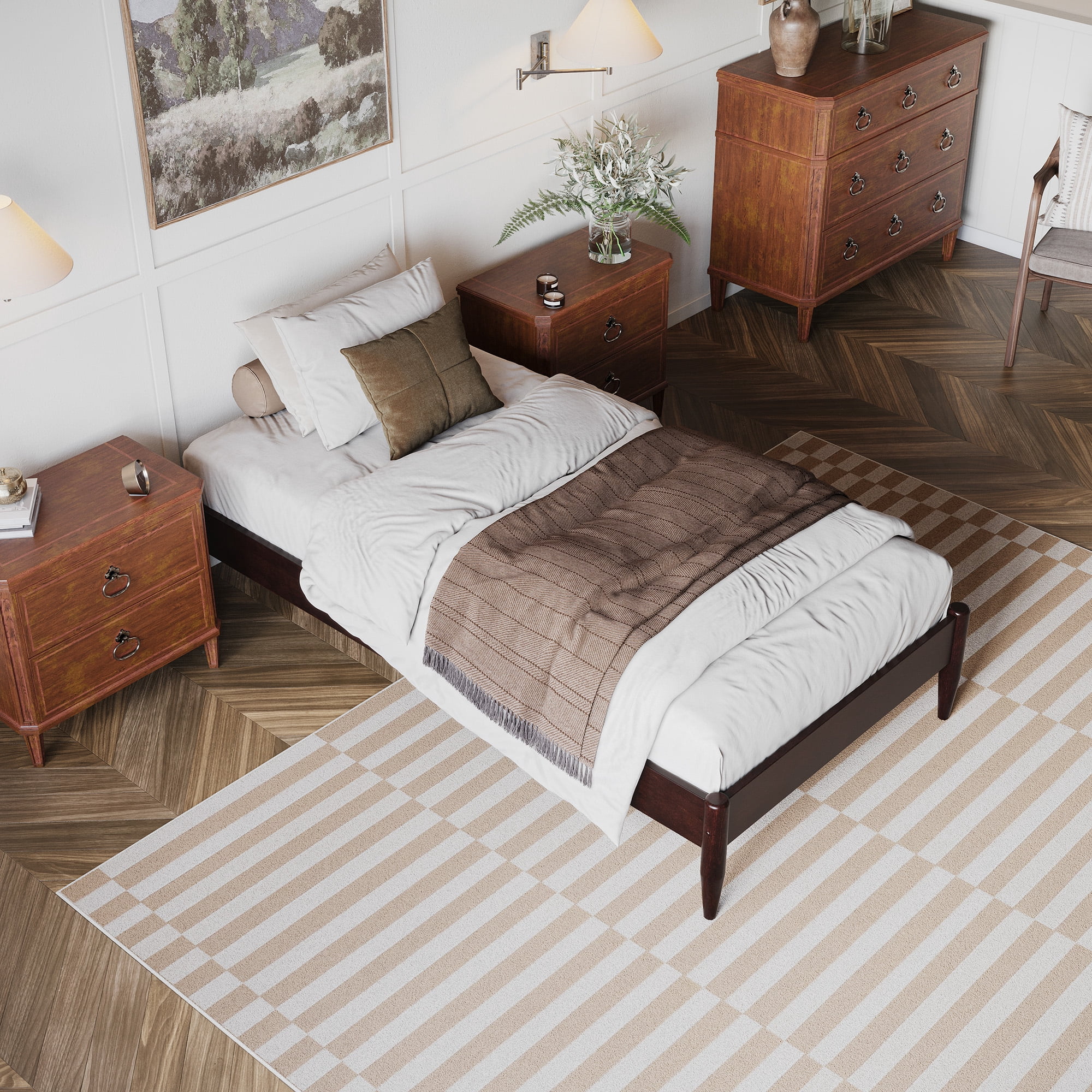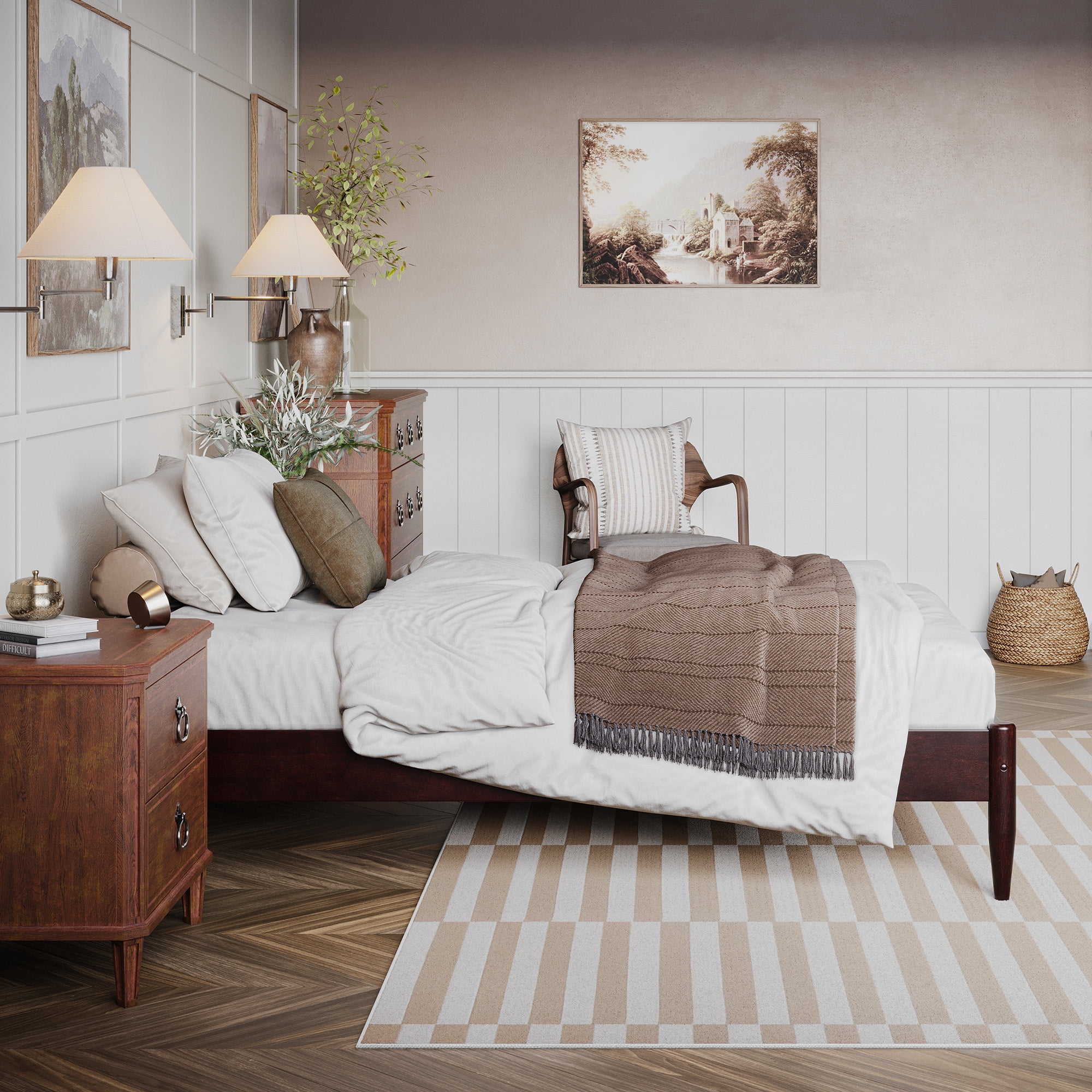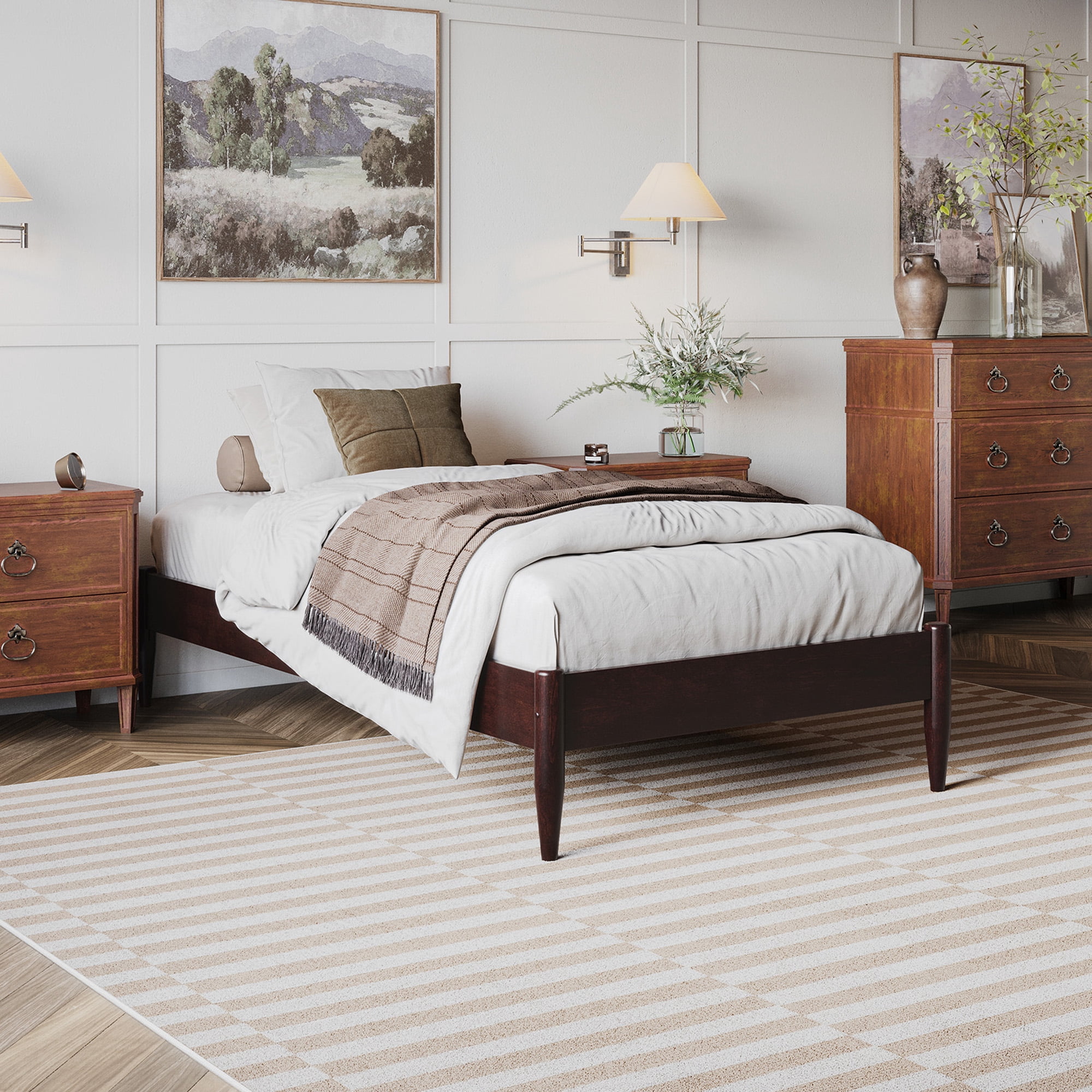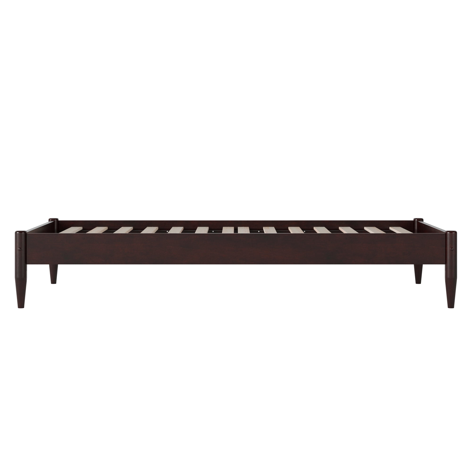 AFI Pasadena 12″ Espresso Solid Wood Low Profile Platform Bed, Twin XL No Box Spring Needed: Reliable and evenly spaced wood slats are designed to support and extend the life of your mattress without the need for a box spring Durable Design: Sturdy low profile frame is constructed with solid hardwood and a clean low-VOC finish for longevity Ample Underbed Storage: Provides 12 inches of total height, including 6.02 inches of space beneath the bed, perfect for storing odds and ends. No Mattress Height Restriction: This bed accommodates a wide range of mattress heights and thicknesses. Easy-to-Assemble: All parts, tools, and instructions conveniently arrive in 1 box Assembled Dimensions: L:84.4″ x W:42.6″ x H:12.44″ Weight Capacity: 600 lbs