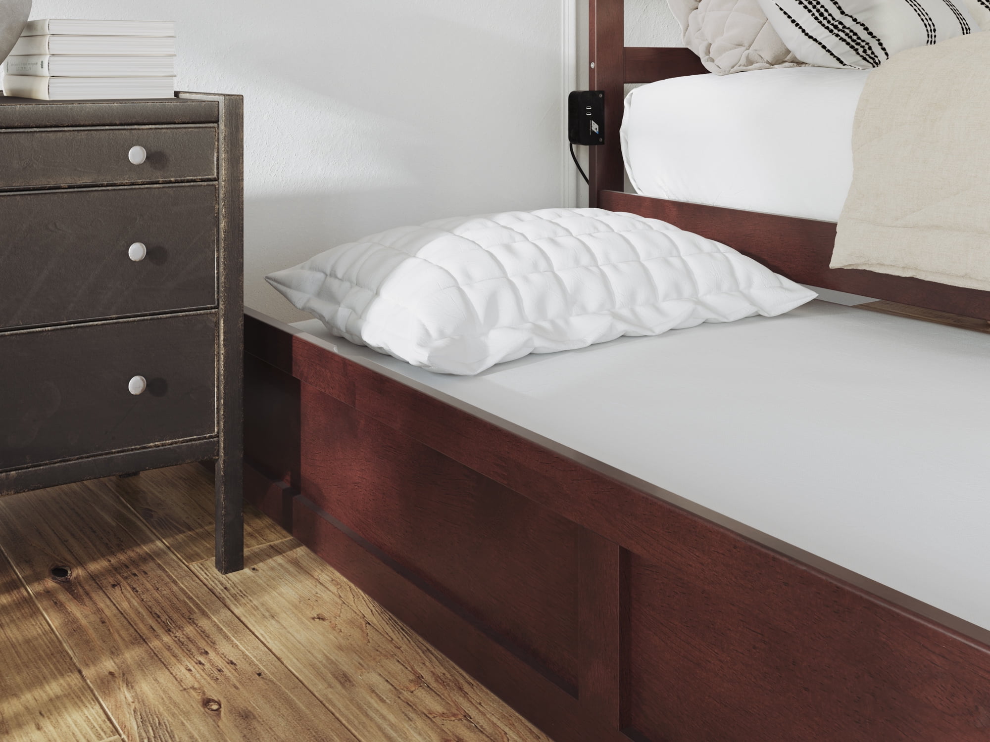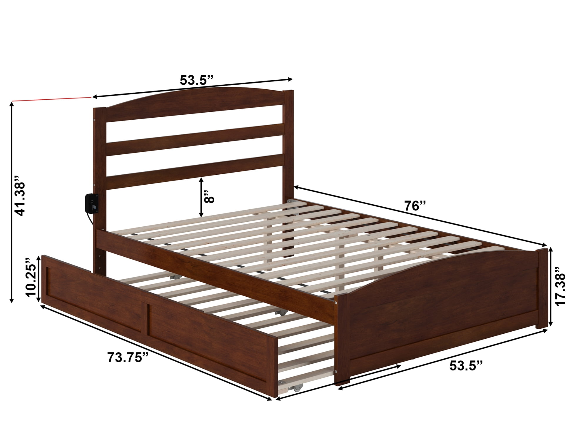 AFI Warren Full Wood Platform Bed with Headboard, Footboard & Twin Trundle in Walnut Minimalist Mission Inspired Design: Sturdy, Solid Wood Construction features simple, mission inspired design that will complement any room. Bed & Trundle feature Solid hardwood and Veneers with a clean Finish: Trundle can accept a mattress height of up to 7″, rolls easily on wheels and can be positioned on either side of the bed. No Box Spring Needed: Designed for lasting durability, our slat kit supports your mattress to increase airflow for a more comfortable, cooler sleep. Charging Station: Includes Surface Mount Turbo Charger, 6-foot cord, ETL listed, 18GA wire, 2 USB Ports .5V/3.5A Assembled Dimensions: 76″L x 53.38″W x 41.38″H Weight Capacity: 800lbs