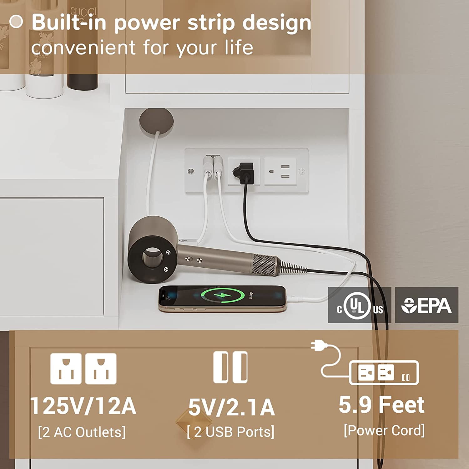 This makeup vanity features a charging station, includes 2 standard plug sockets and 2 USB ports, which can be more convenient to connect your hair dryer, curling iron, and it can also charge your phone, tablet or other mobile devices, The unique design is more convenient for you to use. The vanity table is equipped with a large mirror and 10 LED bulbs with 3 color modes(warm yellow, warm white and cool white) to provide you with super-bright lighting, so you can experience the star-like makeup treatment, can more clearly and realistically reflect your appearance, These glam bulbs create the perfect lighting for applying makeup and hairstyling. Are you still bothered by the fact that you have too many cosmetics and nowhere to put them? Try this makeup table with great storage function, containing 5 drawers, 3 open shelves, 3-layer hidden storage shelves with glass door, all your cosmetics and makeup tools can be sorted and stored neatly to the vanity table. Let you say goodbye to messy storage. It will be a great choice for you. The lighted makeup vanity is designed with a bedside table on the right side,Vanity and Nightstand 2 in 1 Design save space for you. In addition, there is a hidden storage shelf with glass door on the side, which is not only beautiful but also practical. There is sufficient space to store your various cosmetic will be an ideal choice for your girl as a gift for Valentine’s Day, Mother’s Day or Christmas. Made of Environmental Particle Board, coupled with solid metal legs, the vanity set has a long service life. Detailed and easy-to-follow assembly instructions are included to make sure the vanity desk is put up together fast and correctly.