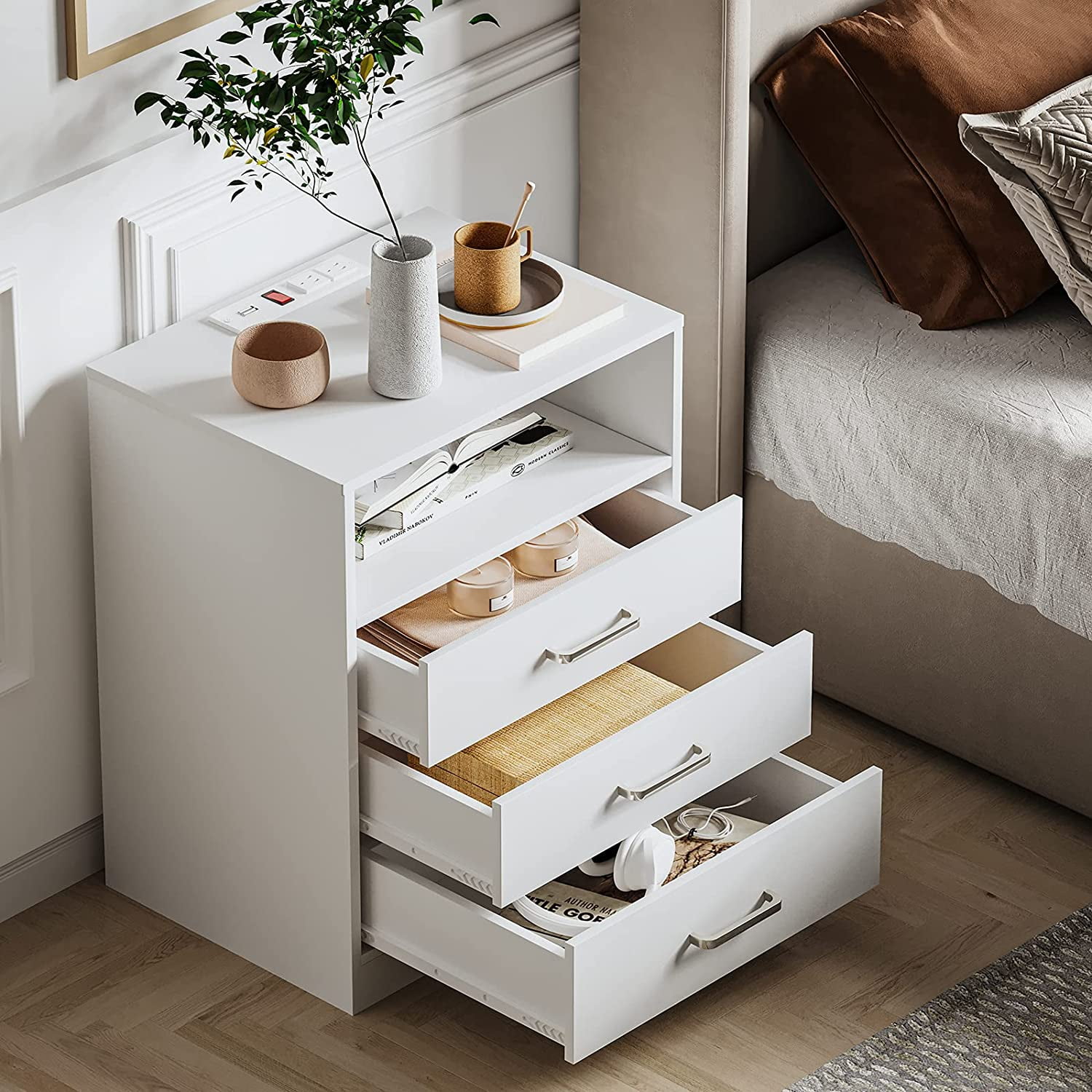 white nightstand 3 drawers with open storage bedroom furniture end table side table wooden sofa side stand cabinet, with a sliding drawer.