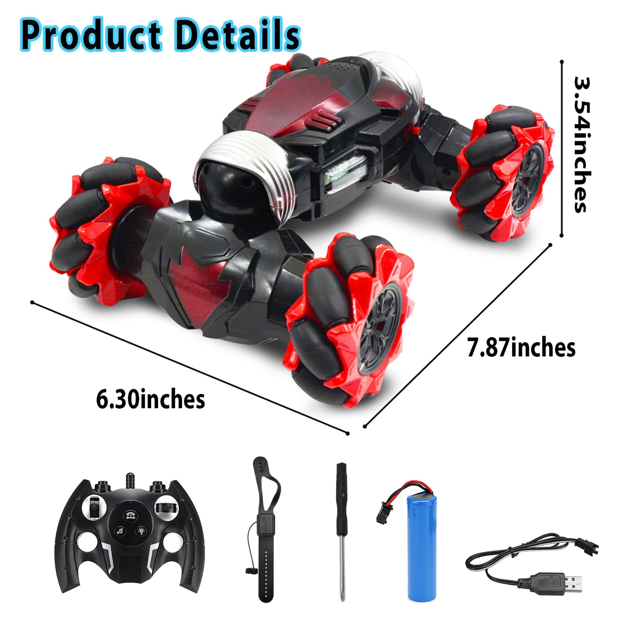 Features: Specification Material: ABS Remote Control Frequency: 2.4GHz Running time:35-40min Speed: 40km/h Battery for Car: 3.7V Li-ion Battery (Included) Controller Battery: 2* 1.5V AA Color: Red Total Length: 14.6inch Package Included 1 x RC Car with Built-in Rechargeable Battery Pack 1 x Watch Remote Control Battery 1 x 2.4G Remote Control 1 x Gesture Sensor Watch Remote 1 x USB Charging Cable 1 x Manual