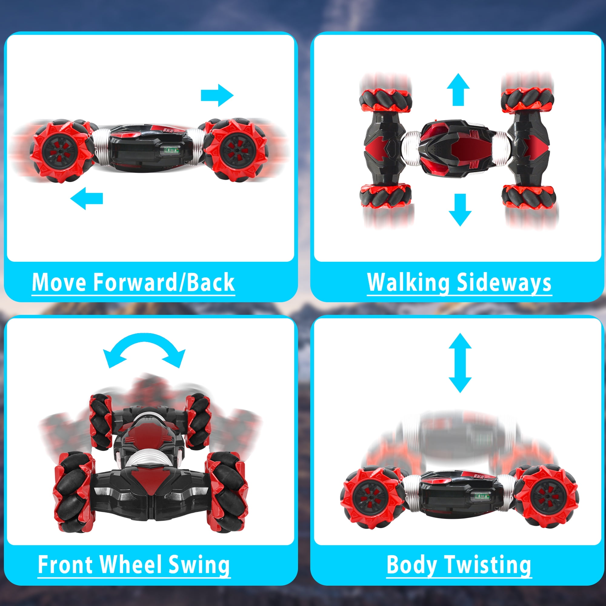 TWO CONTROL MODES :Move your arm or twist your wrist, you can use these gestures to control the car through this watch. The novel control mode will definitely bring you an unprecedented experience ALL-ROUND DRIFT :This car use Mecanum wheels, which can drift in all aspects. Not only can 360°rotation,but also walk sideways with special deformation function,and twist into different deformations.The flexibility and cool speed will absolutely surprise you,bring a variety of rotation-changing stunts to your child TWO MODES OF TRANSFORMATION : The car has two modes: On flat ground you can use on-road mode and on rough roads you can use off-road mode.The powerful motor and four-wheel drive design provide power to the car, enabling it to overcome various difficult terrains, bringing you an excellent outdoor racing experience INTERFERENCE-FREE REMOTE CONTROL : The car has a wireless control system which runs with a 2.4GHz frequency. What means that it can offer a stable signal and it has an anti-jammingh function which without remote confusion though two or more vehicle racing together DAZZLING COLORFUL LIGHTING EFFECTS : The lights of multiple colors are constantly changing and flickering, presenting a dazzling and cool visual effect at night, and the lights also play a role in lighting.Giving players a better night playing experience. “