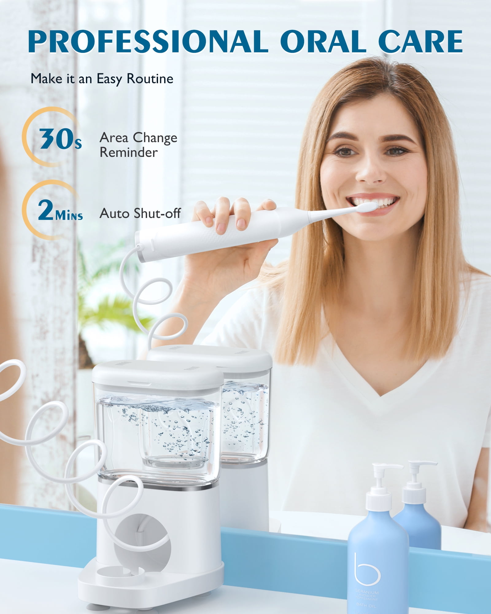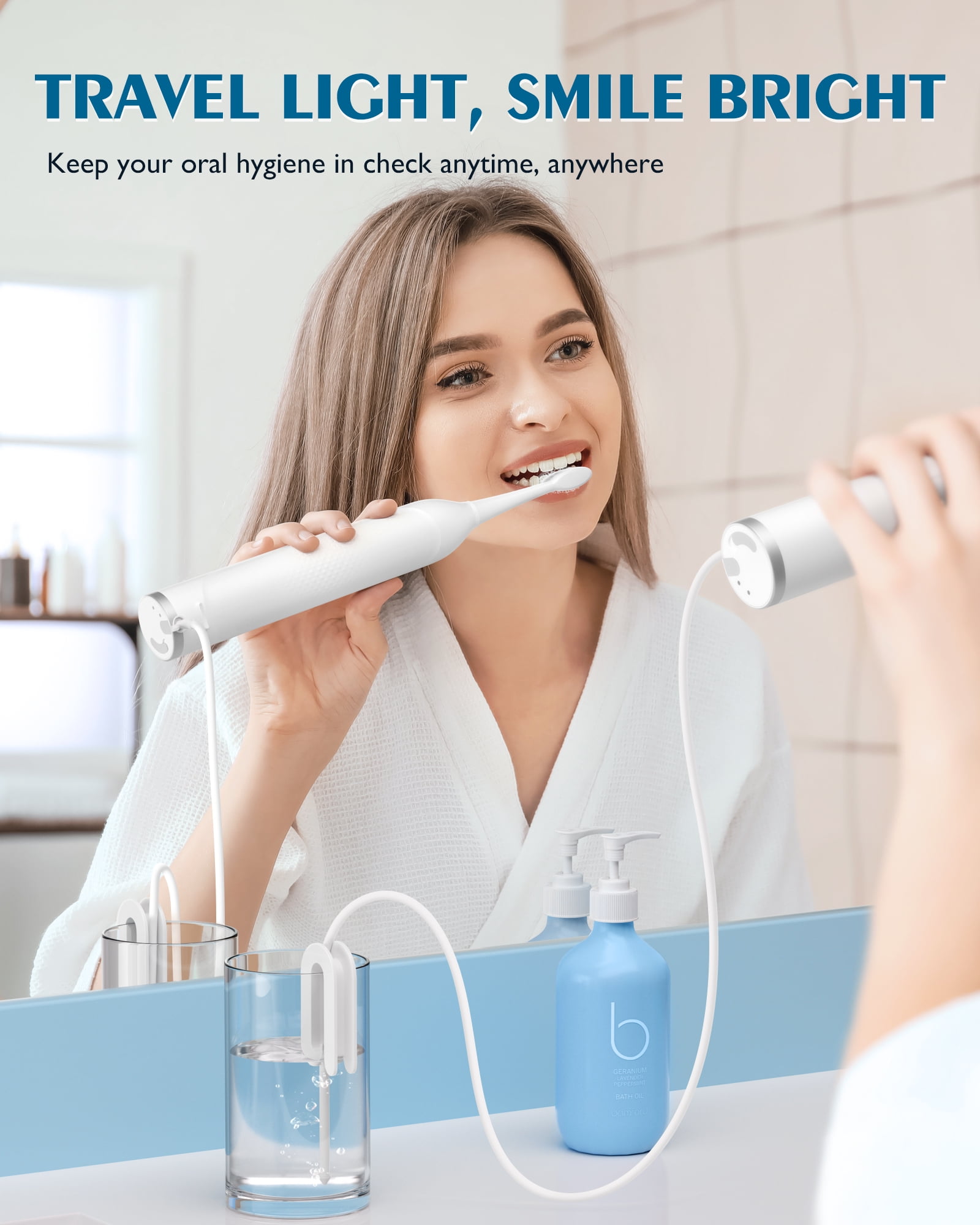 Important Notes: 1. Avoid charging the device with wet hands. 2. Keep the device away from water or any other liquids to prevent damage. 3. This device is not suitable for children under 8 years old. 4. Beginners using the water flosser should start with the lowest setting and gradually increase to higher settings. 5. If you experience bleeding gums when using the water flosser for the first time, it may indicate gum inflammation. After using the water flosser for a week, you should notice a significant improvement in gum bleeding. Consistently using the device will effectively enhance gum health. 【Flossing & Brushing in One Step】Enables 3 modes of brush, floss, or brush+floss with a switch button. Makes it easy to water floss each day while brushing your teeth with one convenient device. Proven to be 2X more effective than manual brushing and flossing. As we age and dental bills grow, it’s time to take our oral care routine to the next level. AGPTEK provides one stop shop for getting maximum clean on your teeth. 【Personalized Oral Care with 5 Variable Settings】Offers 5 variable flossing pressures and 5 brushing speeds, from gentle massage to powerful cleaning. Solve different oral problems for family members with braces, periodontal pockets, and sensitive gums. Effectively removes plaque with the 31,200 BPM sonic electric toothbrush. 110 PSI water flosser deeply cleans between teeth and below the gum line with a strong jet stream. Memory function retains your last used mode, no need to adjust it next time. 【Travel Water Flosser with Long Battery Life】Up to 14 days of extended use with a single charge! No need to charge it every day after use, nor worry about it running out of battery when you’re in a hurry to catch a flight or get to work. Power handle can be detached from the base for BRUSH+FLOSS on the go. Make your smiles more confident when meeting new friends and clients. Always be ready to go with AGPTEK. 【17oz Removable Resevoir & 2-Minute Timer】17oz/500ml water tank saves you the trouble of frequent refills while brushing. 2-minute brushing timer pauses every 30 seconds, reminding you to move to the next area for a thorough clean. Straightforward to operate and integrate into your daily routine. Simply open it and finish your oral care in 2 minutes, no need to download a brush timer app or set multiple alarms. 【Waterproof & Leak-proof】IPX7 waterproof rating ensures safety use if you like to brush your teeth in the shower. The specific holder secures the water hose, preventing any water leaks and keeping your counter clean. The wireless charging base with a USB-C port keeps your device charged and ready to use at all times.
