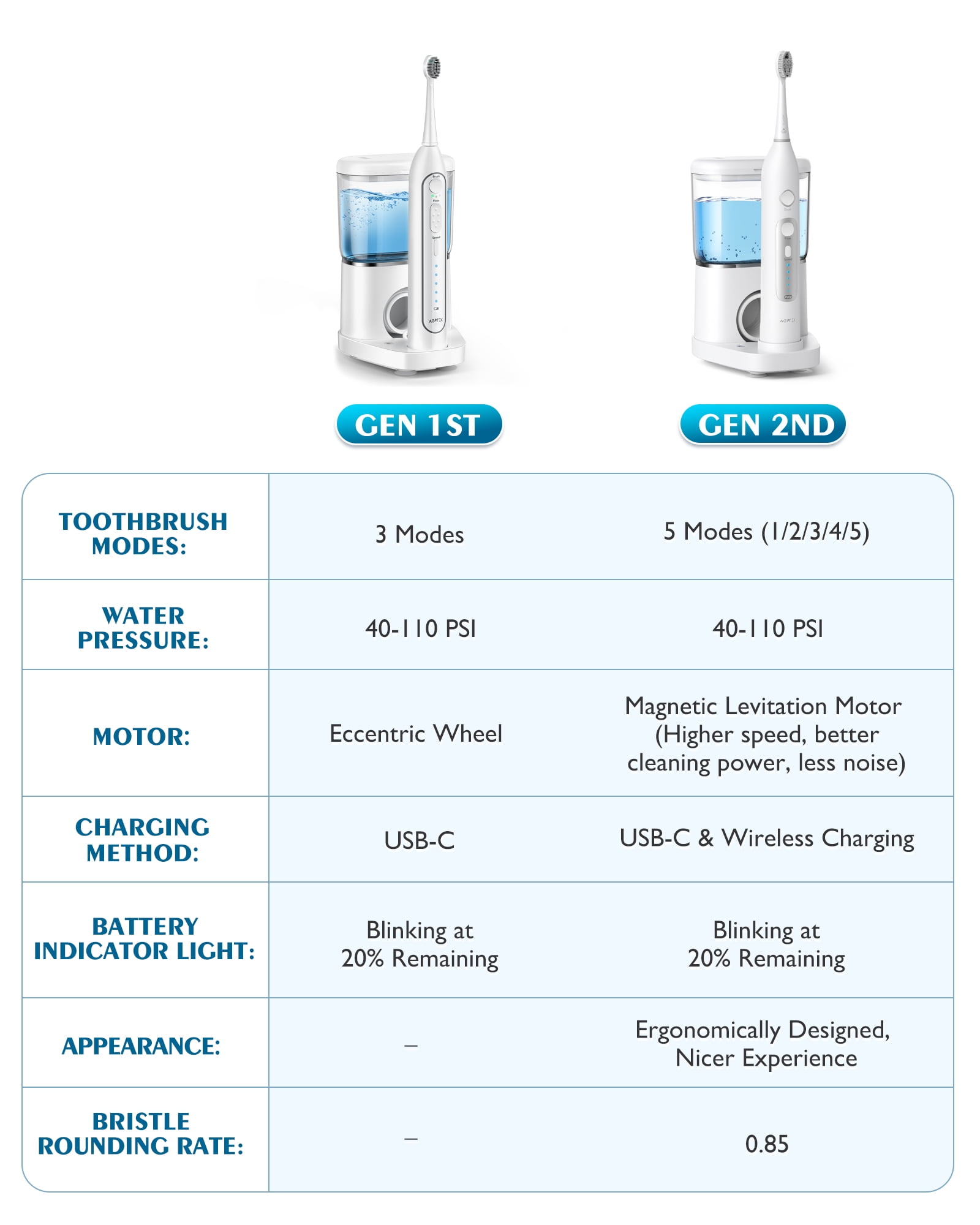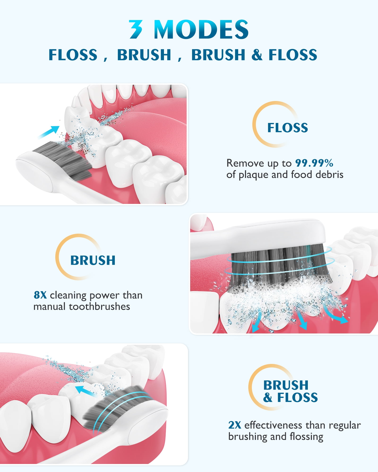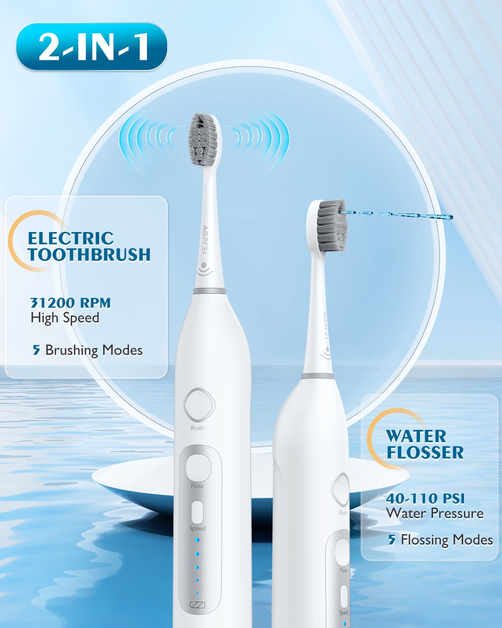 √ Multifunctional 3 Modes: Combines an electric toothbrush, water flosser, and simultaneous brushing & flossing. No need to change brush heads for different modes. Forget those various interdental brush and floss pick. With the same effect, why not just pick an all-in-one device? Save yourself the trouble and space with this comprehensive solution. √ Upgraded Sonic Toothbrush: Sonic tech achieves more powerful cleaning with reduced teeth damage and quieter operation. Experience the refreshing sensation of truly clean teeth without disturbing your family, even when getting ready for bed late. √ Powerful Water Flosser: Easily hit hard-to-reach spots and flush food debris out. Studies shown that water flosser does improve periodontal pocket health and reduce gum pocket depth. Ideal for people with braces, dental implants, bridges, or large gaps between teeth. √ Leakproof Holder Base: Designed with a silicone holder to secure the hose tip, preventing countertop leaks. Note: Insert the hose into the silicone holder or handle when the tank contains water to prevent any leaks. √ 4 Replaceable Brush Heads: Conveniently store the brush heads in the water tank lid for both home and on-the-go use. No need to rummage around when replacement is needed. √ Portable Oral Irrigator: Detachable power handle allows you to brush and floss on the go. With AGPTEK, you can stay prepared and ready to go, ensuring your oral health remains a top priority no matter where life takes you. Warning: 1. Patients with oral diseases should consult a dentist before using this product. 2. Remove any invisible braces before use. 3. Do not use this product if the power cord, plug, or device is damaged or not functioning properly. 4. Do not use this product if you have open wounds on your tongue or in your mouth. 5. Avoid using the water flosser to rinse the area under the tongue, ears, nose, or other sensitive areas. 6. Do not apply excessive pressure to the nozzle during use. 7. Do not use mouthwash or rinsing solutions that contain iodine, bleach, or tea tree oil. 8. Do not attempt to repair the product yourself. If there are any quality issues, please contact AGPTEK. Specifications: Model: ABB889 Colors: Black/White Toothbrush Modes: 5 speeds (from lowest to highest) Flossing Modes: 5 water pressures (from lowest to highest) Waterproof Rating: IPX7 Usage Time: 5th gear: 42 minutes (Highest speed) 4th gear: 45 minutes 3rd gear: 48 minutes 2nd gear: 51 minutes 1st gear: 55 minutes (Lowest speed) Water Pressure for Flossing: 5th gear: 110PSI (Highest pressure) 4th gear: 85PSI 3rd gear: 70PSI 2nd gear: 55PSI 1st gear: 40PSI (Lowest pressure) Water Tank Capacity: 500ml Charging Time: 5-6 hours Standby Time: 90 days Default Timer: 2 minutes with a 30-second interval reminder (pause briefly) Brush Vibration Frequency: Max. speed of 31200 strokes per minute Charging Method: USB-C & Contact Charging Memory Function: Yes Water Outlet Diameter: 0.65mm Bristle Roundness Rate: 85% Splash Function Support: Yes Battery: Lithium, 1100mAh Battery Voltage: 3.7V What’s in the Box 1 * 2-in-1 Water Flossing Toothbrush 4 * Brush Head 1 * Water Hose 1 * Manua