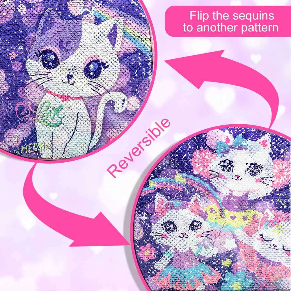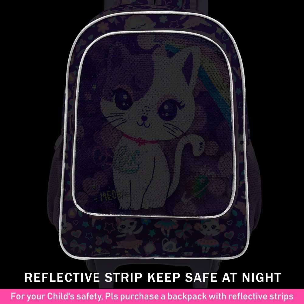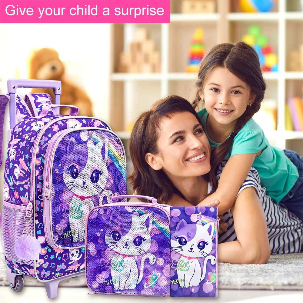AGSDON 4PCS Rolling Backpack for Girls, Kids Cat Sequin Wheeled Bookbag, Travel Roller School Bag with Wheels