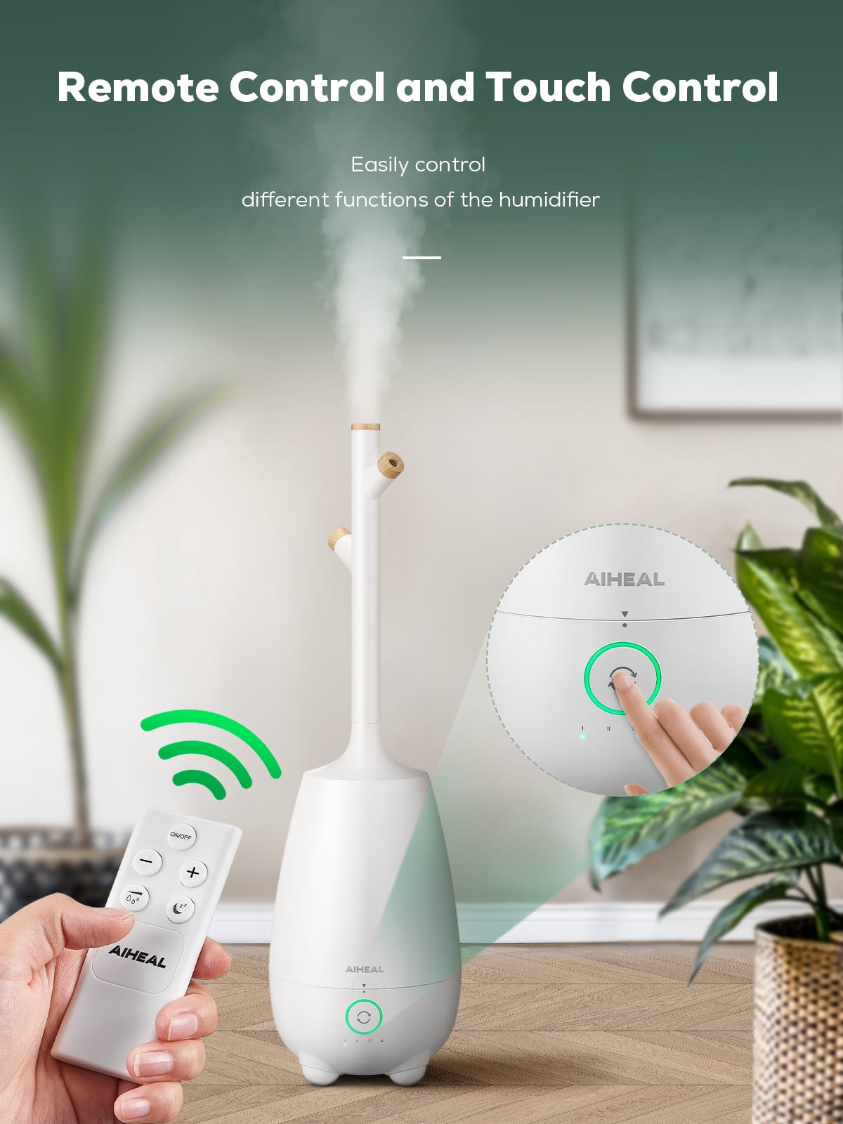 【Wide Coverage Area up to 350 sq ft and High Mist】The unique design of three mist outlets makes the Aiheal humidifier spread the cold mist more widely. You can choose to open or close two side mist outlets to meet different needs. But the mist outlet in the middle is non-adjust able, and cannot be closed. The tall of the humidifier is 27.87 inches and has a high mist output level, so you don’t have to worry about wetting the table or floor. 【Constant Humidity & Aromatherapy】Turn on the constant humidity mode, the air humidifier will automatically adjust the mist output to keep the room humidity at 50%-70% RH. Add your favorite aromatherapy oil to thehumidifier’s essential oil tray, and the fragrance will be diffused into the room along with the cold mist. It will bring you an environment with comfortable humidity and fragrance, and bring you a good mood. 【Touch Control and Remote Control】The room humidifier for large room is easy to operate, with only one touch button, that can be controlled by gentle touch. The humidifier also comes with a remote control that can be used up to 4-5 meters. You don’t have to move your body, the remote control allows you to easily control the operation of the humidifier when you need it. 【Quiet Operation and Sleep Mode】The ultrasonic humidifier runs as quietly as a whisper. When the sleep mode is turned on, the mist output will remain at level 1, and the lights of the light ring go off. Aiheal humidifier will not disturb your sleep or work, making it ideal for use in bedrooms, baby rooms, offices, living rooms, rooms with plants, etc. 【Top Fill and Detachable Water Tank】The large capacity water tank of 5L/1.32 gal can keep the floor humidifier running for up to 25 hours. The top fill design allows you to easily refill the water by opening the lid. At the same time, the detachable water tank with a handle allows you to take it to other places for filling. Aiheal humidifier for bedroom frees you from frequent refilling and the inconvenience of refills. 【Quick Assembly Tips】It is simple to fasten the water tank back to the base. You need to align the side printed with the logo with the side where the control button is, and then place the water tank.