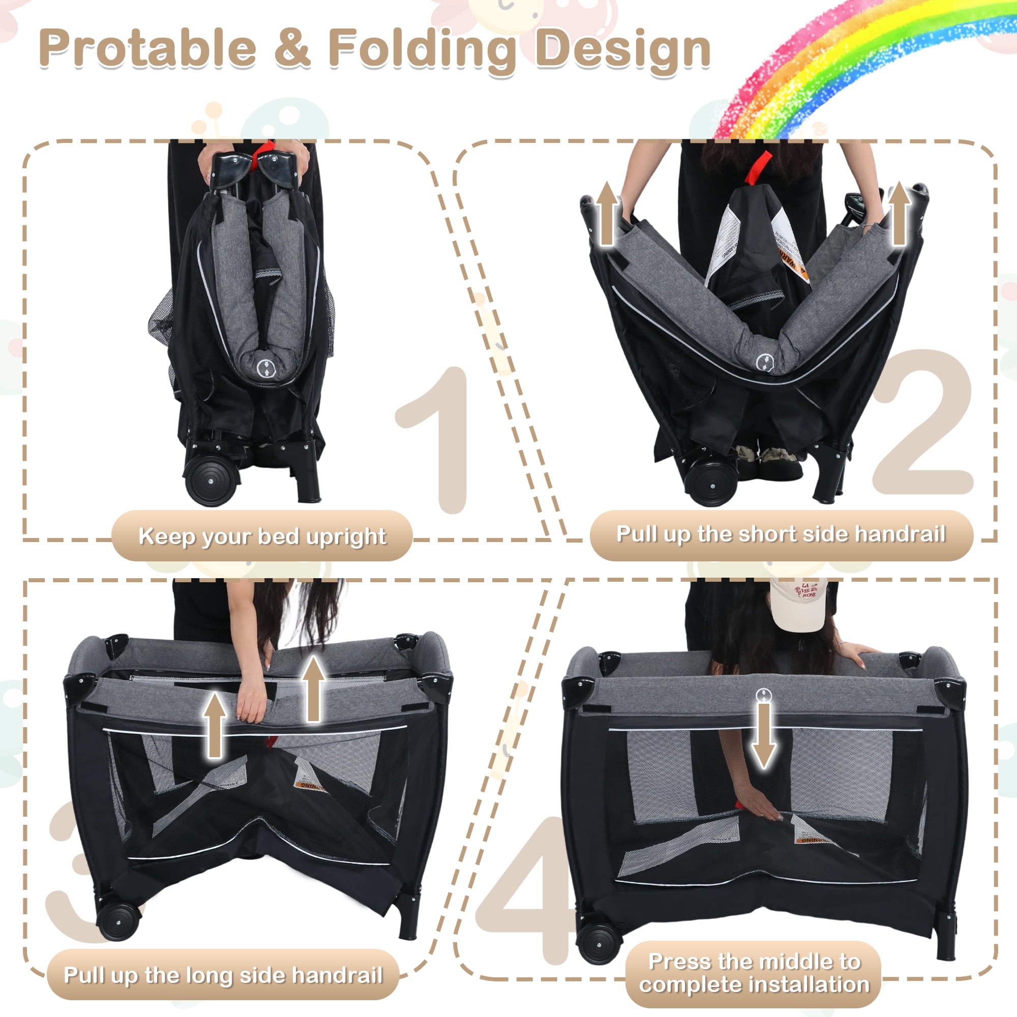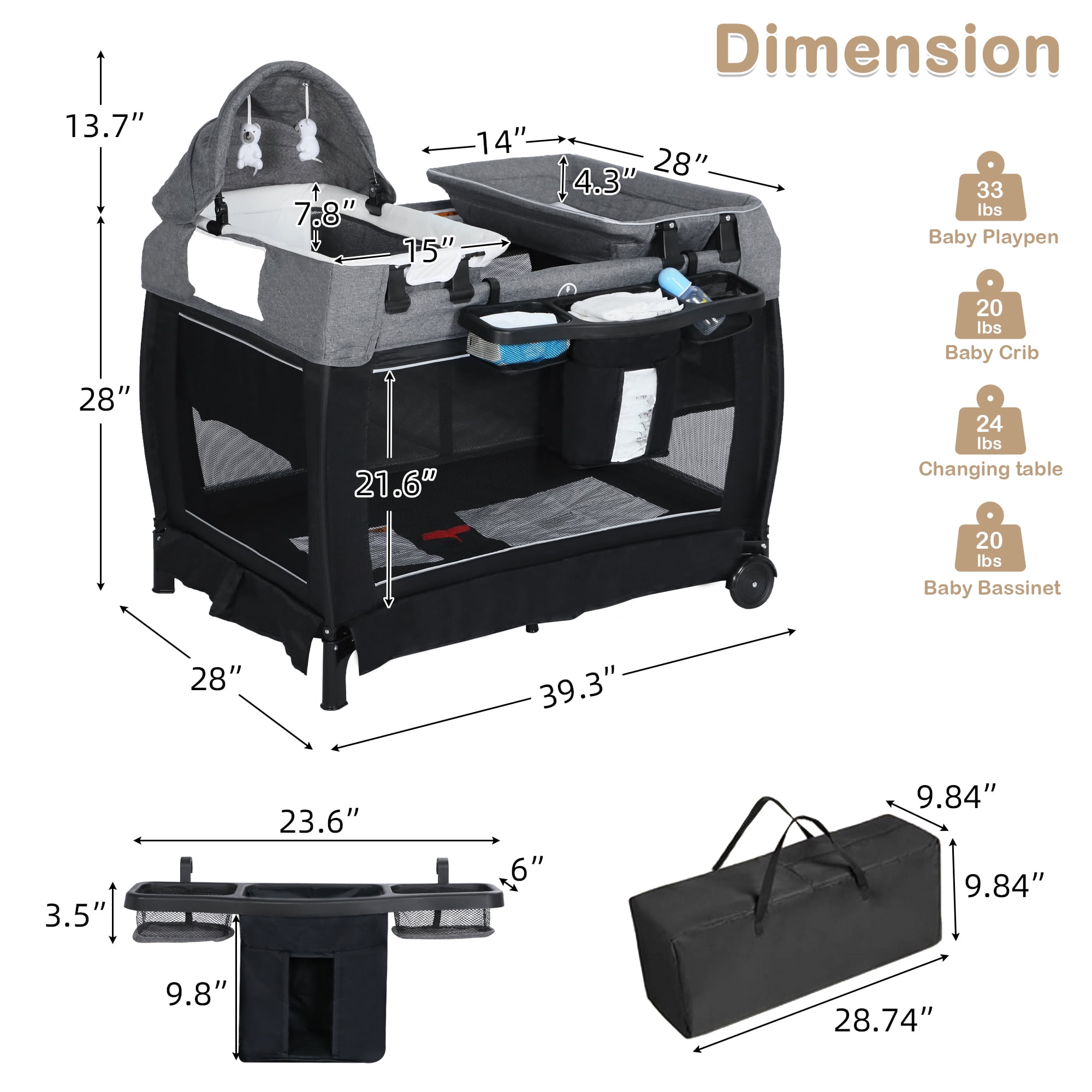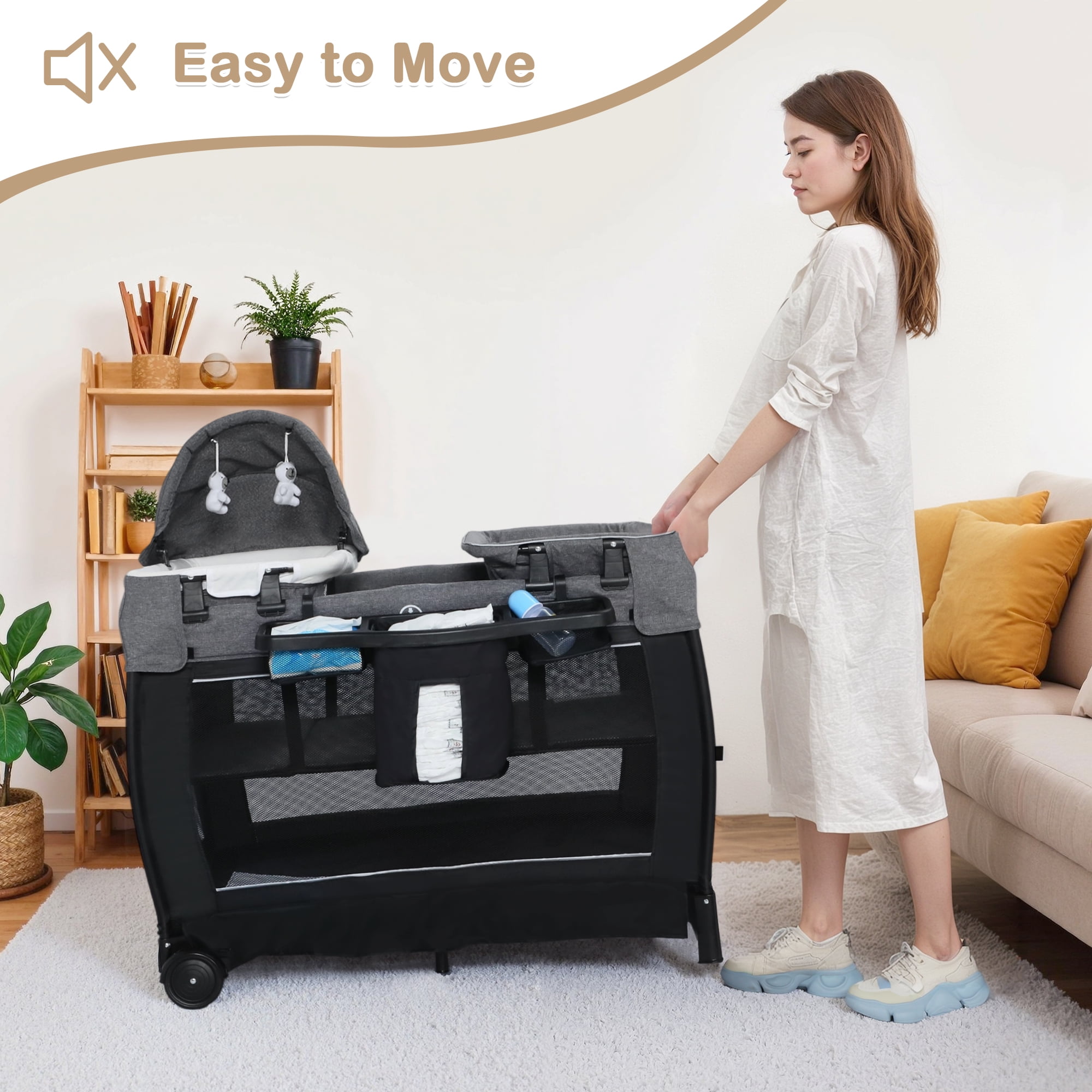 Newborn bassinet with hanging toys for comfortable sleep anywhere Baby playard mode for climbing and walking for toddlers Changing table for easy diaper changes without bending over The sleeping surface incline angle at 7° and are under the ten degree cut off AILEEKISS portable nursery center complies with bassinet standard requirements Removable and foldable mattress for easy cleaning Crash-proof corners to prevent accidental collisions No tools required for quick set-up and breakdown Quick and compact folding for easy carrying everywhere Includes carry bag for family travel or visiting friends Smooth and quiet wheels that won’t damage the floor Diaper organizer for storing baby’s daily necess