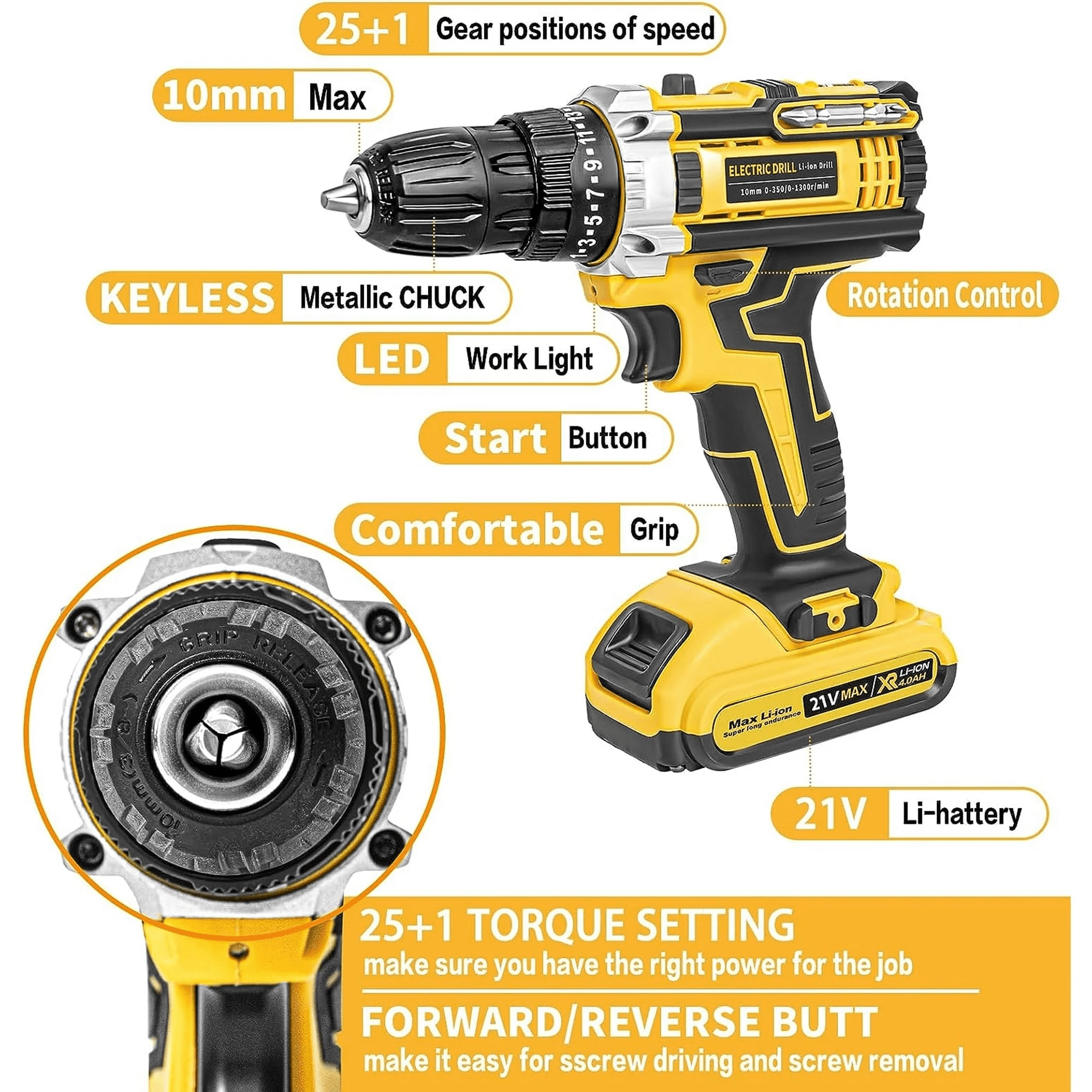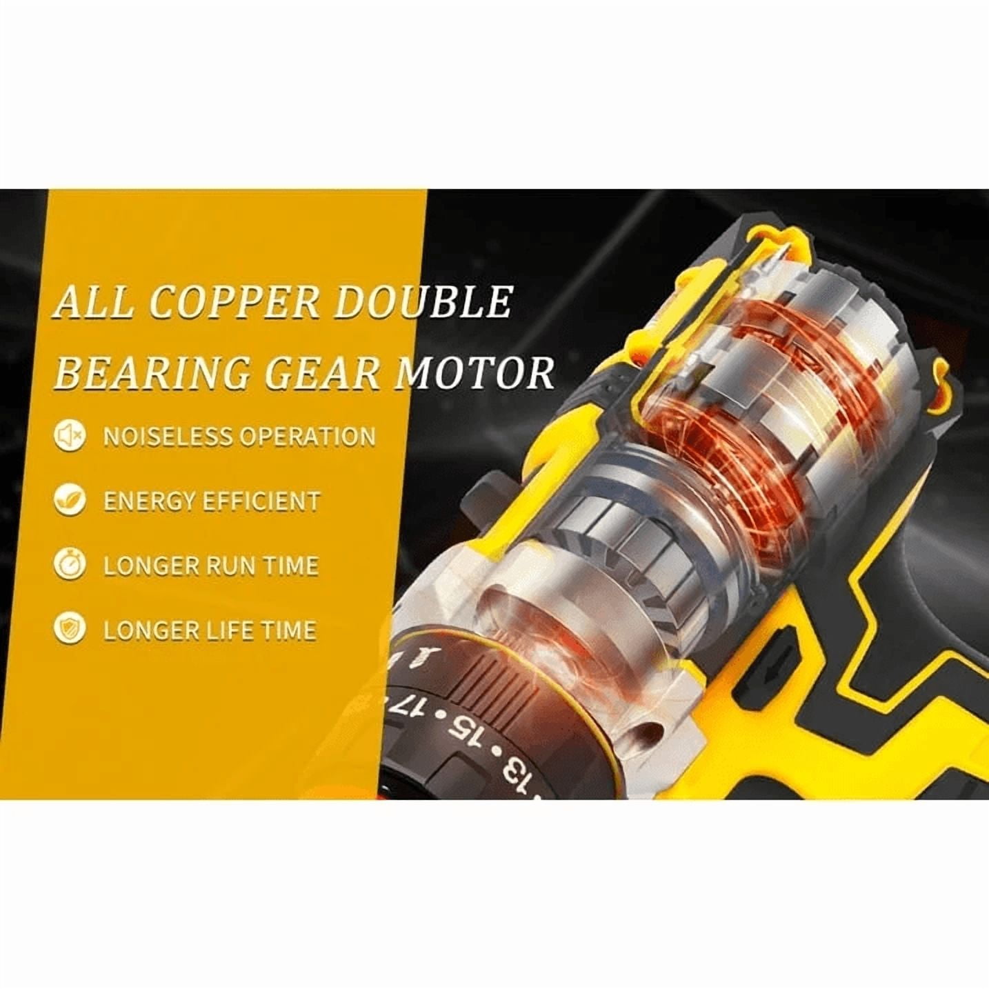 Ailongcity 21V Power Tool Set 2Ah, 120 Pieces 3/8’’ Auto Chuck, 25+3 Clutch & 2 Variable Speed Cordless Drill Set with large 3/8″(10mm) keyless chuck can provide you superior bit retention Equipped with 3 in 1 working mode (Screw Driver, Drill and Impact Hammer) Powerful Robust Motor, Max 398 IN LB for Versatile Use Designed with all copper double bearing gear motor, high performance motor delivers strong and steady power and an endurable run time 2* 2 0Ah Batteries & 1H Fast Charger Made great progress in 1,000 Charging Cycle Test that guarantees each battery is more powerful and lasting longer than those also rans Our cordless drill driver is powered by a max 21 voltage, Ergonomic Design & Comfortable to Use electric drill comes with shock absorber and a soft rubber over mold handle to offers maximum user comfort and less vibration Premium Accessories for your One Stop Shopping Choose your drill driver set without worrying about purchasing any other accessories