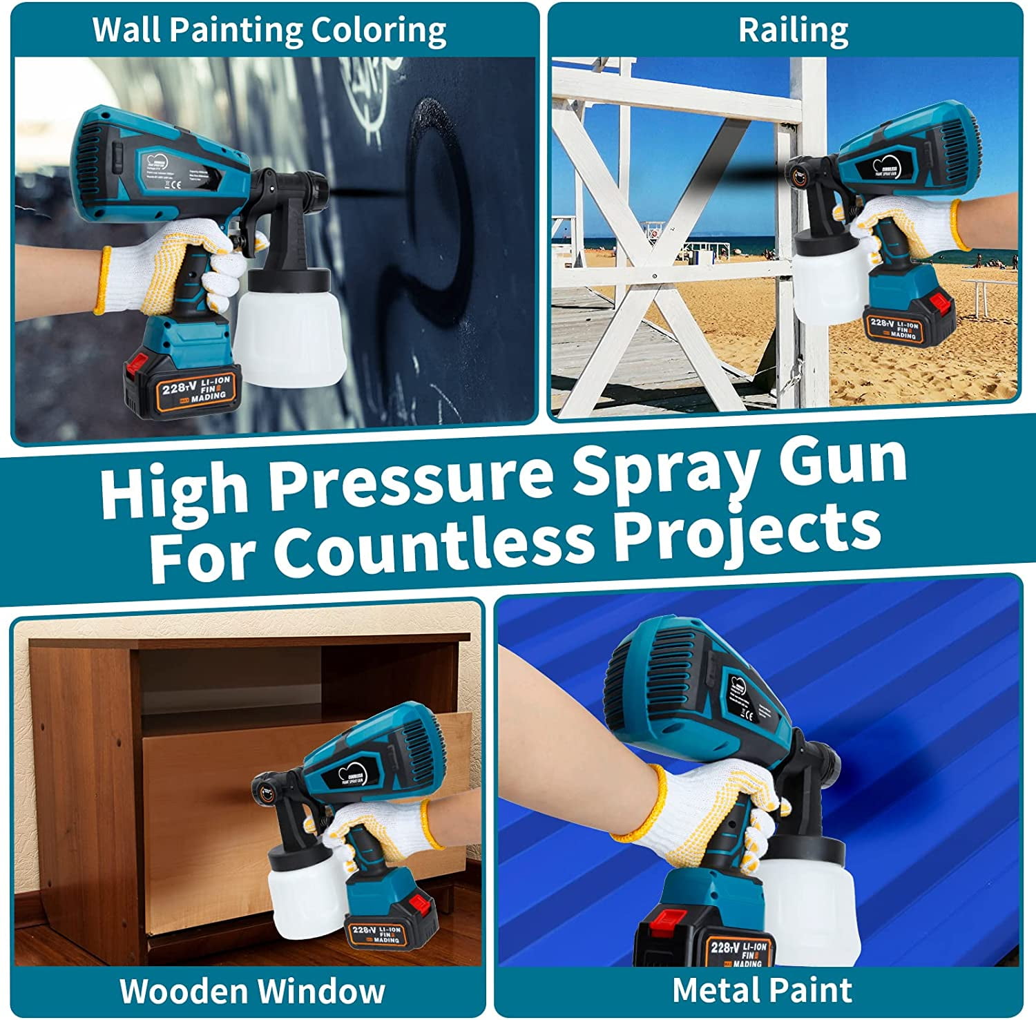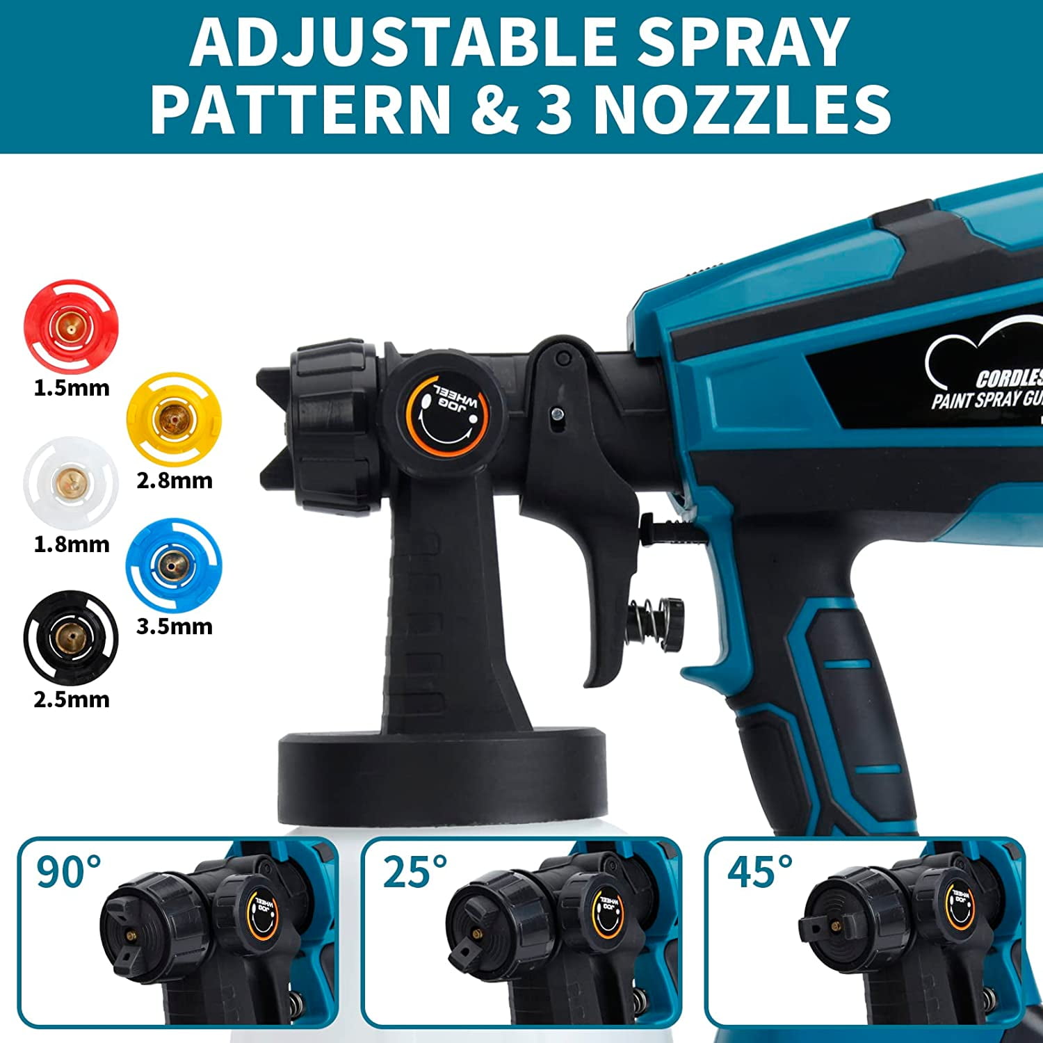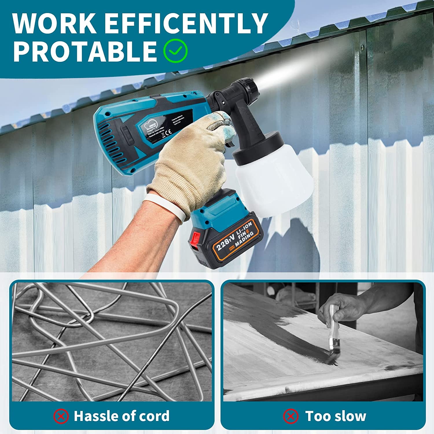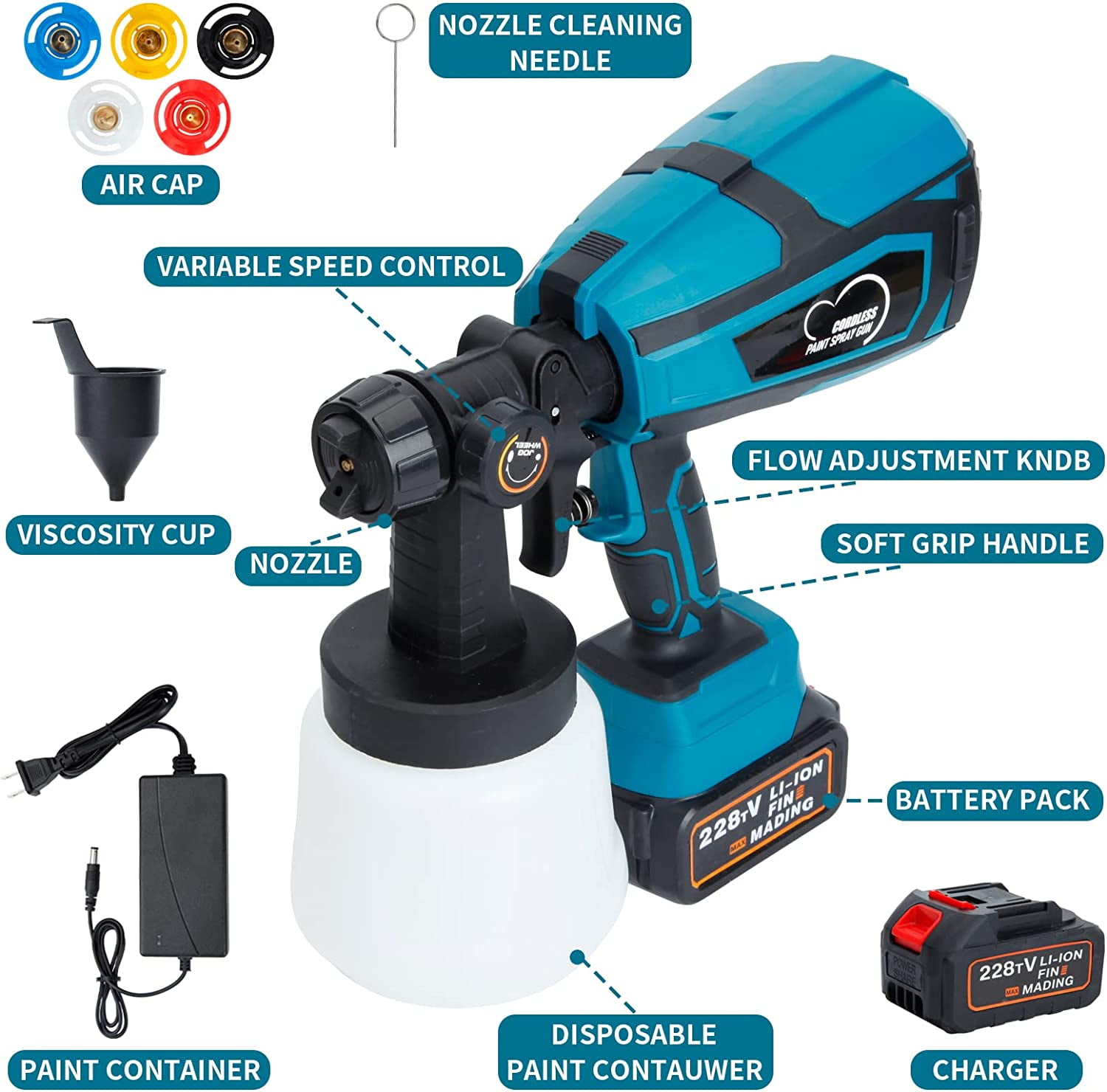Ailongcity, 600W, 228V Blue Cordless Paint Sprayer, 1000ml Capacity, 3 Patterns, 2 Pack High Power Battery Paint Sprayer – Features a high power motor for efficient operation, achieving a maximum spraying amount of 1200ml/min for precise results on various surfaces including walls, ceilings, and bricks Long Battery Life Cordless Spray Gun – Equipped with 2*40Ah batteries, allowing for extended use without the need for a power socket The cordless design eliminates restrictions from power cords 5 Nozzle Sizes & 3 Spraying Methods – Offers adjustable spraying modes (horizontal, vertical, round) and includes 5 nozzle sizes (10/15/18/20/25mm) for versatility in application Wide Range of Applications & Maximum Viscosity – Supports maximum viscosities up to 100-DINs, suitable for various paint types including latex paints, stains, sealants, and varnishes Adjustable Flow Interior Paint Sprayer – Features a control valve knob for adjusting paint output thickness (0-1200ml/min) and atomized particle size (02-05mm), optimizing paint usage and ensuring cost efficiency