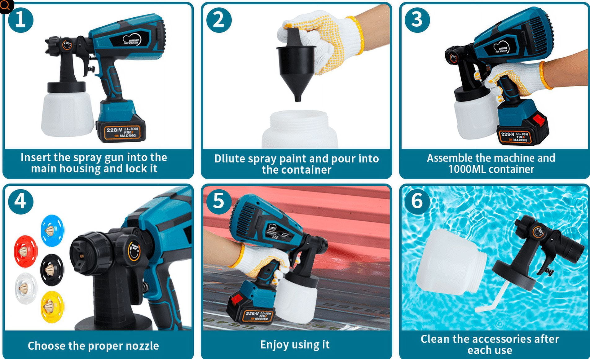 Flow adjustment knob By turning the knob on the trigger, the material flow can be controlled to meet your spray needs. Clockwise increases, counterclockwise decreases Tips: It is not recommended to use this spray paint machine for latex paints, granular and corrosive paints and coatings. Spray Angle is adjustable By rotating, you can get three different spray modes: horizontal, vertical and circular, and switch the spray mode according to your needs. 5 nozzle sizes More options, suitable for more occasions and projects, you can change different nozzle sizes in different painting projects, different needs, which will make your work more efficient. 1.5/1.8/2.5/2.8/3.5mm ideal for thin paints such as primers and varnishes. 3.5mm is ideal for chalk-type paint.
