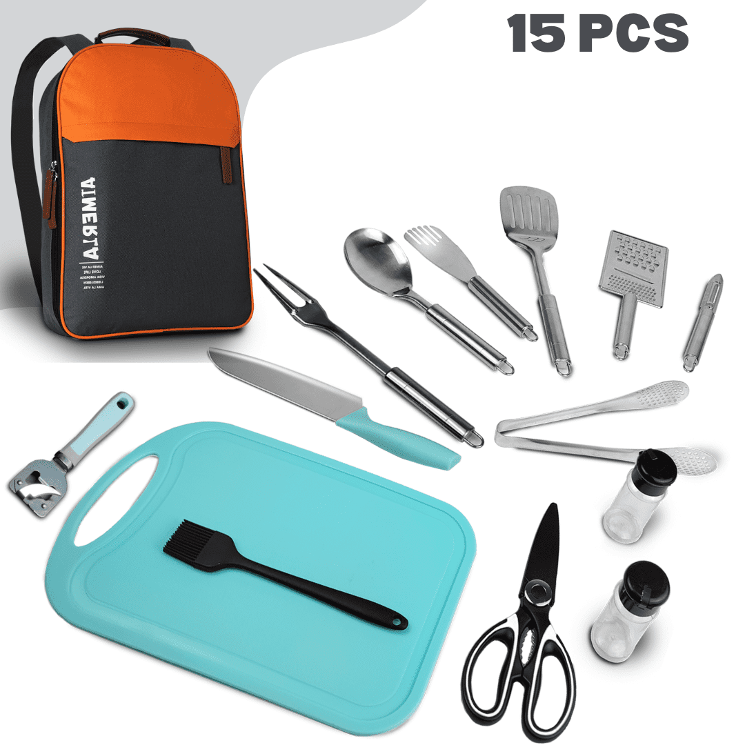 FOOD-GRADE STAINLESS, EASY TO CLEAN, DURABLE!There are lots of camp kitchen accessories that only reveal themselves to be essential after you’ve had the misfortune of forgetting them. Look no further to find all you need in one handy zip backpack with this 14-piece set: Chef’s Knife, Sauce brush,Cutting board,Food Scissors,Stainless Steel Cookwares,bottle opener,Spice Shakers, and more. Rest assured the Food-grade Stainless used in this Gold Standard cookware are of the absolute HIGHEST QUALITY 3 WAYS, STURDY, LARGE INTERIOR SPACE! If you find it hard to decide between a tote, shoulder bag, or backpack, we have a solution for you. Our Utensil set satisfies all three carry options while giving you plenty of space to hold cookwares you want to pack for a Hike. Tough Oxford woven Fabric makes the backpack stout against wear and tear are of the absolute HIGHEST QUALITY that wherever your adventures take you. Aimerla cooking utensils set boasts a designated pouch for each utensil. SUPER VERSATILE! You’ve been adventuring all day, and now it’s time to cook. This kitchen set has everything you need to prepare your favorite recipes. From SANDWICH to MAC A CHEESE. Also apply to any kind of campsite or even your own backyard! That’s where these portable kitchen essentials come in. No more rattling plastic tubs or crumpling bags for camping cookwares.Store all of your cooking utensils in one place with this 15-PCS set. This is THE perfect gift for DIE HARD CAMPERS