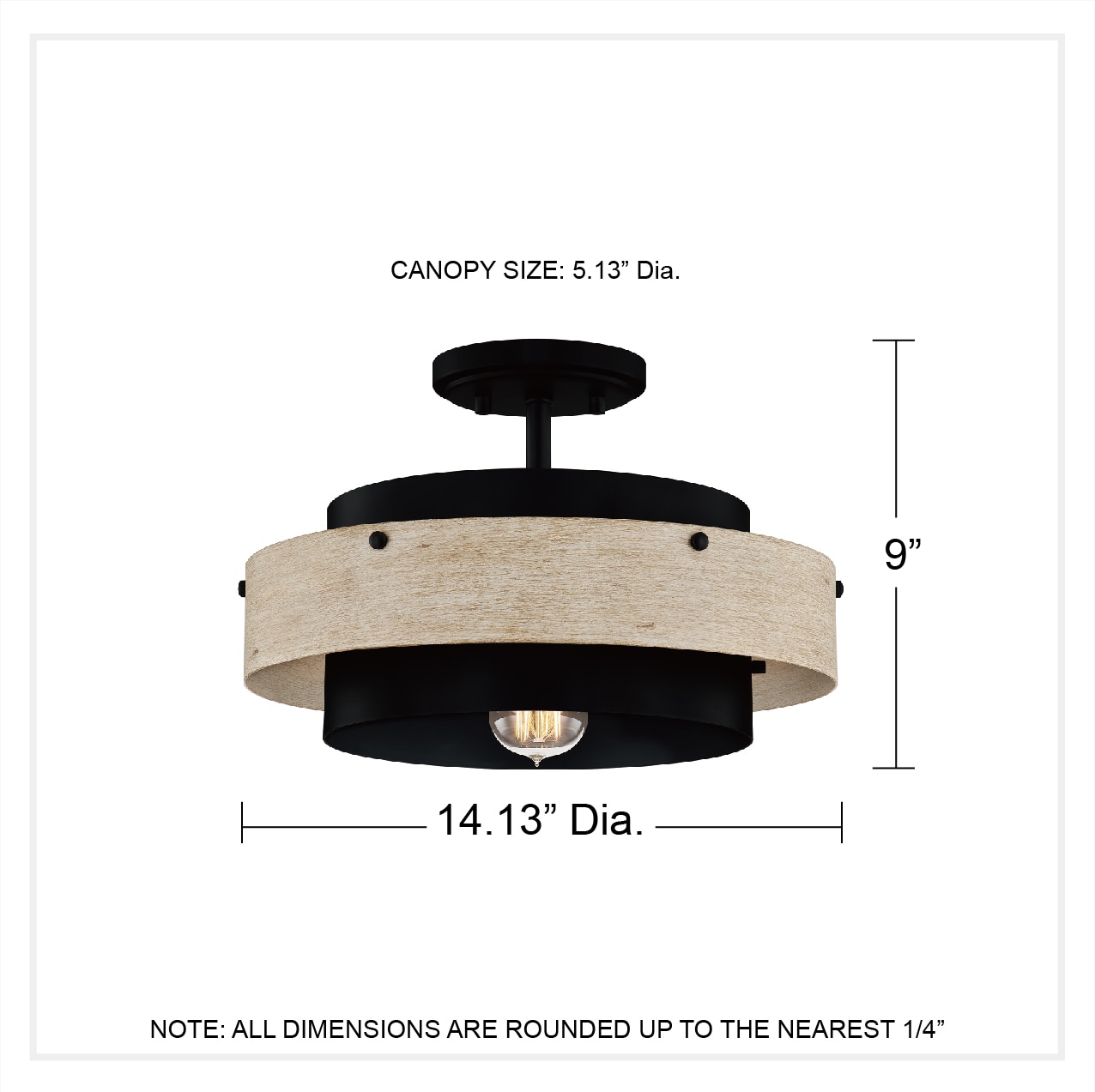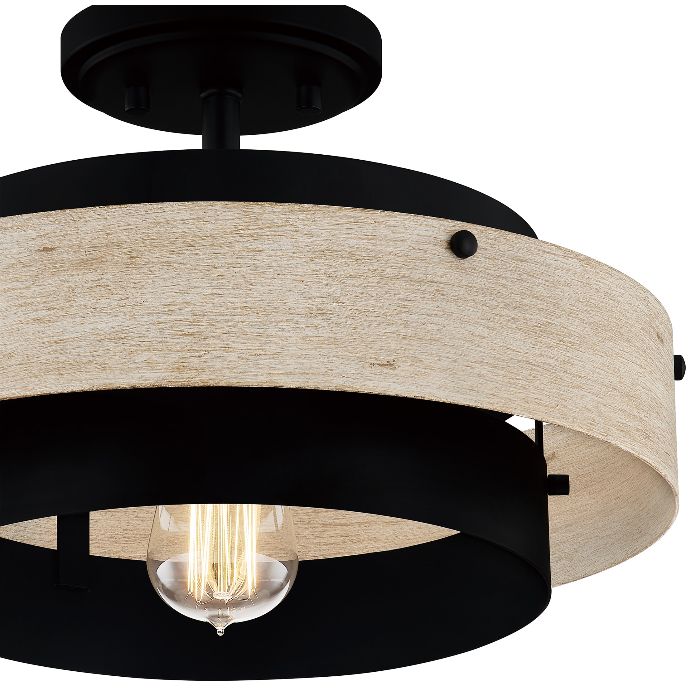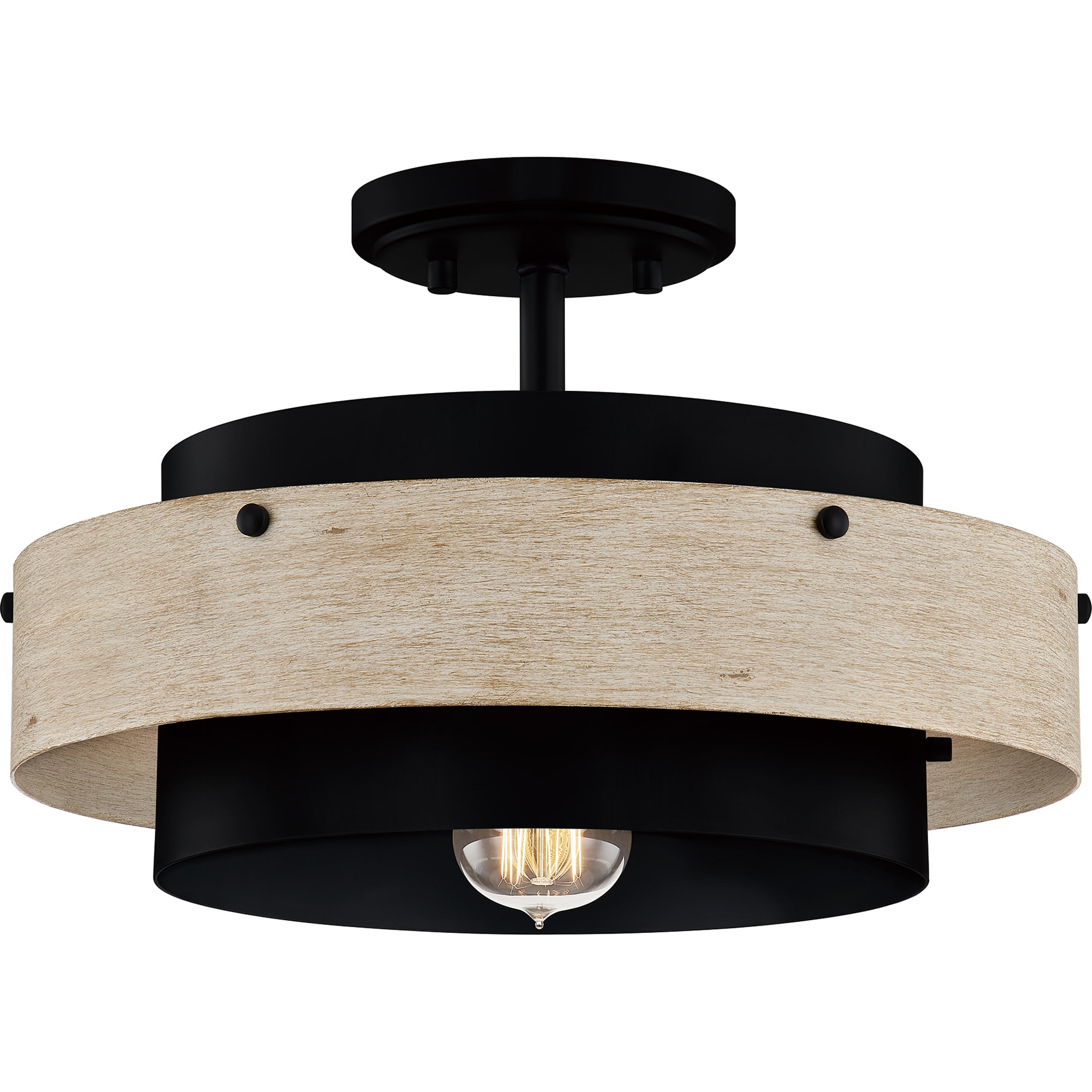 The Ainsley 1-light semi-flush mount light offers added intrigue and beautiful design to any space. The classic matte black finish is complemented by a cylindrical faux wood shade for a layered look. Ideal addition to any foyer, bedroom, hallway, or dining room. Shop the rest of the Ainsley collection for similarly designed pieces and extended colorways.