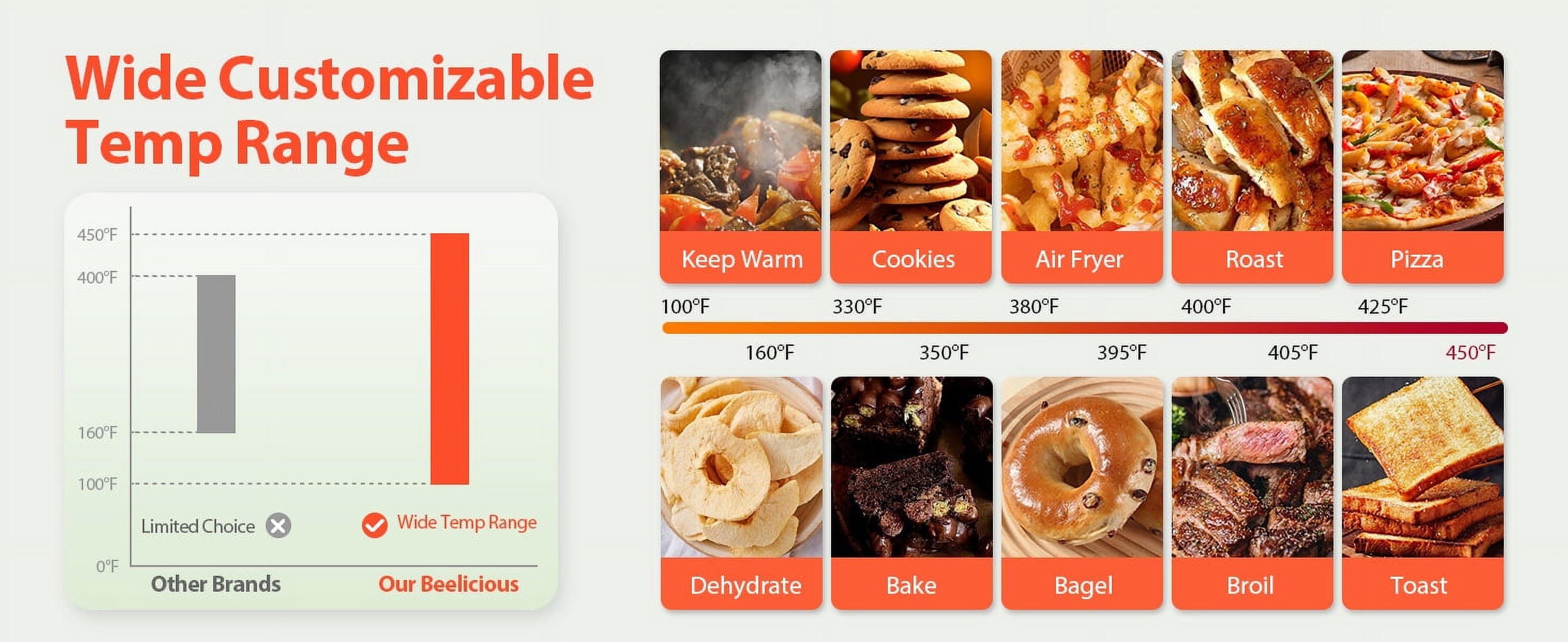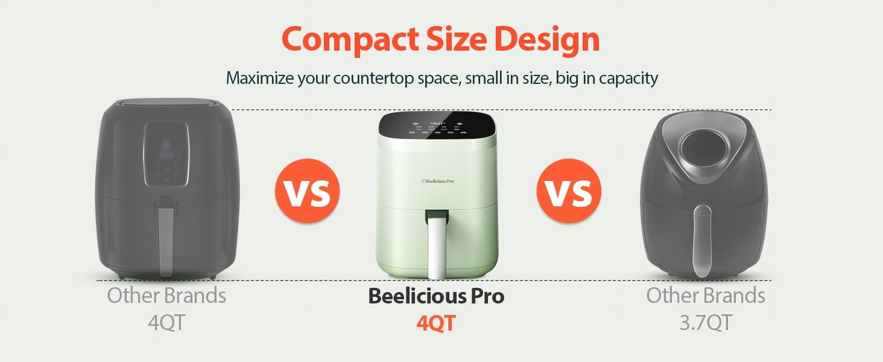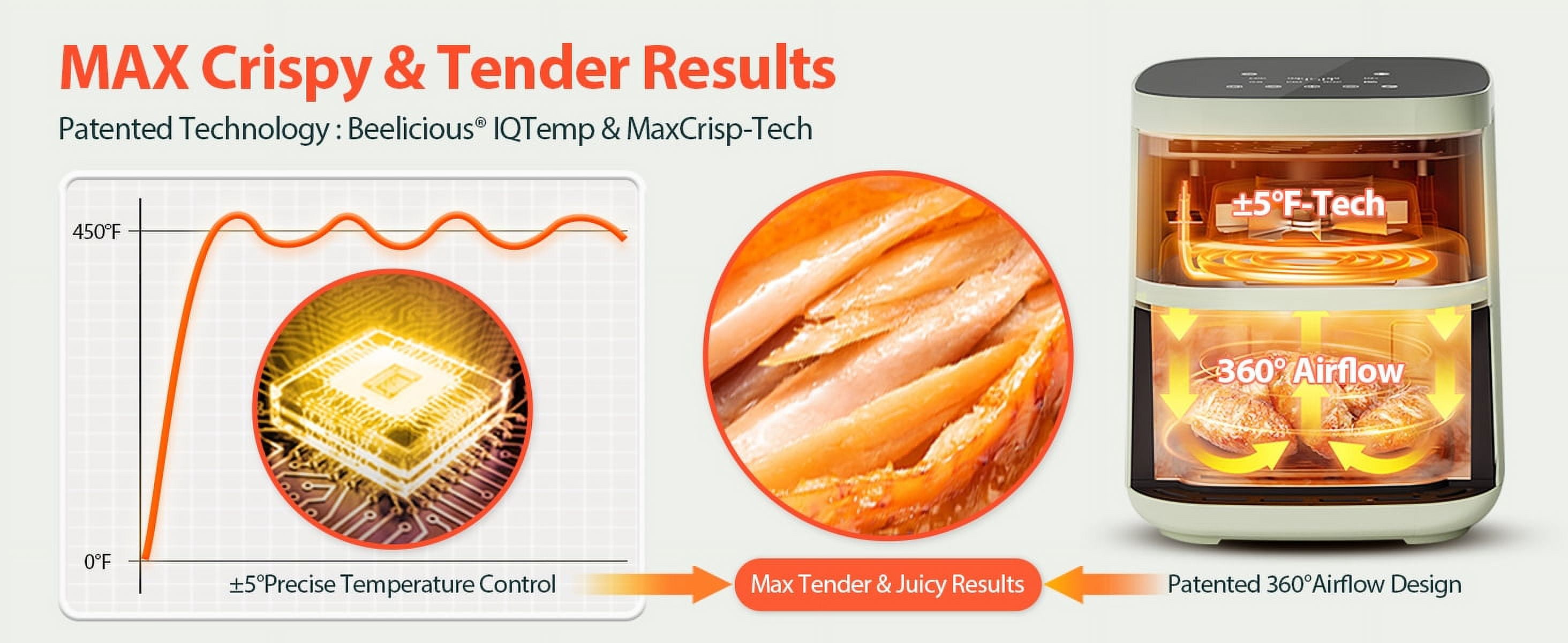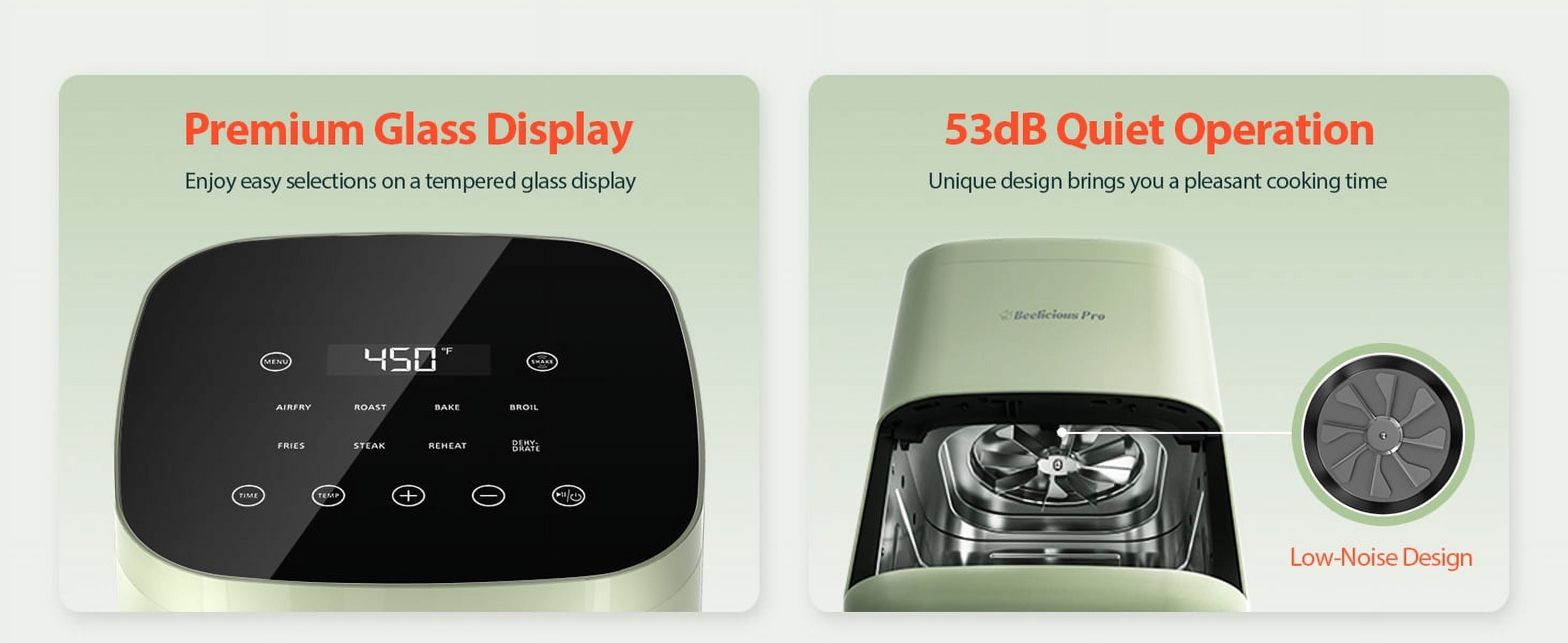Enjoy the convenience of an 8-in-1 air fryer with a temperature range of 100°F to 450°F and a cooking time range of 1 to 60 minutes. Featuring Flavor-Lock technology, this air fryer helps you cook and create more perfect dishes with its even cooking results. The tempered glass frying pan is dishwasher-safe and completely non-stick, making it easy to clean. With a 4QT capacity, this air fryer is perfectly sized for 2-4 people, allowing you to prepare healthier meals with 85%-90% less oil. Equipped with 360° rapid airflow and precise IQTemp control technology, this air fryer heats up to 40% faster than traditional ovens. Offering 8 cooking modes, including Air Fry, Roast, Bake, Broil, Fries, Steak, Reheat, and Dehydrate, this versatile appliance can handle all your cooking needs. The low-noise design at 53dB ensures a pleasant cooking experience, while the large glass display makes it easy to operate.