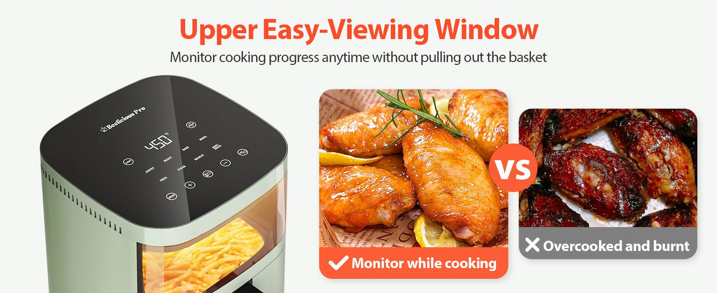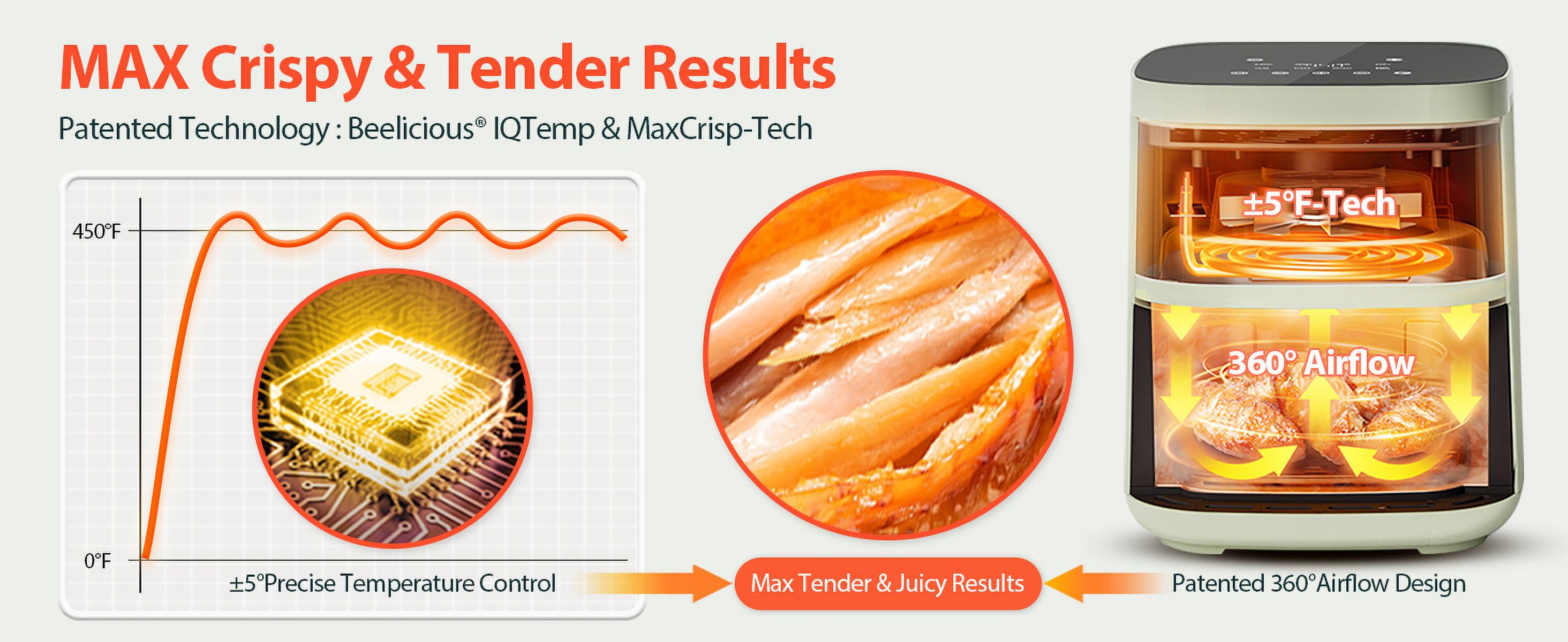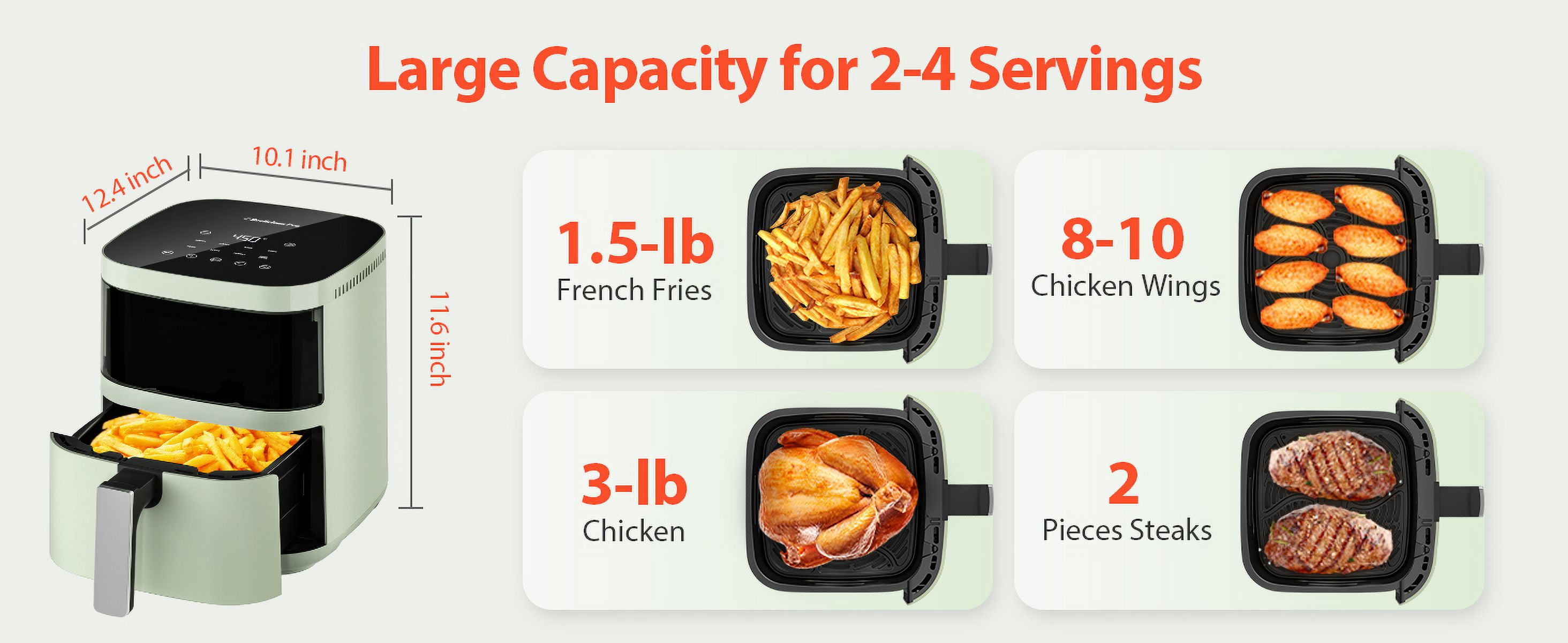 Max Tender Flavor-Lock Tech: Features upgraded 360° rapid airflow and precise IQTemp control technology for perfectly even, golden, crispy, and tender cooking results Endless Options for Your Inspiration: Offers 8 cooking modes, a wide time and temperature control range, and includes 40+ chef-created recipes. Cooking options include Air Fry, Roast, Bake, Broil, Fries, Steak, Reheat, and Dehydrate (1-60 minutes & 100°F-450°F) Healthier Meal in Minutes: Heats up to 450°F and has a unique metal chamber design, cooking 40% faster than traditional ovens while using 85%-90% less oil for healthier results Large Capacity & Compact Size: 4-quart cooking space accommodates up to 2 pounds of french fries or 12 chicken wings, perfect for 1-4 people while taking up minimal countertop space Upgraded Features for Your Convenience: Low-noise design (53dB) for a pleasant cooking experience, large glass display for easy operation, and a dishwasher-safe, nonstick fryer basket for effortless cleaning Easy-View Window with Light: User-friendly top view design allows you to monitor cooking progress without pulling out the basket, making cooking more comfortable and efficient