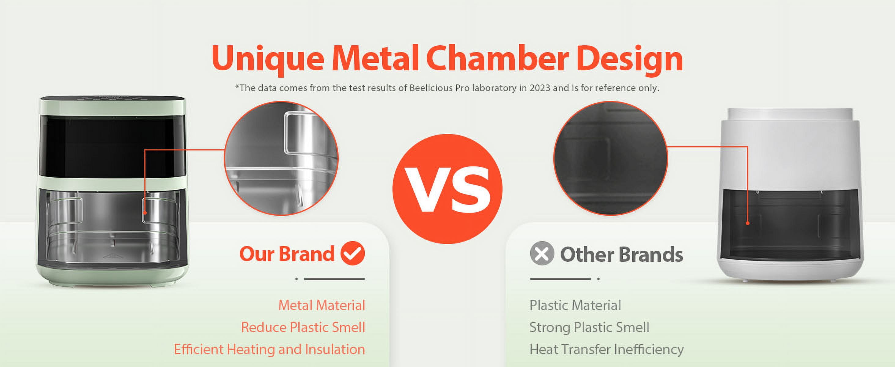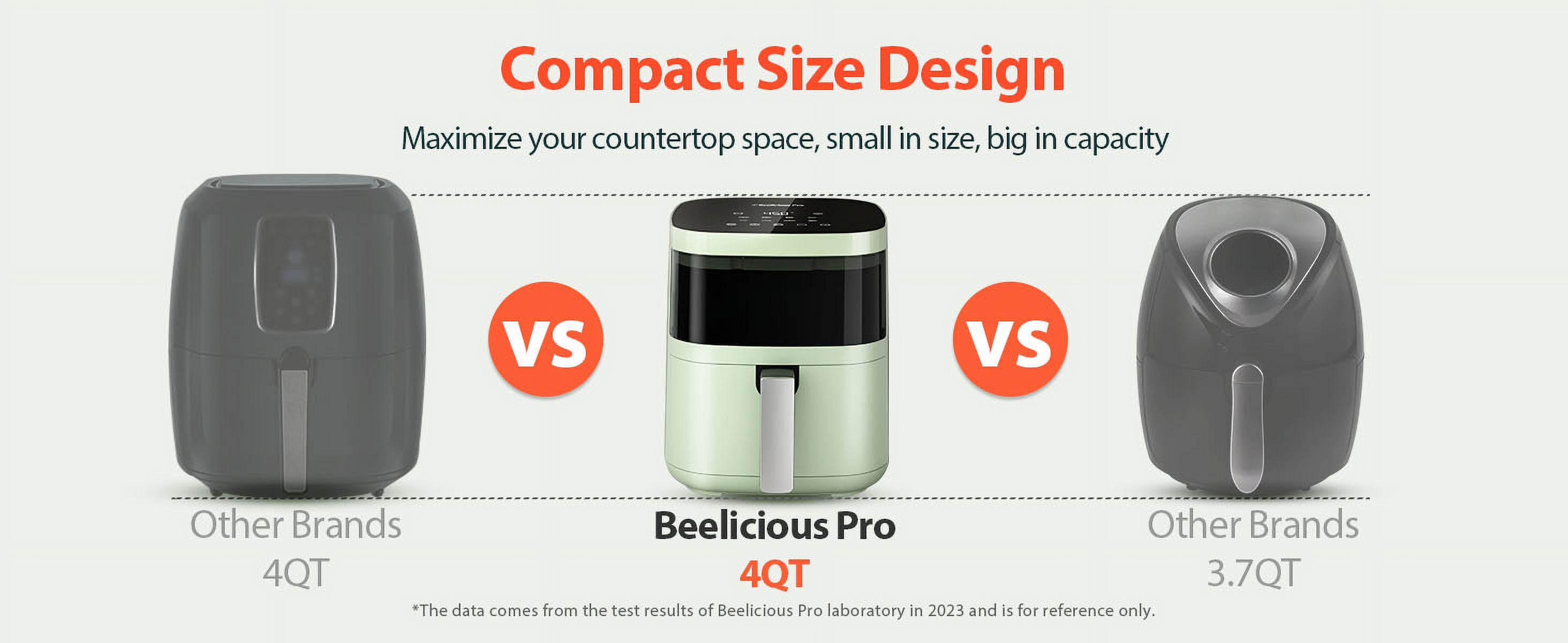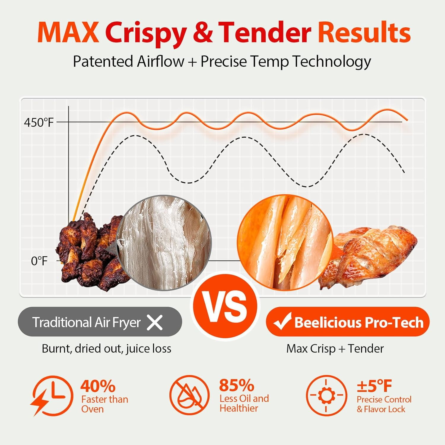 Max Tender Flavor-Lock Tech: Features upgraded 360° rapid airflow and precise IQTemp control technology for perfectly even, golden, crispy, and tender cooking results Endless Options for Your Inspiration: Offers 8 cooking modes, a wide time and temperature control range, and includes 40+ chef-created recipes. Cooking options include Air Fry, Roast, Bake, Broil, Fries, Steak, Reheat, and Dehydrate (1-60 minutes & 100°F-450°F) Healthier Meal in Minutes: Heats up to 450°F and has a unique metal chamber design, cooking 40% faster than traditional ovens while using 85%-90% less oil for healthier results Large Capacity & Compact Size: 4-quart cooking space accommodates up to 2 pounds of french fries or 12 chicken wings, perfect for 1-4 people while taking up minimal countertop space Upgraded Features for Your Convenience: Low-noise design (53dB) for a pleasant cooking experience, large glass display for easy operation, and a dishwasher-safe, nonstick fryer basket for effortless cleaning Easy-View Window with Light: User-friendly top view design allows you to monitor cooking progress without pulling out the basket, making cooking more comfortable and efficient