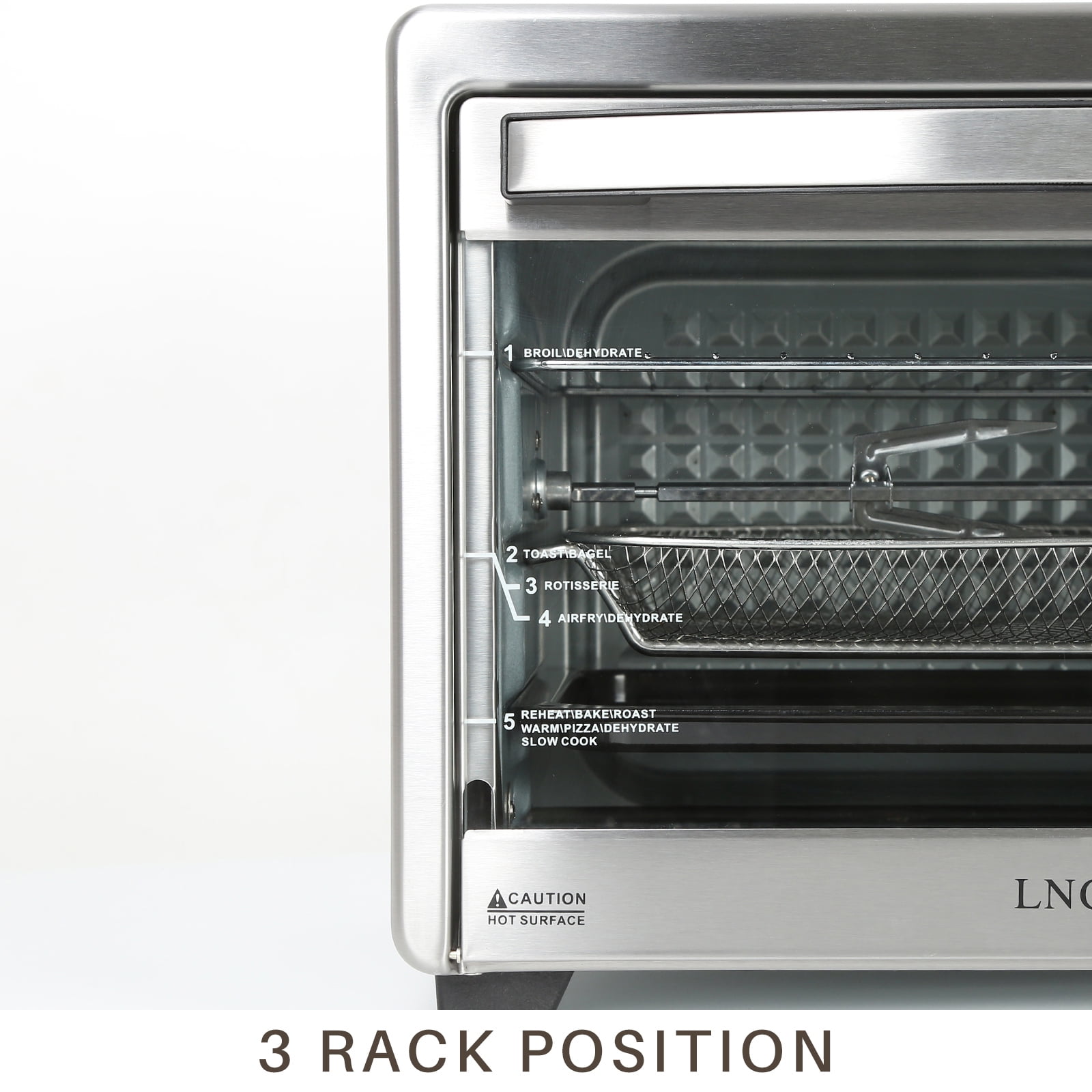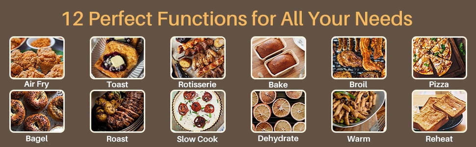 With design in mind, our appliance would be the best appliance to help people improve their lives. Every multi-purpose hot air fryer we produce is backed by chef-quality design, construction, and support to ensure it lasts through every evening meal, holiday dinner, and a quick bite of delicious fries. There are 12 versatile cooking modes and would be a beneficial investment as it can satisfy many of your needs, especially for loners or people who don’t usually cook. Our product is qualified with ETL and FCC certification and it is a sleek, state-of-the-art appliance that can complement your kitchen and surrounding accessories. Features: Extra large 34-quarts capacity fits a large chicken, 12” pizza, or 12 slices of toast. The glass door rolls out of your way, making it easy to check on food as it cooks. You’ll have more room on your countertop in front and you can lift the door up to remove messy cooking splatters. The Sure-Crisp air fry convection function circulates air around food sear up to 450°F as it cooks, creating crispy and delicious fries, chicken wings, steaks, fish, vegetables and more. Better Than Your Ordinary Convection Oven with 360° Quick Cook Technology and five super powerful heating elements mean your meals cook evenly on all sides in a whirlwind of super-heated air for crispy, delicious flavors. No added fats, oils, or unhealthy grease required. Get chef-quality results in one compact, 1750-Watt countertop oven 60% faster than regular ovens. Extra Versatile LCD Digital Display with 12 Cooking Functions: Air fry, bake, rotisserie, dehydrate, toast, reheat, roast, broil, bagel, pizza, slow cook, and warm / reheat. Using an air fryer over a traditional deep fryer can help reduce the number of unhealthy calories you consume by up to 70% while still letting you enjoy your favorite foods. Stainless-Steel Construction : A sleek, state-of-the art appliance to complement your kitchen and surrounding accessories, this all-in-one air fryer, rotisserie, and dehydrator oven provides long-lasting versatility and an XXL1952 cubic inches capacity. Includes a crumb tray, baking tray, baking rack, rotisserie fork, fry basket.