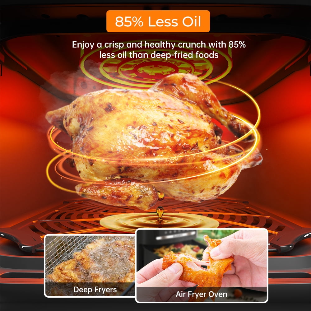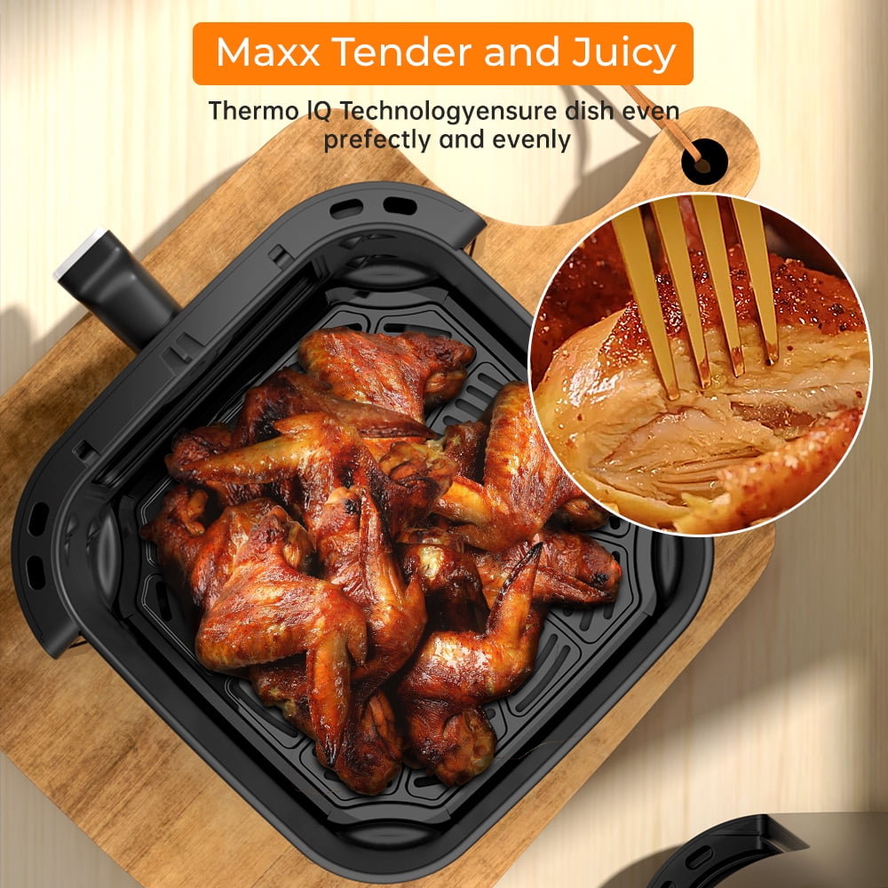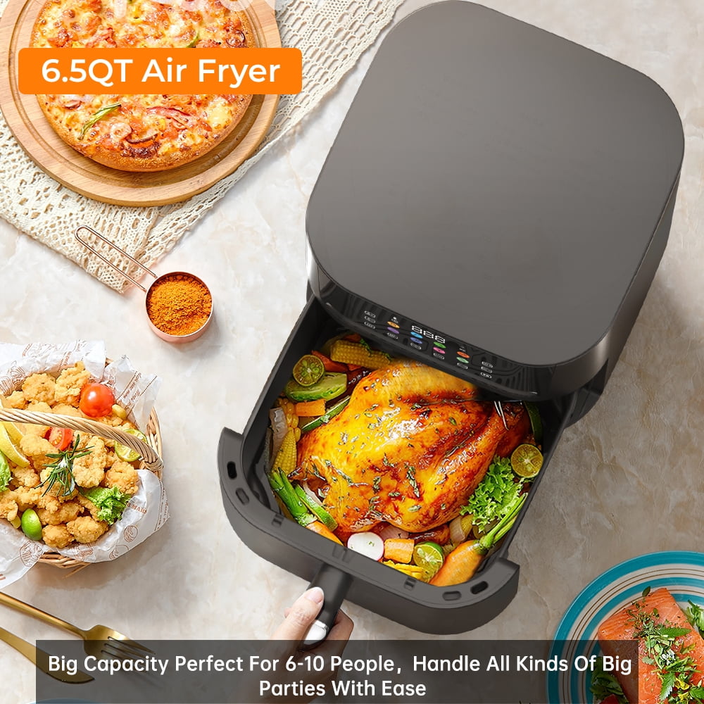 12 Customizable Programs: 12 programs set according to professional chef recipes offer you more options. In addition, adjustable times (1 to 60 minutes) and temperatures (140℉-400℉) allow you to customize your dishes. Preheat and shake alerts for even heating of your food. Integration of Taste and Health: Air fryer features a systematic design with an oven-grade smart temperature control system to make the ingredients crispy outside and tender inside. Enjoy healthier food with a better taste thanks to the 360°hot air circulation heating your food evenly. Cut Off 30% Cooking Time: Industry-leading temperature cooking up to 205°C, making it 30% more efficient than ever before to quickly enjoy the same crispy texture as traditional frying, but with 85% less fat. Easy to Clean: The removable non-stick pan is made of food-safe materials PFOA and BPA free and dishwasher safe. Non-slip feet ensure safe and stable cooking, and the square design basket offers more space and flexibility when cooking than the round design. Unique memory feature allows you to pull out the fryer at any time, view your food and continue cooking. Big Capactiy: This 6.5 quart large air fryer is perfect for feeding the whole family or about 6-10 people and is designed to get dinner on the table in minutes.