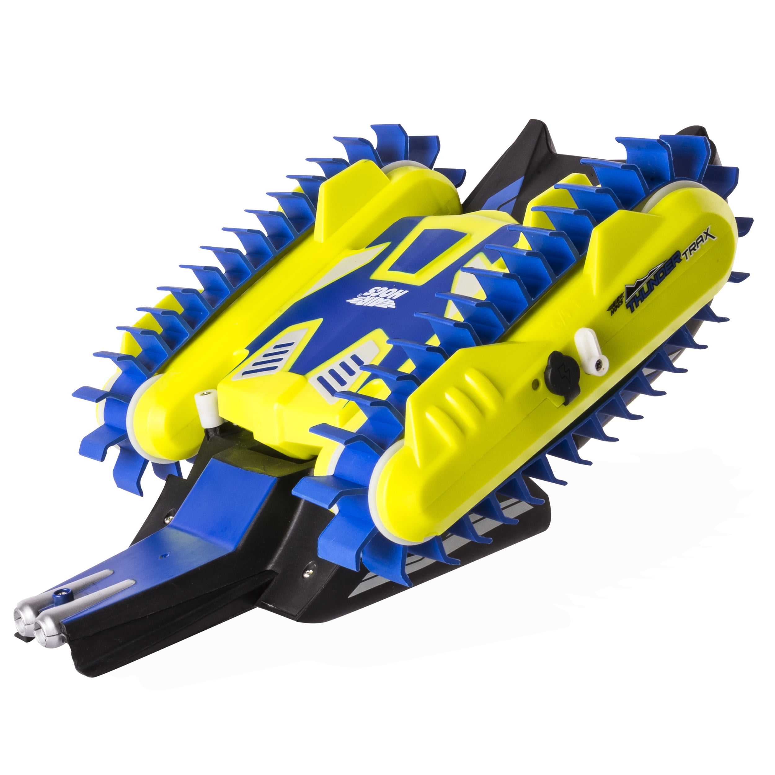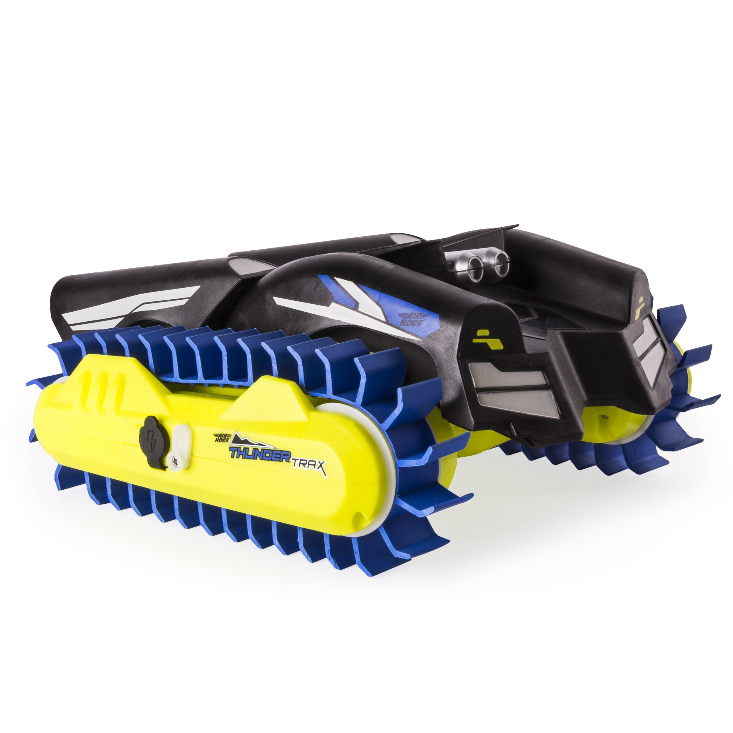 Air Hogs Thunder Trax is all terrain rc adventure, in any season! Designed with thick treads that take the place of wheels and a powerful motor, Thunder Trax can muscle it’s way on grass, gravel, mud, snow and even water! With the push of a button watch this radio control vehicle transform on water from tank to boat and make some waves. The simple to use 2.4GHz R/C controller puts kids in the driver’s seat to direct it to move forward or backward, and with it’s easy USB charger, puts them back on the road faster to speed away on another adventure – indoors or out. Go full-throttle with Thunder Trax, the transforming all terrain RC vehicle from Air Hogs!