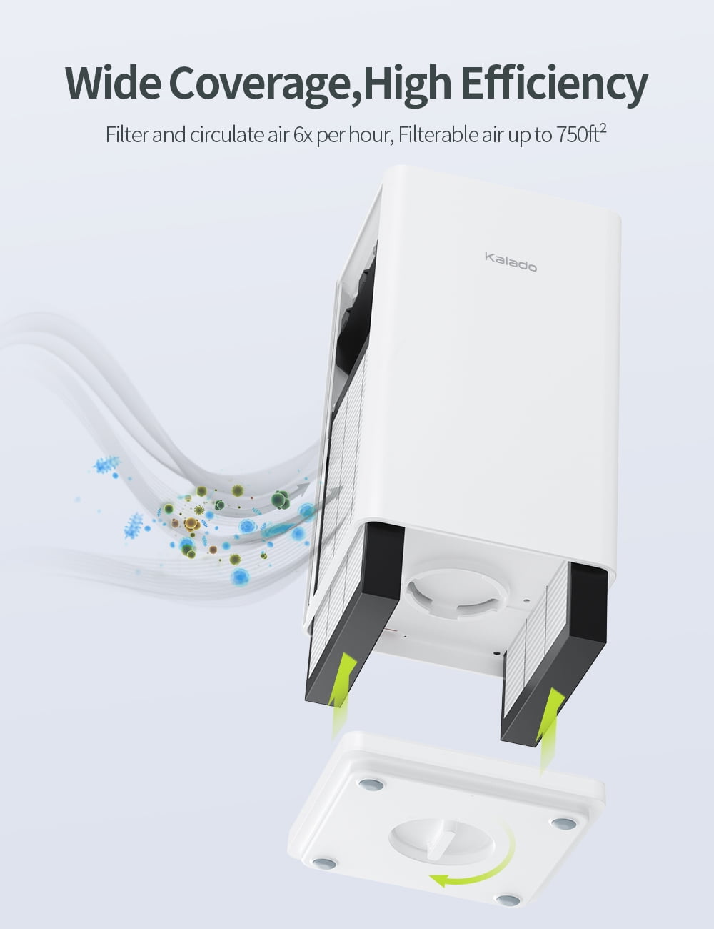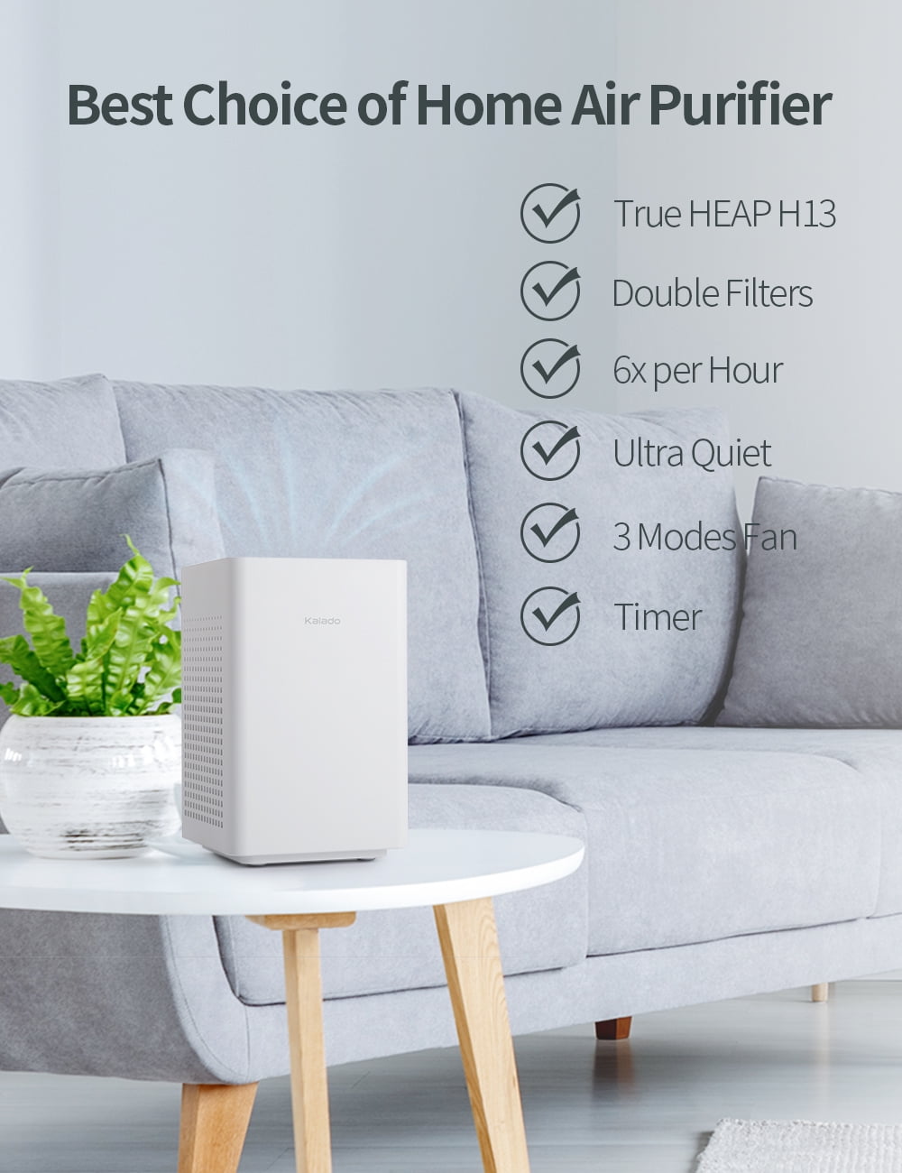 [Large Coverage]: Air Purifier for Home Have double filter that can purify the large area, making it the perfect companion for your home office, guest room, baby nursery, and more. Enjoy fresh air in minutes with the Kalado True HEPA Air Purifier. It cleans spaces up to 547 ft² in 30 minutes, 219 ft² in 12 minutes(CADR:150m3/h). [High Circulation Rate] Air Purifier for Home has a 3-stage filtration system(prefilter, activated carbon filter and HEPA filter). Over 99.97% purification rate, with H13 true HEPA triple filter, which traps viruses, bacteria, pollen,dust, and pet hair/dander etc. Enjoy your fresh life. [Quiet Operation] In sleep mode, the display light is off and the noise is reduced to 20 db, perfect for a quiet and soothing indoor environment. Sleep soundly without loud rattling coming from your air purifier.It will not disturb your sweet sleep, and even a light sleep baby can enjoy the comfortable air in the quiet night. [One-Button Control] Tired of complicated machines, Cycle through 3 fan speeds, timing settings set 2/4/8 hours, turn the air purifier on/off, and reset the Check Filter Indicator with one simple button. [Smart Filter Replacement Indicator] Air Purifier for Home are set up with a 2000 hour cartridge replacement reminder, the red indicator light will turn on when the purifier has been in use for more than 2000 hours. For the health of you and your family, we recommend that you replace the filter cartridge once every 3-6 months.