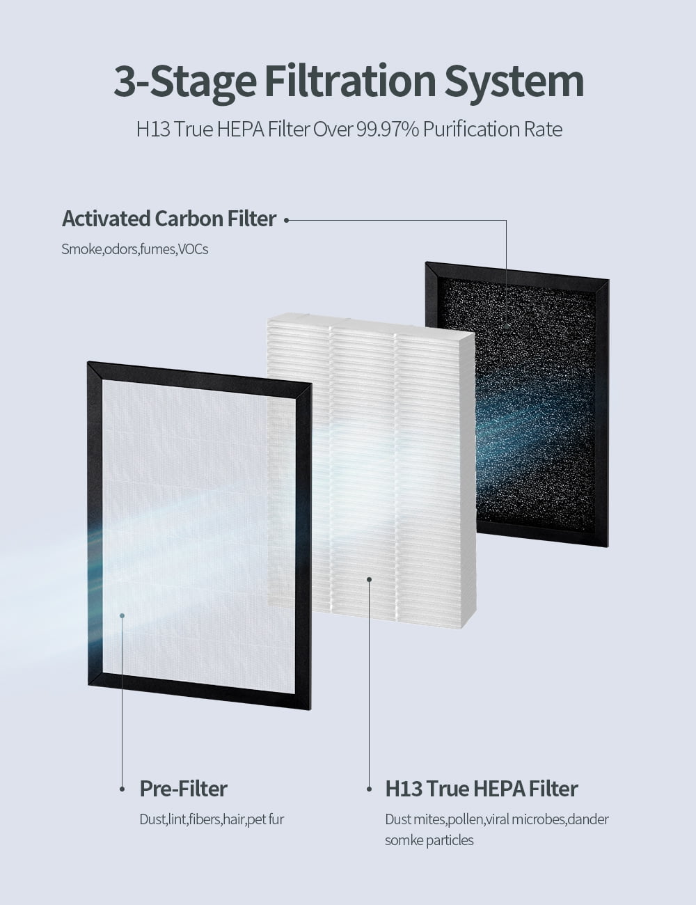 ►Features: Air Purifier for Home with Wide Coverage,High Efficiency Filter and circulate air 6x per hour,Filterable air up to 750ft Air Purifier for Home with Pres-Filter Dust,lint,fibers,hair,pet fur Air Purifier with H13 True HEPA Filter Dust mites,pollen,viral microbes,dander smoke particles Ultra Quite Sleep Mode