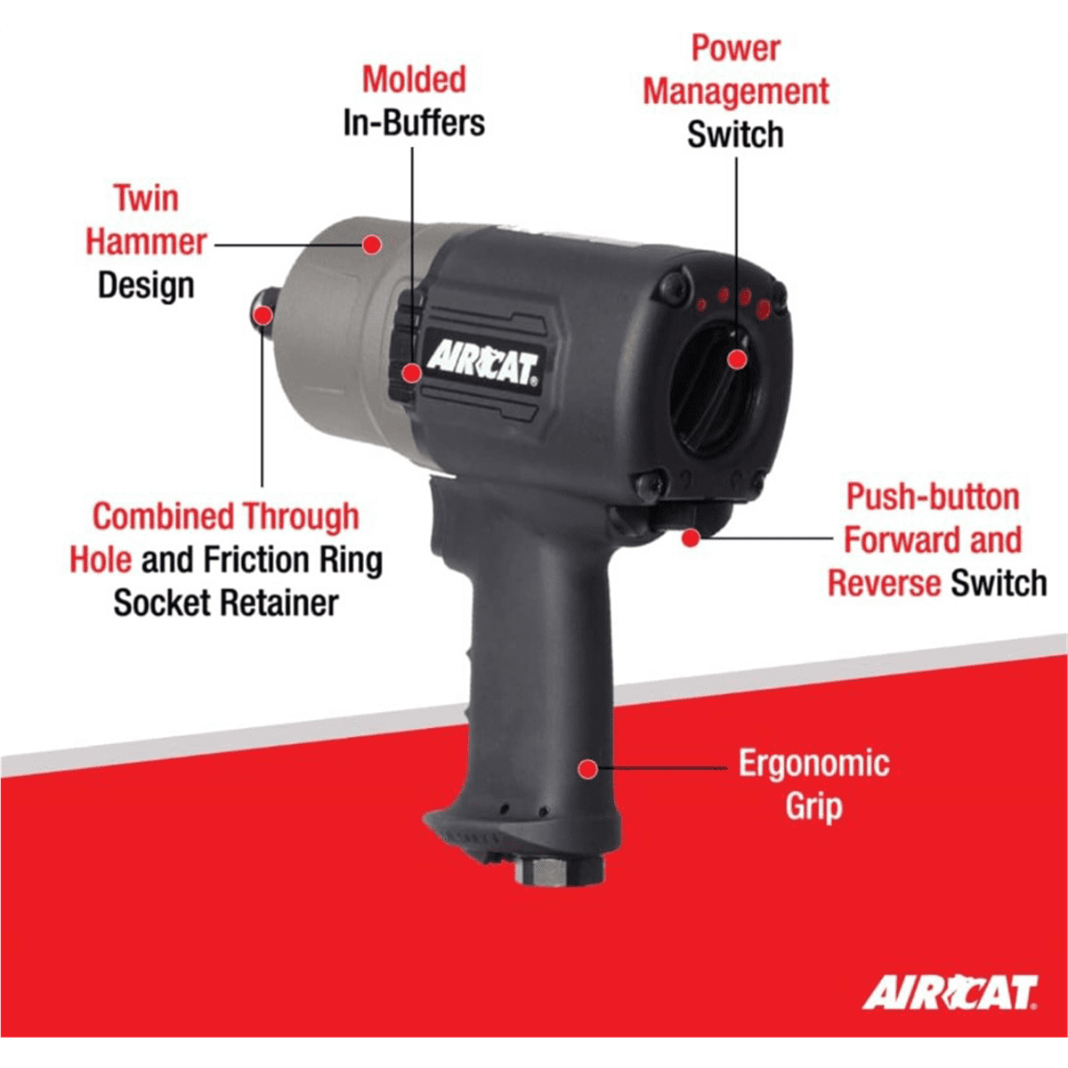 Power and Performance: 1,400 ft-lbs of maximum torque; 1,600 ft-lbs loosening torque Twin Hammer: Refined design increases blow frequency and efficiency Buffers: Molded-in buffers protect the tool from side impact Impact Wrench: With ergonomic handle for the user’s ultimate comfort AIRCAT Line: The most significant advances in the performance of pneumatic power tools