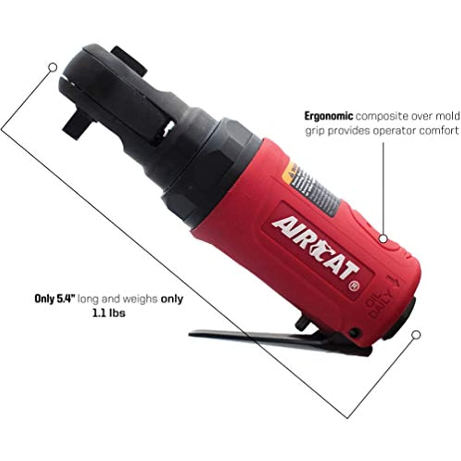 Mini Ratchet: Fits in the palm of your hand and is ideal for working around very confined spaces Handy Air Tool: Delivers 35 ft-lbs of maximum torque; 300 RPM for fast rundown Quick Socket Release Button: Assists in changing sockets Air Ratchet: Ergonomic handle for the user’s ultimate comfort AIRCAT Line: The most significant advances in the performance of pneumatic power tools