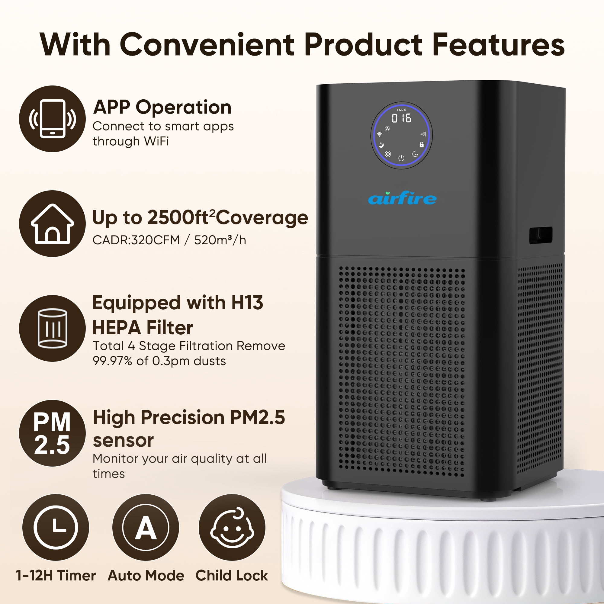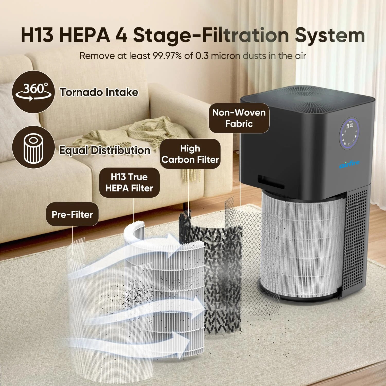 AIRFIRE HEPA Air Purifier for Large Rooms 3500 Sq.ft, WiFi Air Purifiers for Wildfire, Smoke, Pet Dander&Odor, Dust, Pollen, AP404, Black