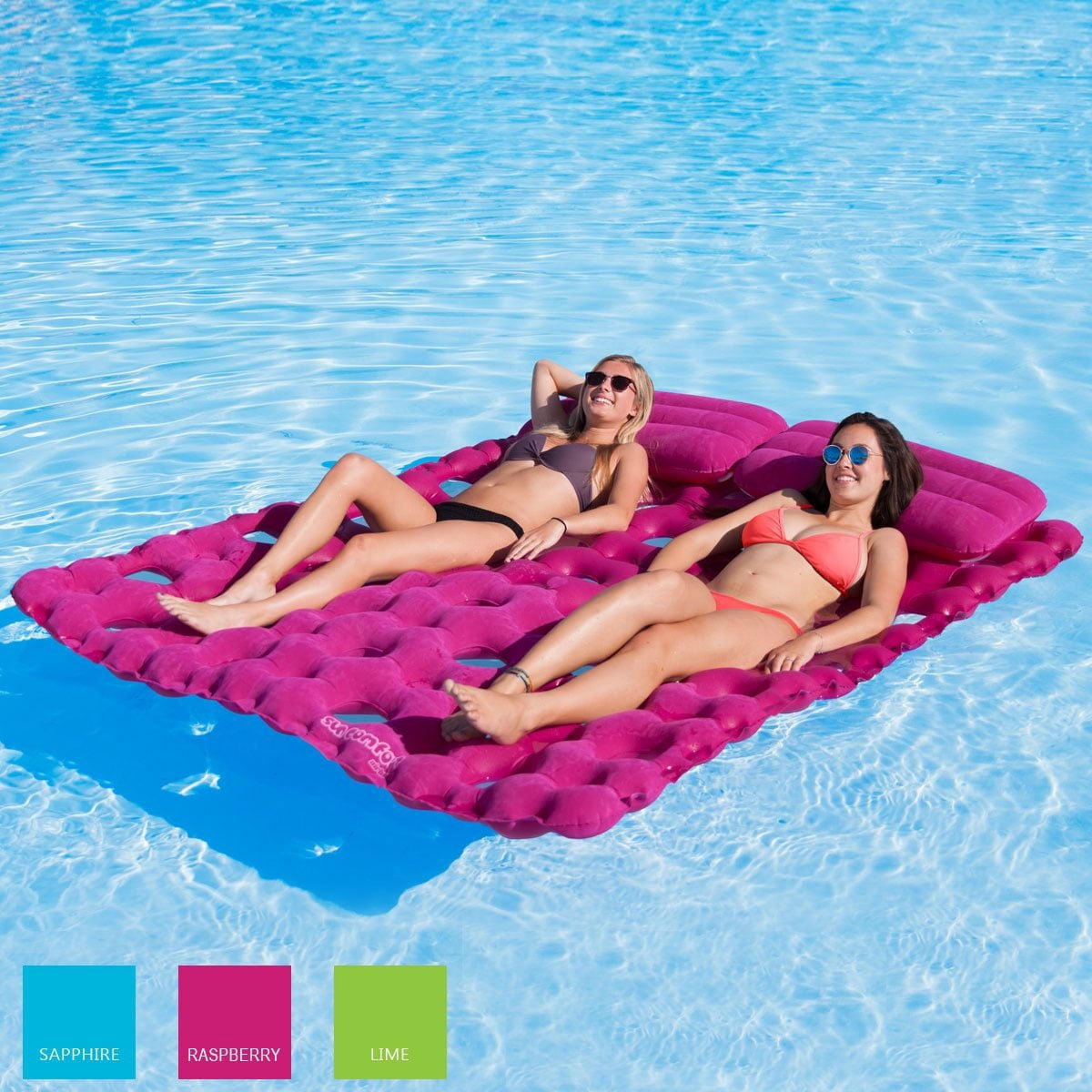 Vibrant colored double mattress pool lounger is perfect for sunbathing or enjoying a good book on the water Lay down comfortably with removable pillows for ultimate sunbathing Includes molded carry handles for added portability on land or water Molded rope holder is great for tethering to docks, buoys, boats, or other lounges Patented Speed Safety Valve allows quick and easy inflating and deflating Color: Raspberry pink Dimensions (deflated) (L x W): 89 x 73 inches Weight: 10.7 pounds Manufacturer warranty: 1-year warranty