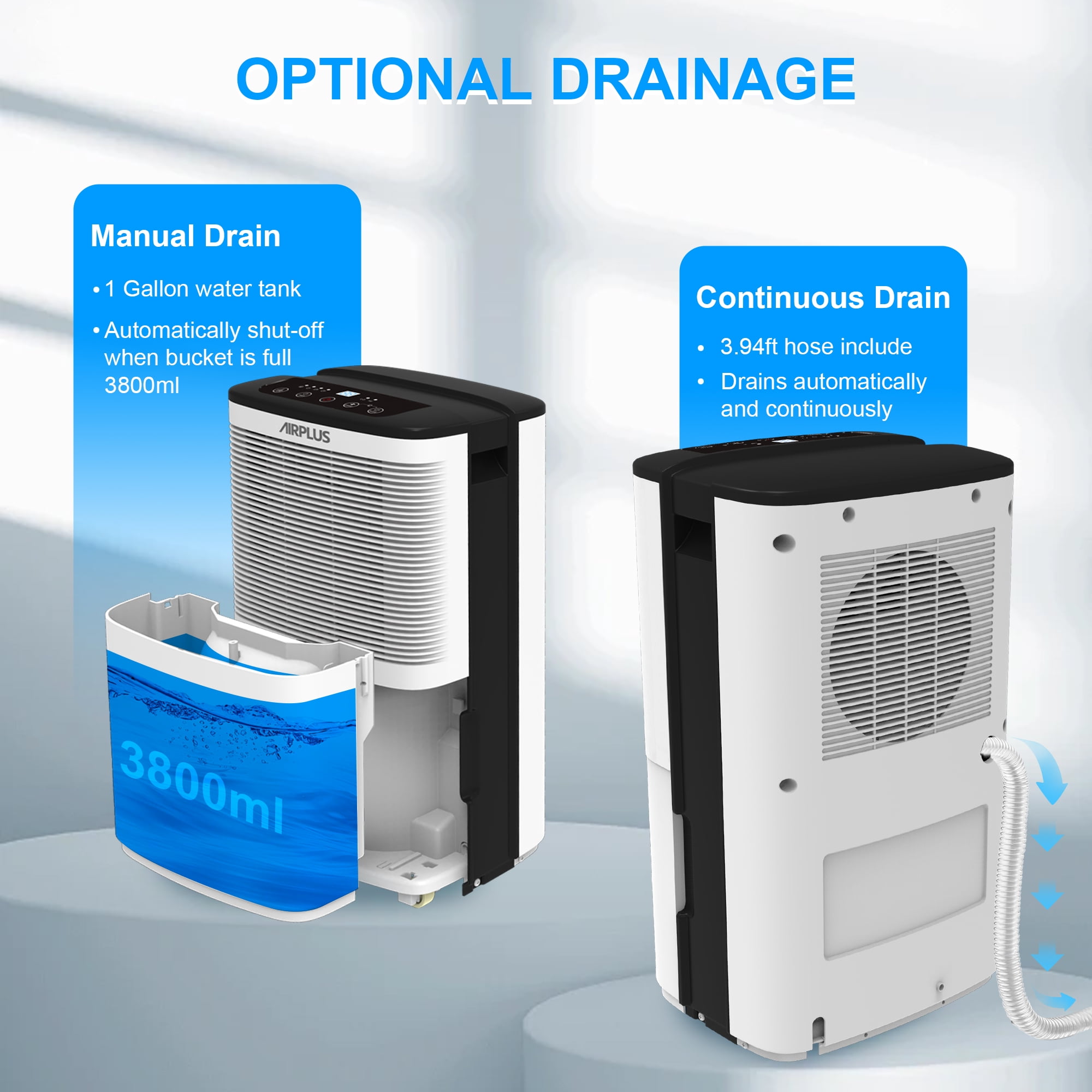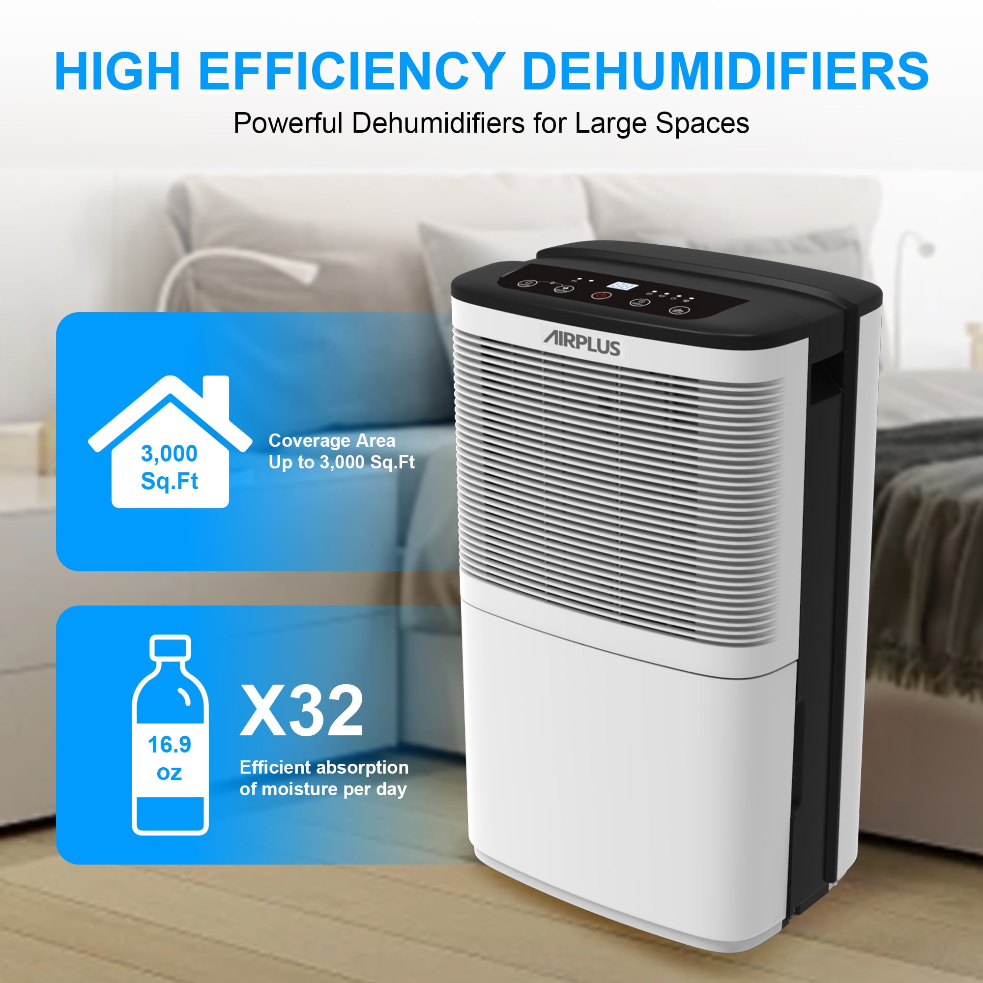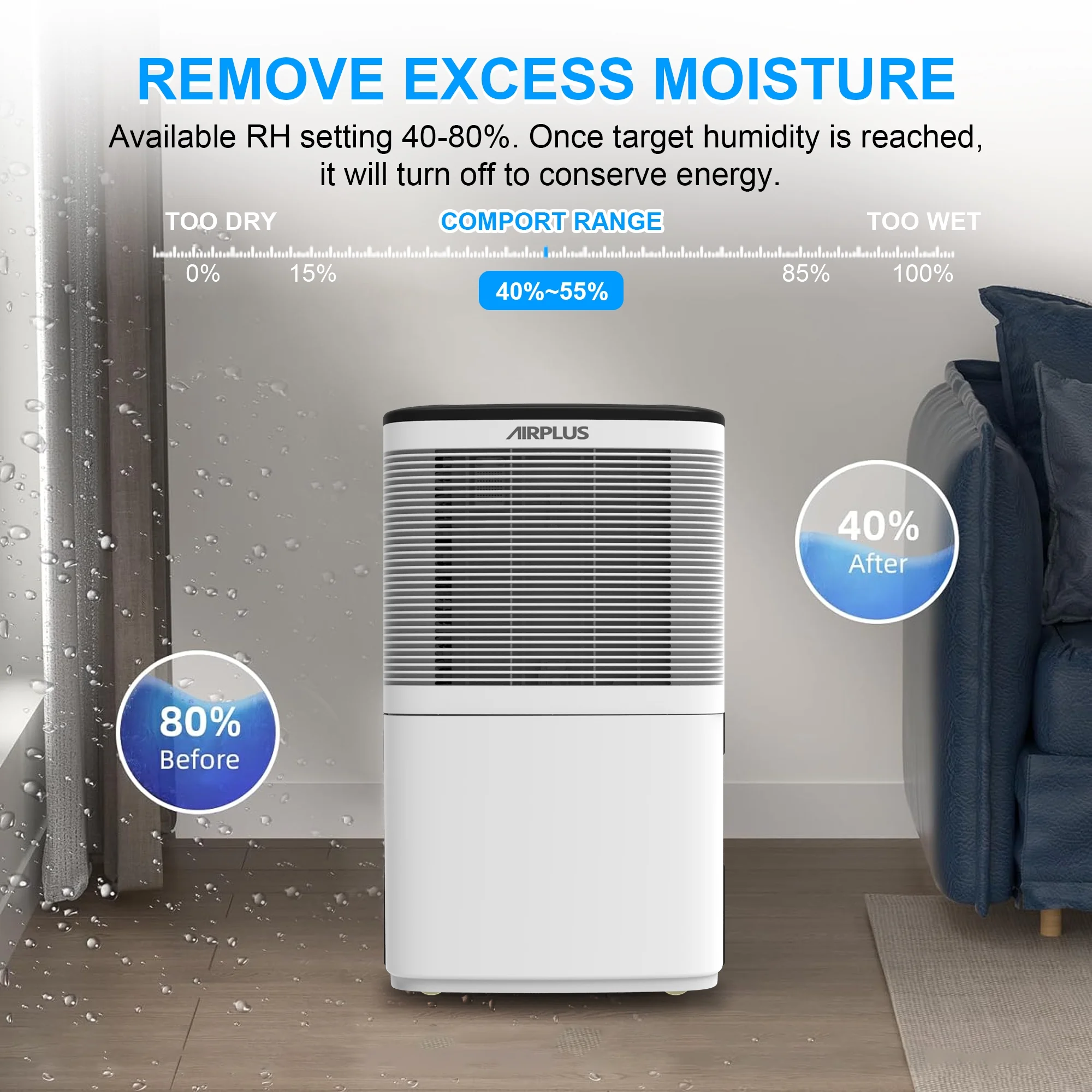 AIRPLUS Compared with the other bathroom dehumidifier for the home, the room dehumidifiers for the bathroom-(AP16-601EE) for the home with 3.8L//1Gallon capacity can quickly and quietly remove up to Dehumidifier (DOE Rating 9.69 pints/day) 50 Pint Max bathroom dehumidifiers of moisture from the air per day. The effect of dehumidification is affected by the flow of air, the smaller space means a more obvious effect. Besides, the amount of dehumidification may change with temperatures and humidity. The control panel of the AIRPLUS basement dehumidifier for the home features a simple design with informative buttons, including DRYING for stronger dehumidification, HUMIDITY for customized settings, 24H TIMER for auto-start and auto-stop. The dehumidifiers for basement with hose reaches its optimum performance at room temperatures of 5°C – 35 °C.