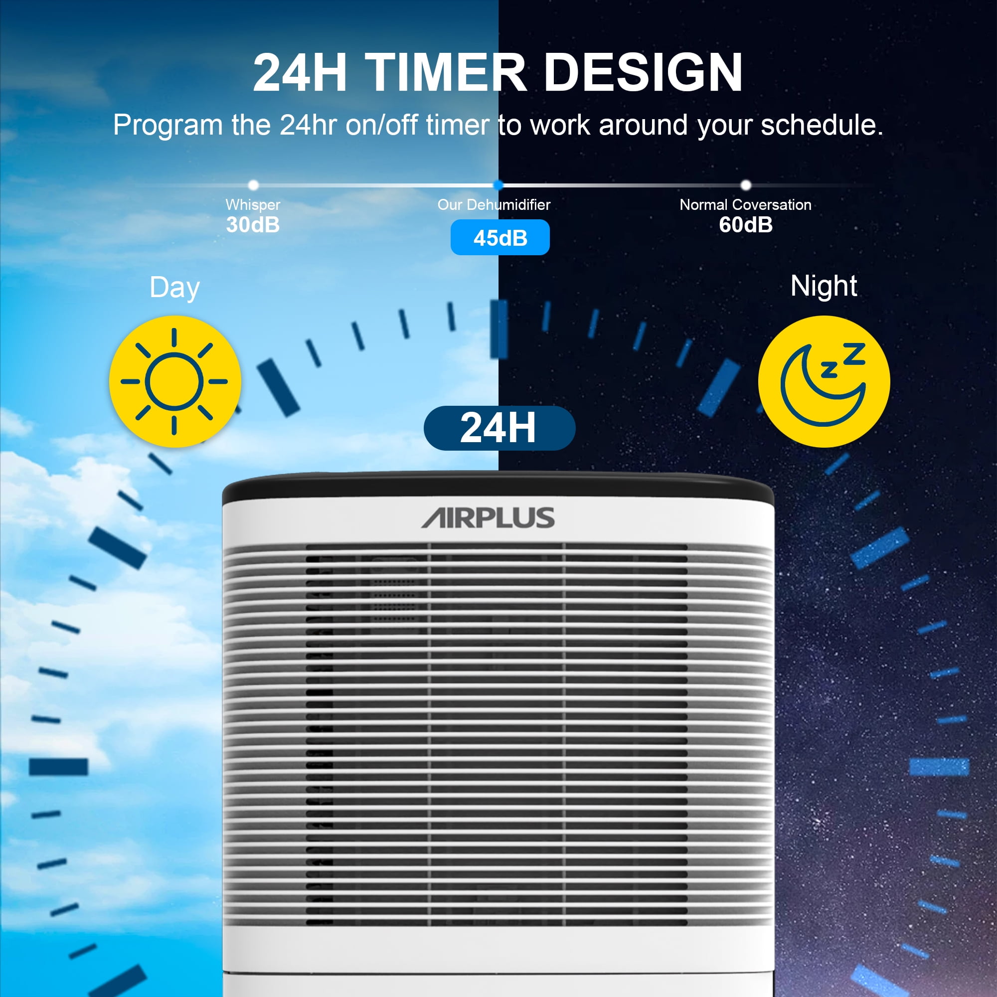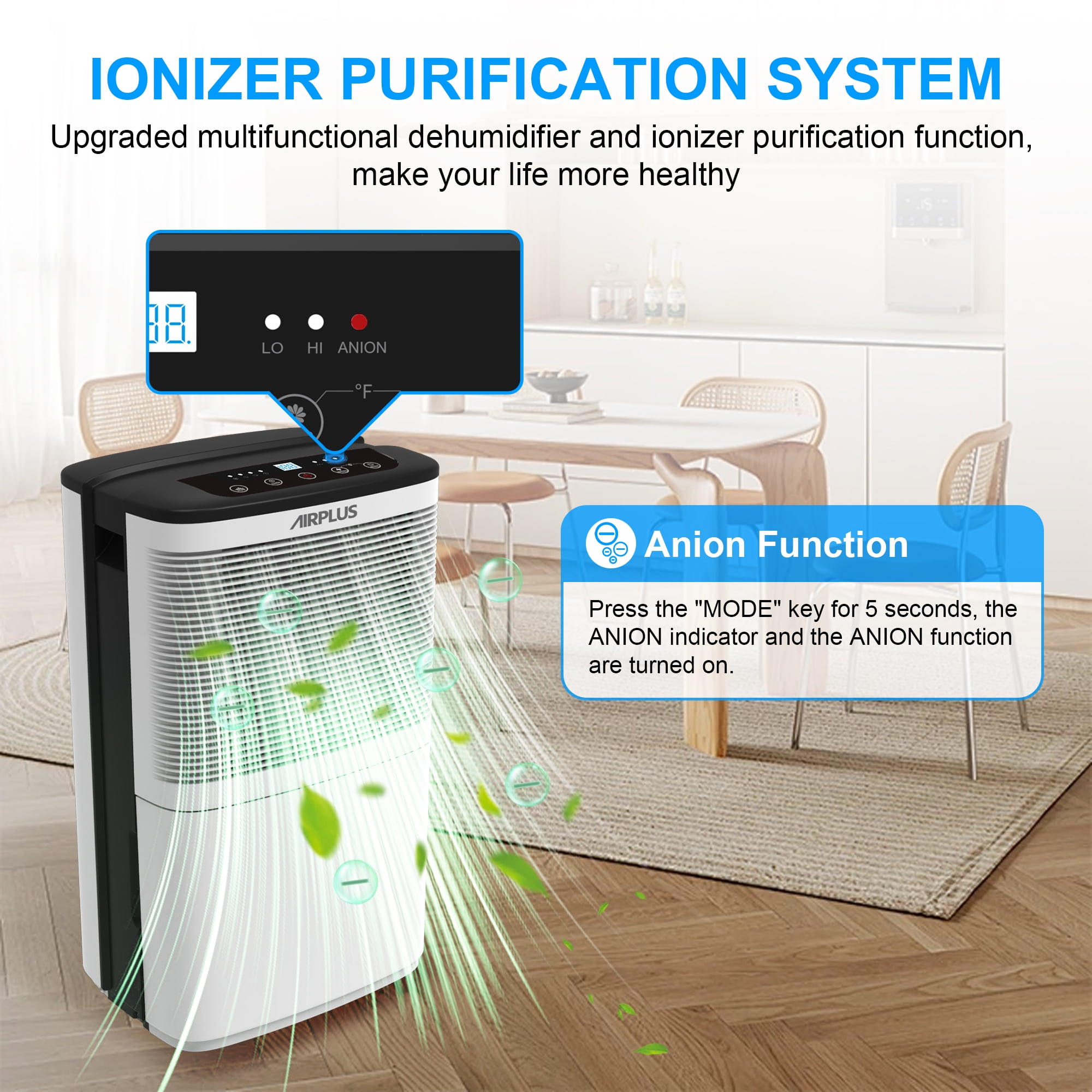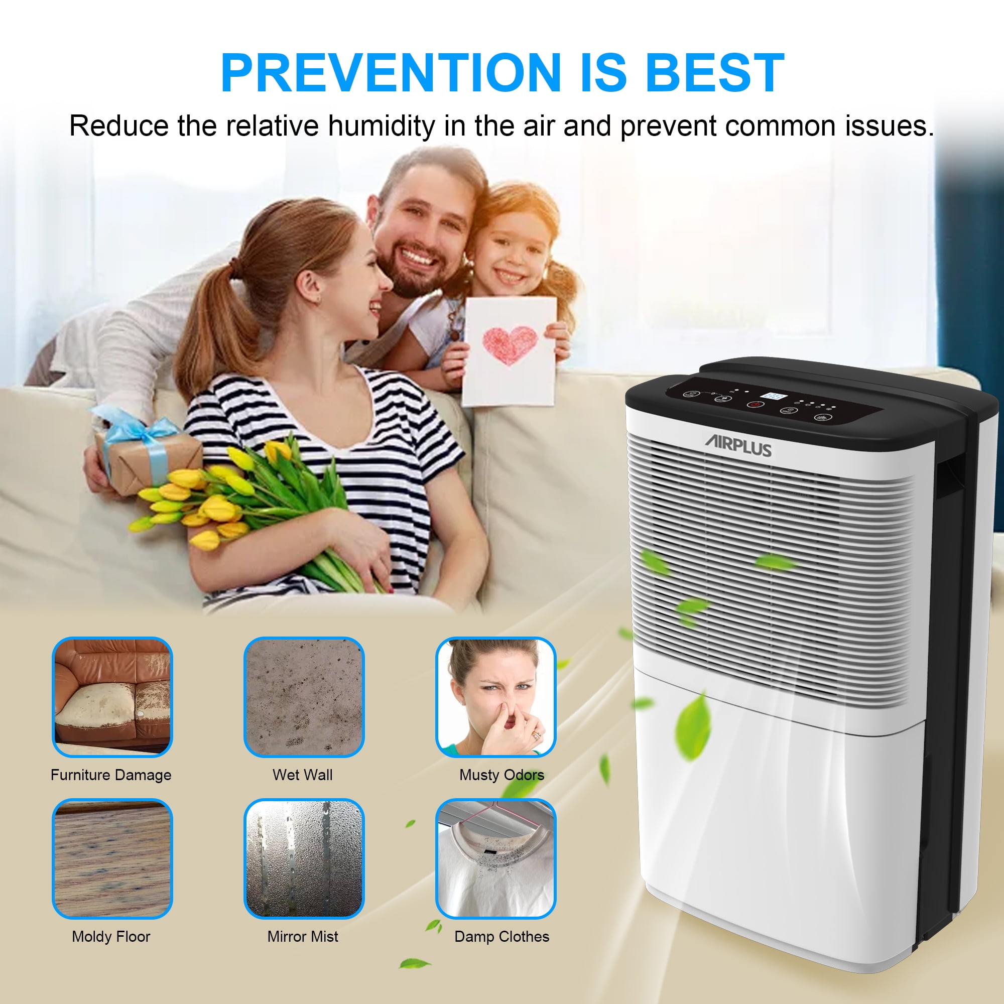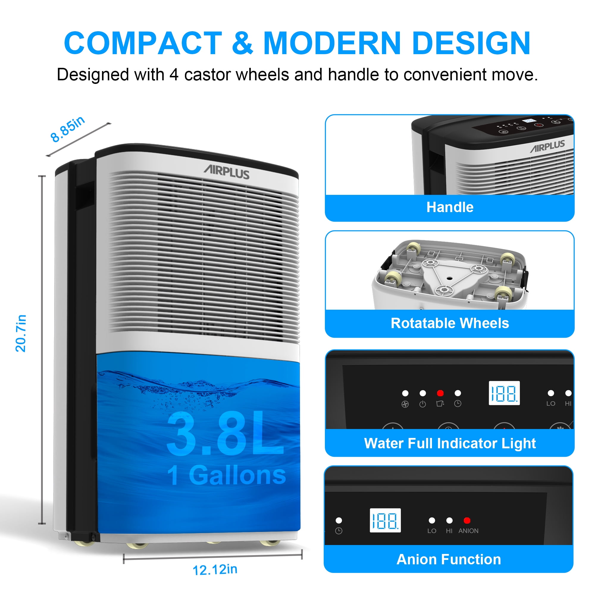 AIRPLUS Compared with the other bathroom dehumidifier for the home, the room dehumidifiers for the bathroom-(AP16-601EE) for the home with 3.8L//1Gallon capacity can quickly and quietly remove up to Dehumidifier (DOE Rating 9.69 pints/day) 50 Pint Max bathroom dehumidifiers of moisture from the air per day. The effect of dehumidification is affected by the flow of air, the smaller space means a more obvious effect. Besides, the amount of dehumidification may change with temperatures and humidity. The control panel of the AIRPLUS basement dehumidifier for the home features a simple design with informative buttons, including DRYING for stronger dehumidification, HUMIDITY for customized settings, 24H TIMER for auto-start and auto-stop. The dehumidifiers for basement with hose reaches its optimum performance at room temperatures of 5°C – 35 °C.