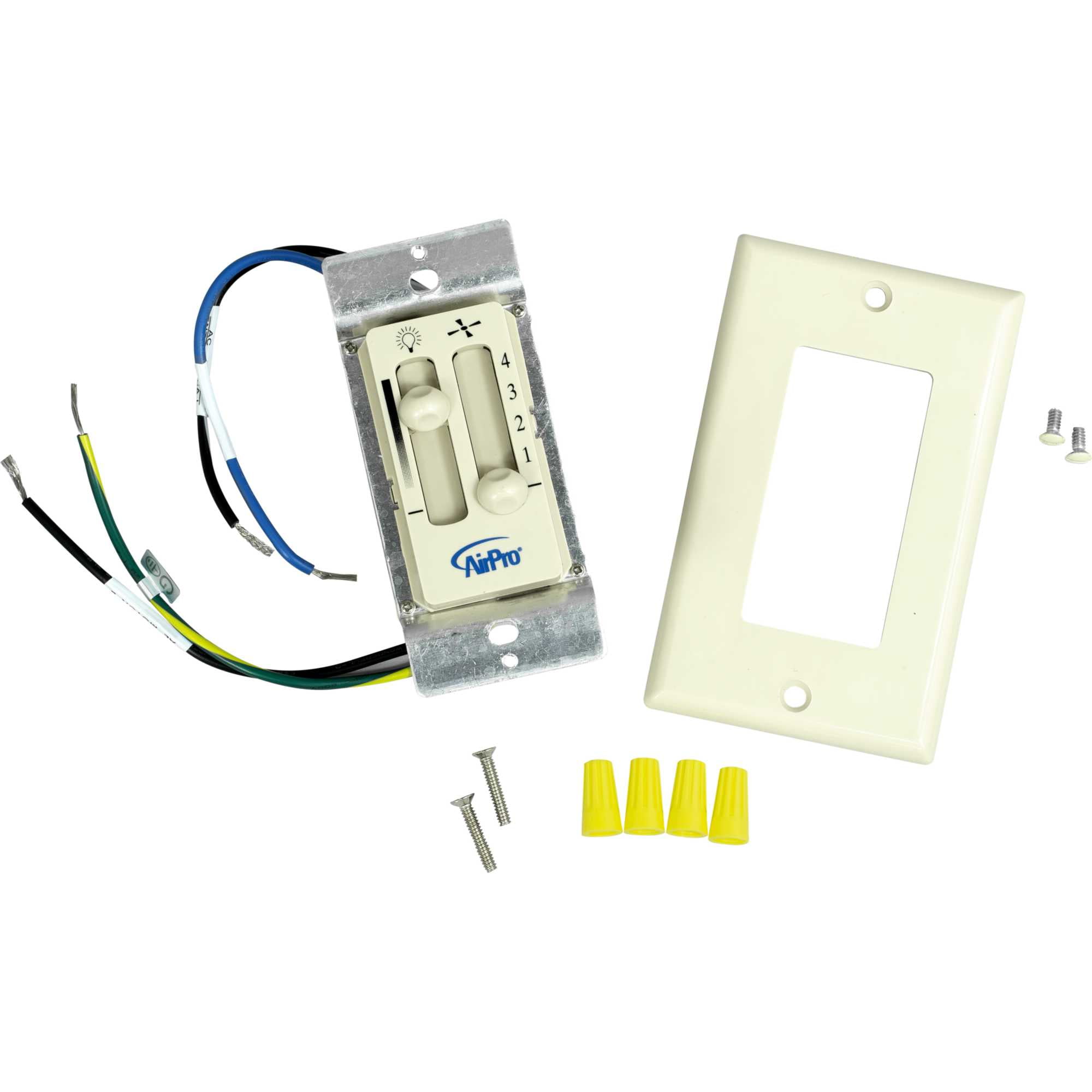 Four-speed, ceiling fan white wall control provides convenient operation for fans with pull-chain controls. Includes full-range lighting dimmer and switch plate cover. Requires two circuits – fits single gang wall box.