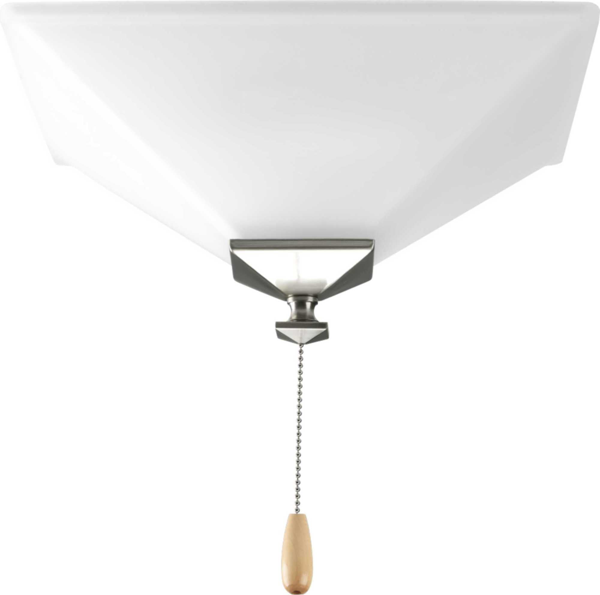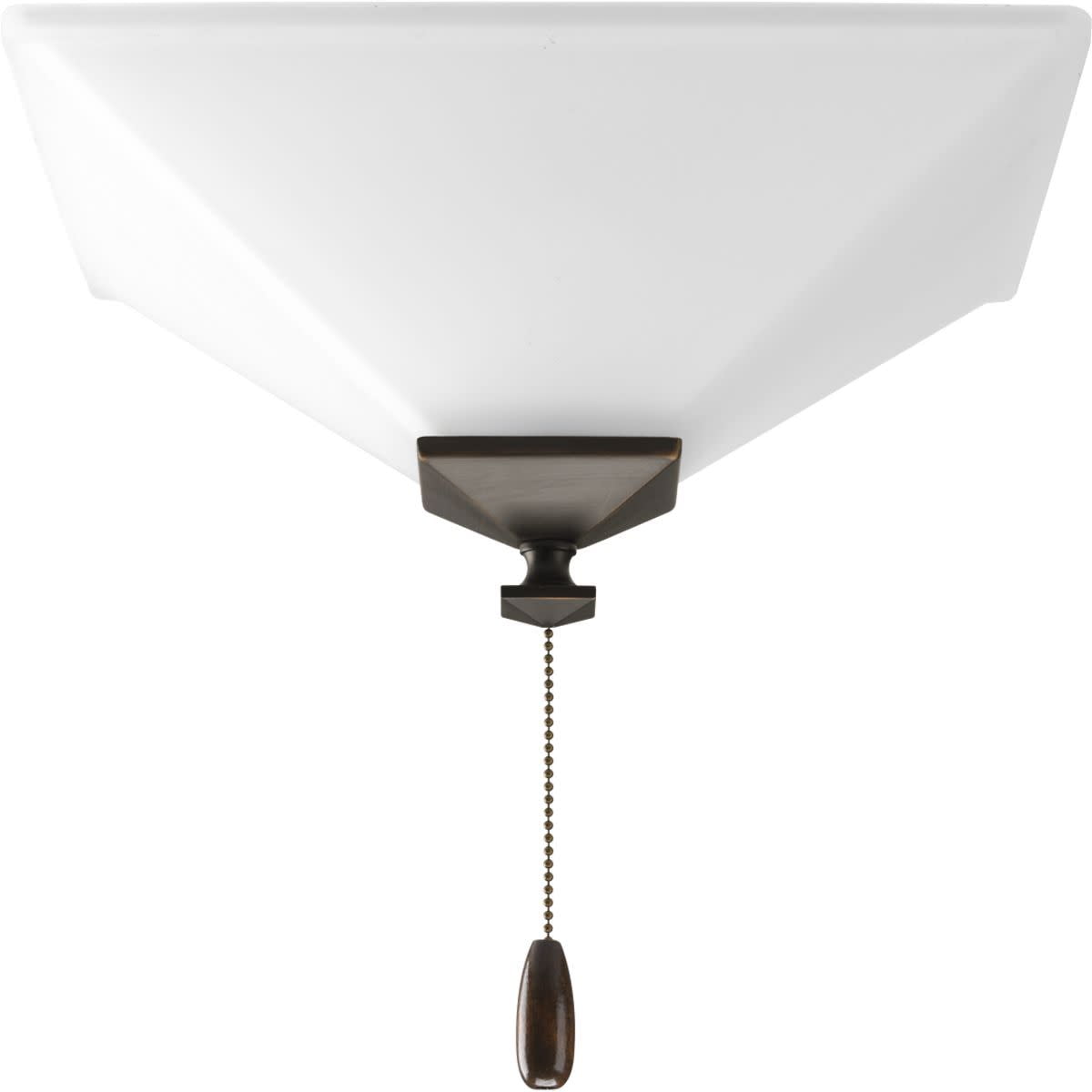 Add style and light to your ceiling fan with this universal fan light kit. White, squared escutcheon and finial support etched glass. Finials included are -09 Brushed Nickel, and -20 Antique Bronze.