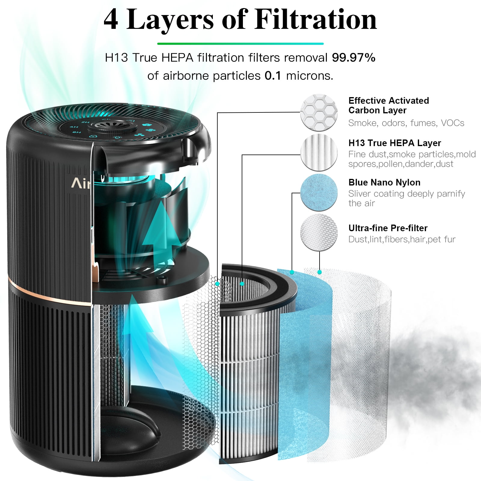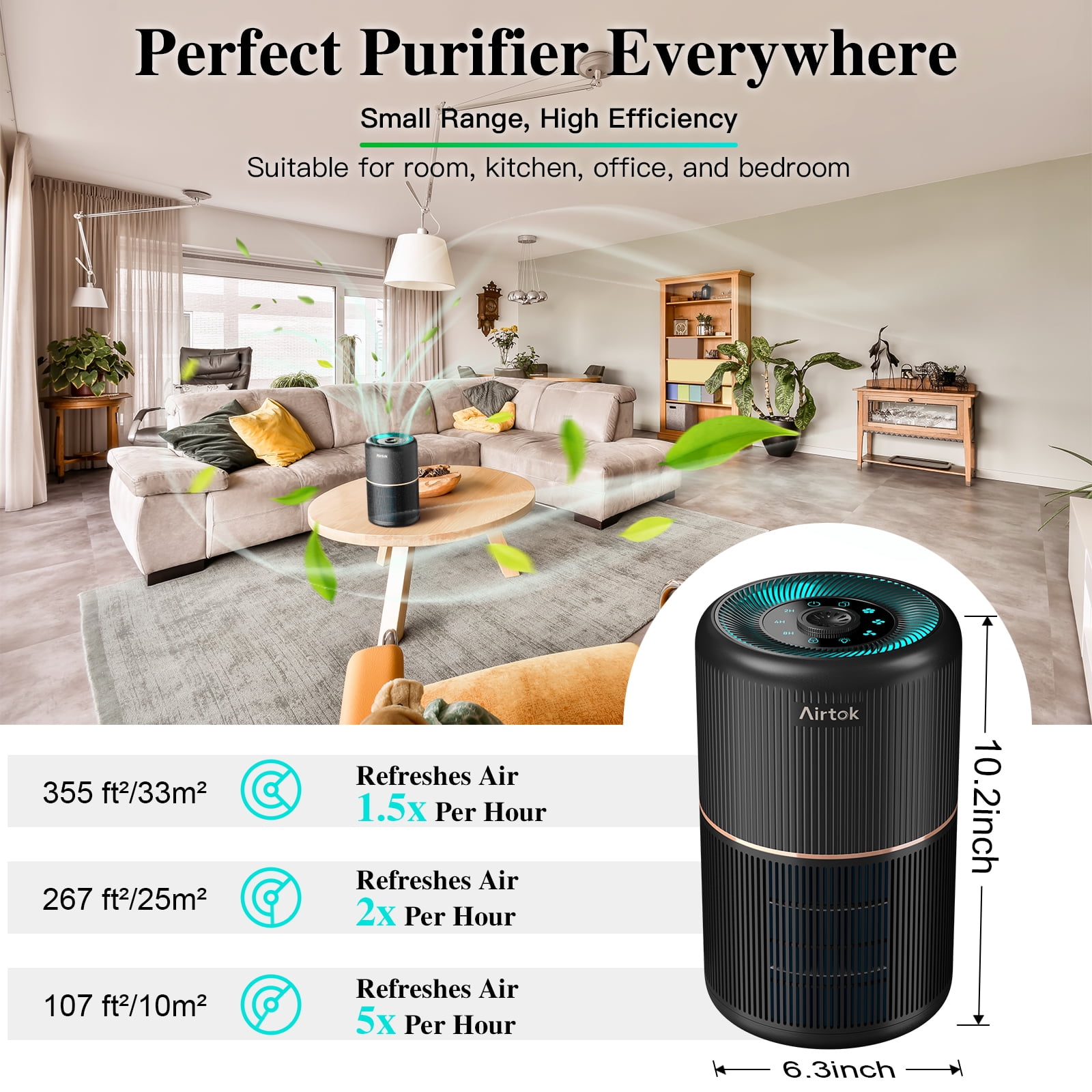 AIRTOK Air Purifier for Large Rooms, 534 Sq.ft, HEPA Air Cleaner for Smoke, Mold, Pet Hair, Dust, Pollen, AP0601 Black