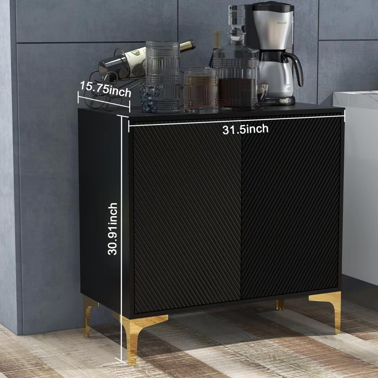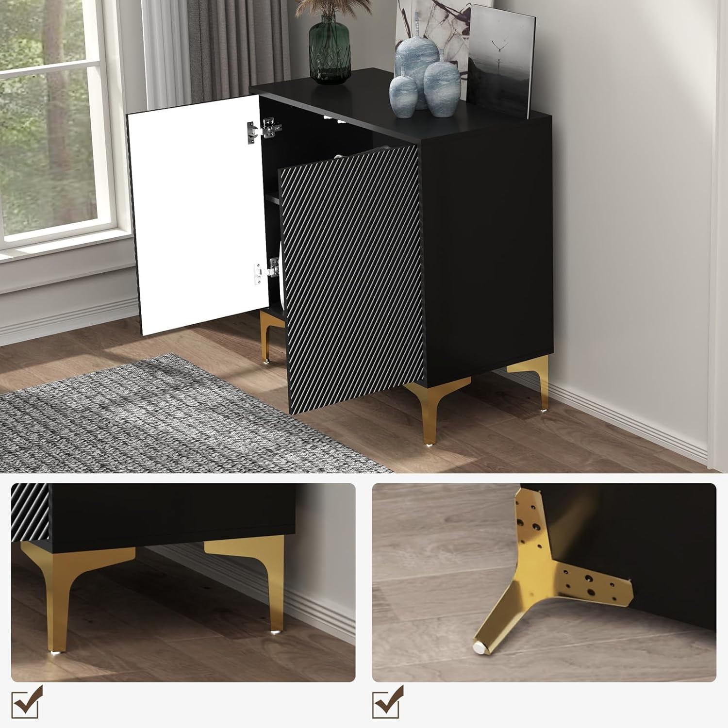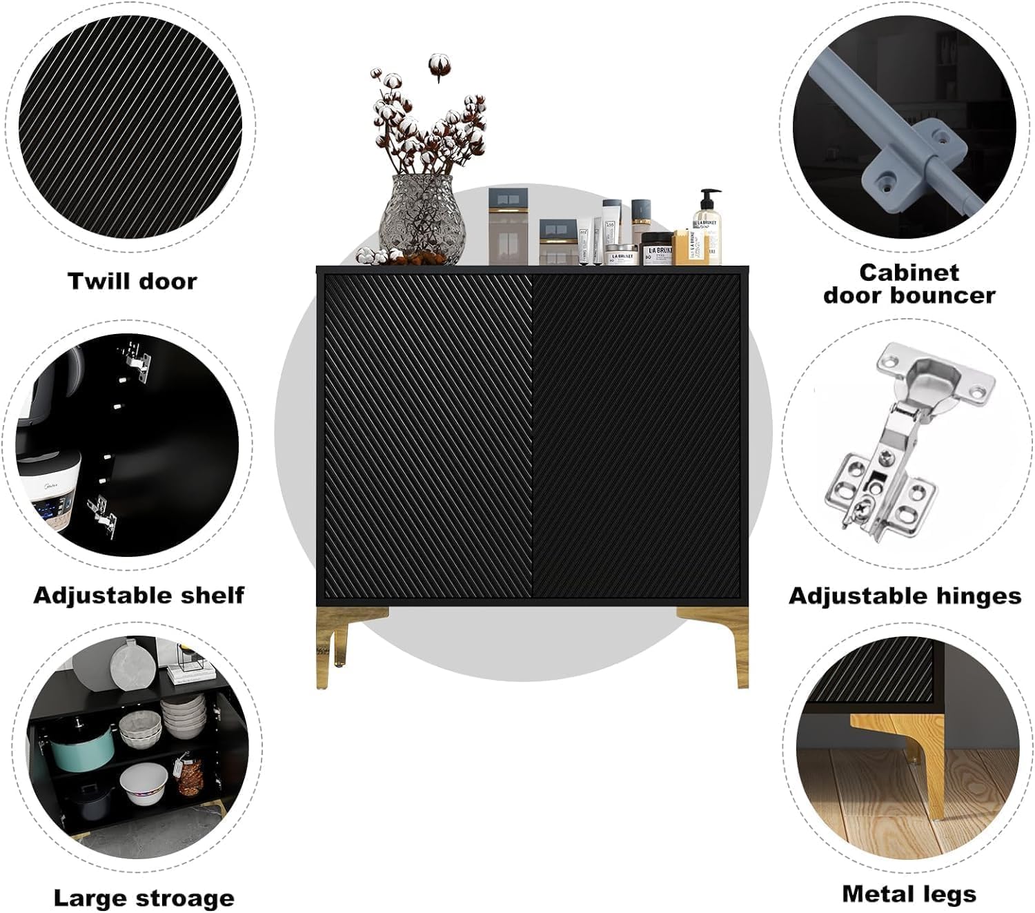 [Modern Appearance] The clever combination of golds and black provides a great visual experience for this cabinet, making it a distinctive piece of furniture that complements a variety of decorative styles and adds a touch of elegance to your home. [Storage Space] This entryway cabinet features 2 shelves of storage and 2 doors so you can keep your microwave, small oven, toaster or blender on the table. The cabinet provides ample storage space for your dishes, books, and other items [Sturdy Construction] The entryway storage cabinet is made of high quality wood, 4 metal legs make the accent cabinet more stable. Rugged construction allows buffet to withstand up to 220 lbs. [Multi-use] The storage cabinet is a great choice for your kitchen. Also, it can be used as sideboard, buffet, cupboard and entryway cabinet in dining room, living room, entrance/hallway etc. Perfectly styled with any furniture [Easy Assembly] It comes with simple and clear instructions and labeling pieces for easy installation in 1 hour. If you have any questions, please feel free to contact us
