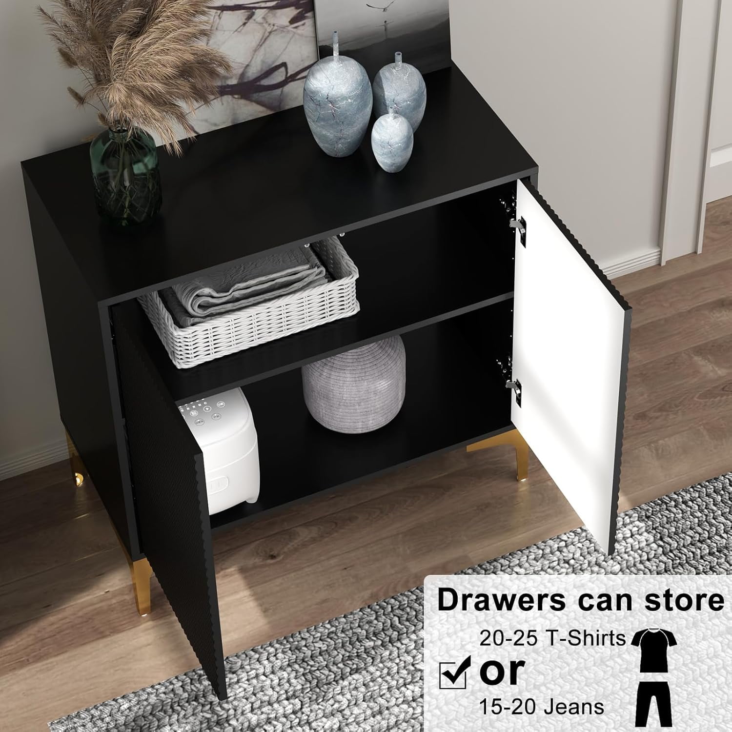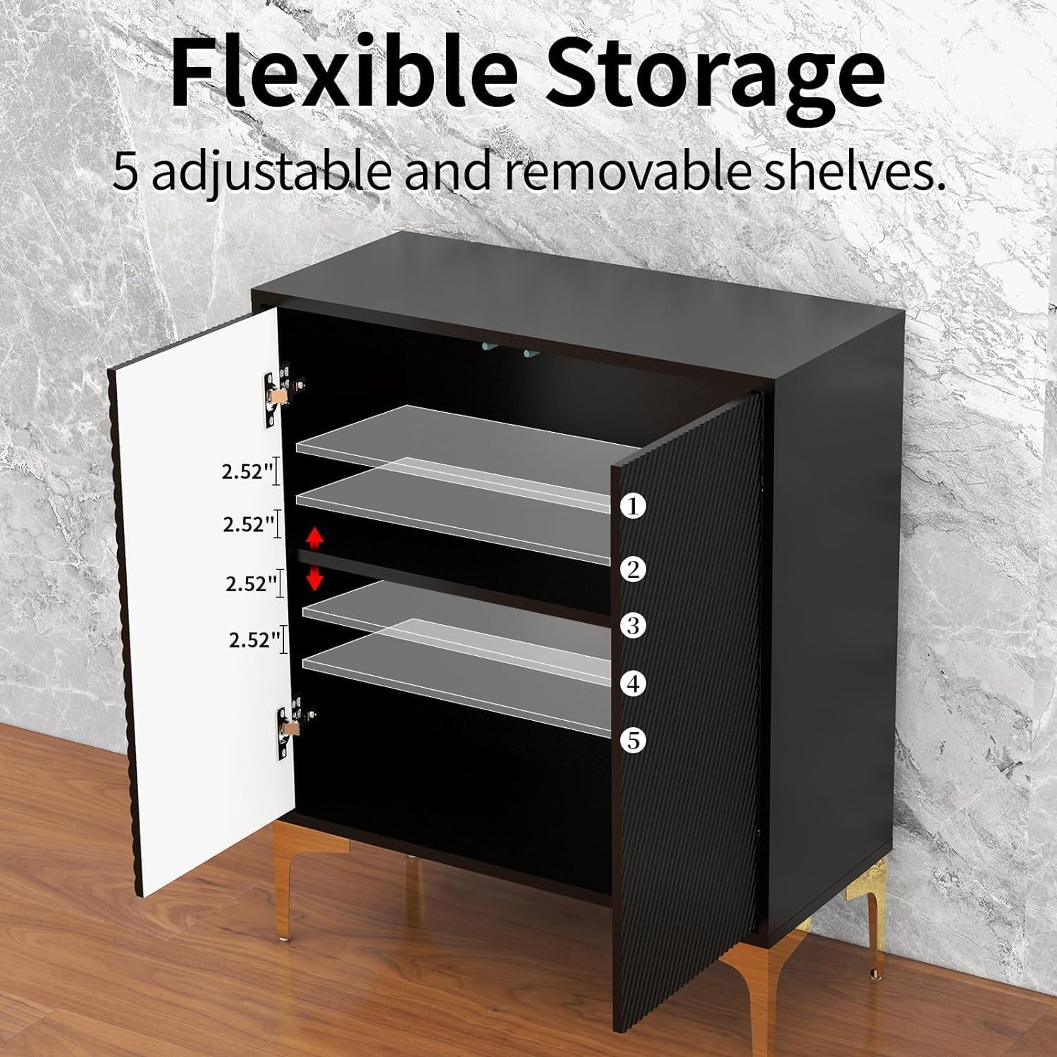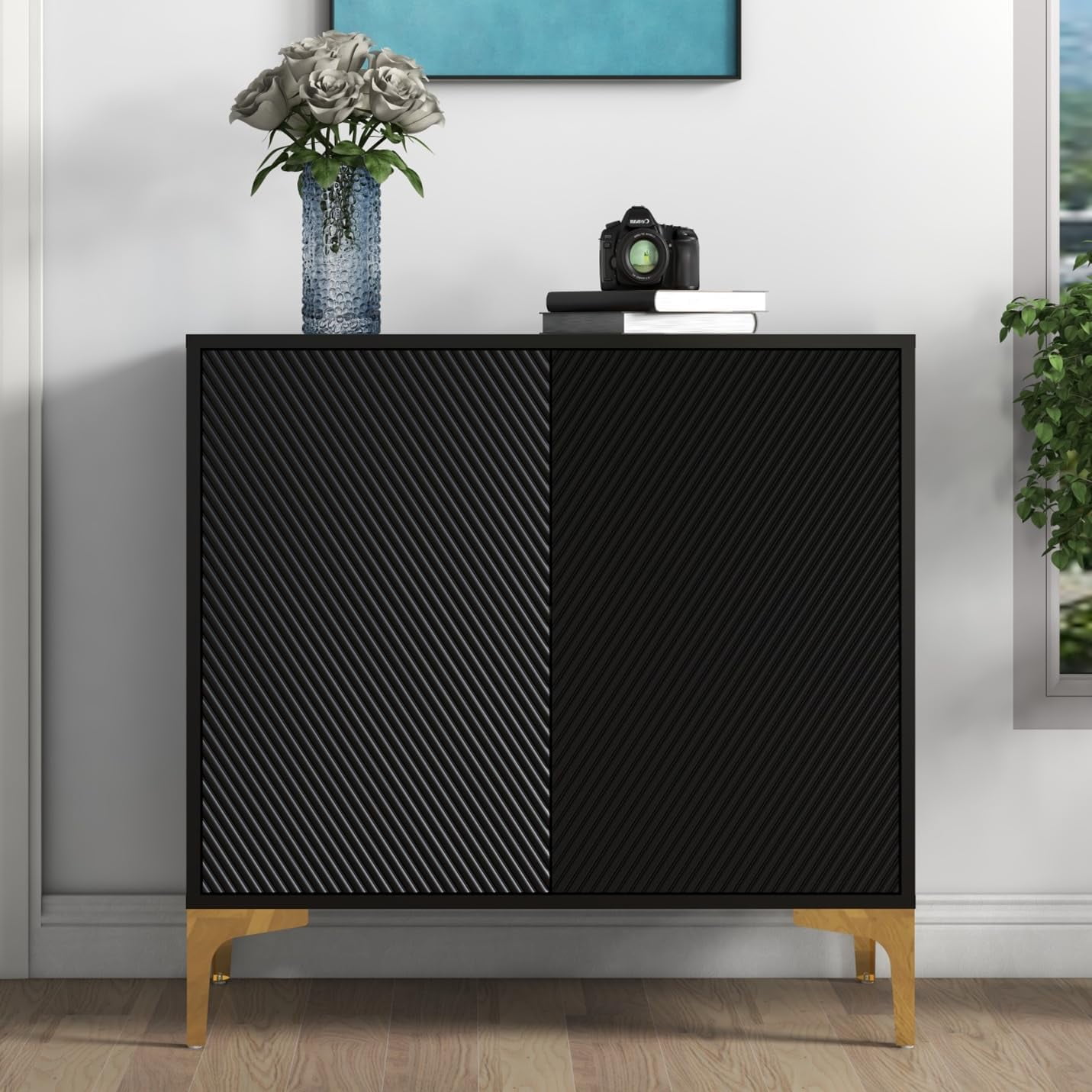 [Modern Appearance] The clever combination of golds and black provides a great visual experience for this cabinet, making it a distinctive piece of furniture that complements a variety of decorative styles and adds a touch of elegance to your home. [Storage Space] This entryway cabinet features 2 shelves of storage and 2 doors so you can keep your microwave, small oven, toaster or blender on the table. The cabinet provides ample storage space for your dishes, books, and other items [Sturdy Construction] The entryway storage cabinet is made of high quality wood, 4 metal legs make the accent cabinet more stable. Rugged construction allows buffet to withstand up to 220 lbs. [Multi-use] The storage cabinet is a great choice for your kitchen. Also, it can be used as sideboard, buffet, cupboard and entryway cabinet in dining room, living room, entrance/hallway etc. Perfectly styled with any furniture [Easy Assembly] It comes with simple and clear instructions and labeling pieces for easy installation in 1 hour. If you have any questions, please feel free to contact us