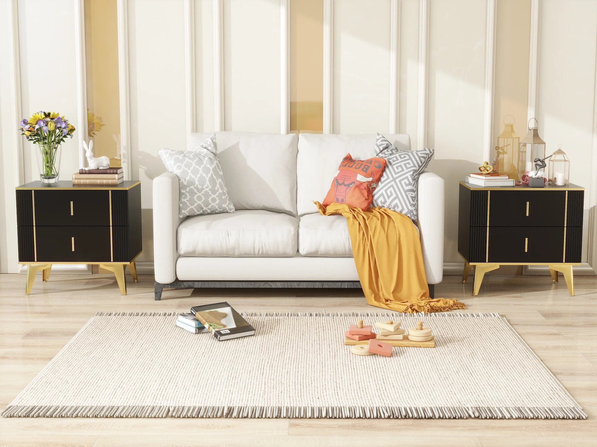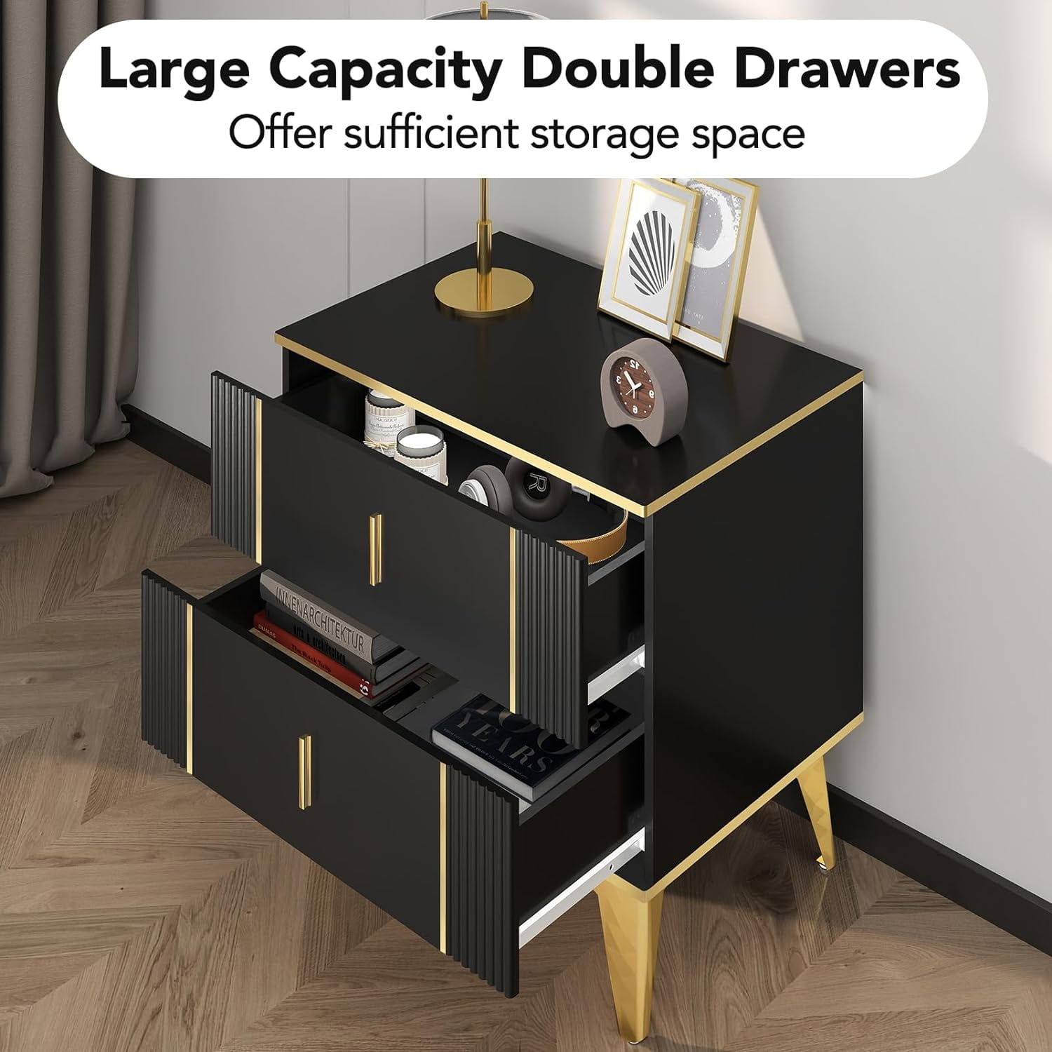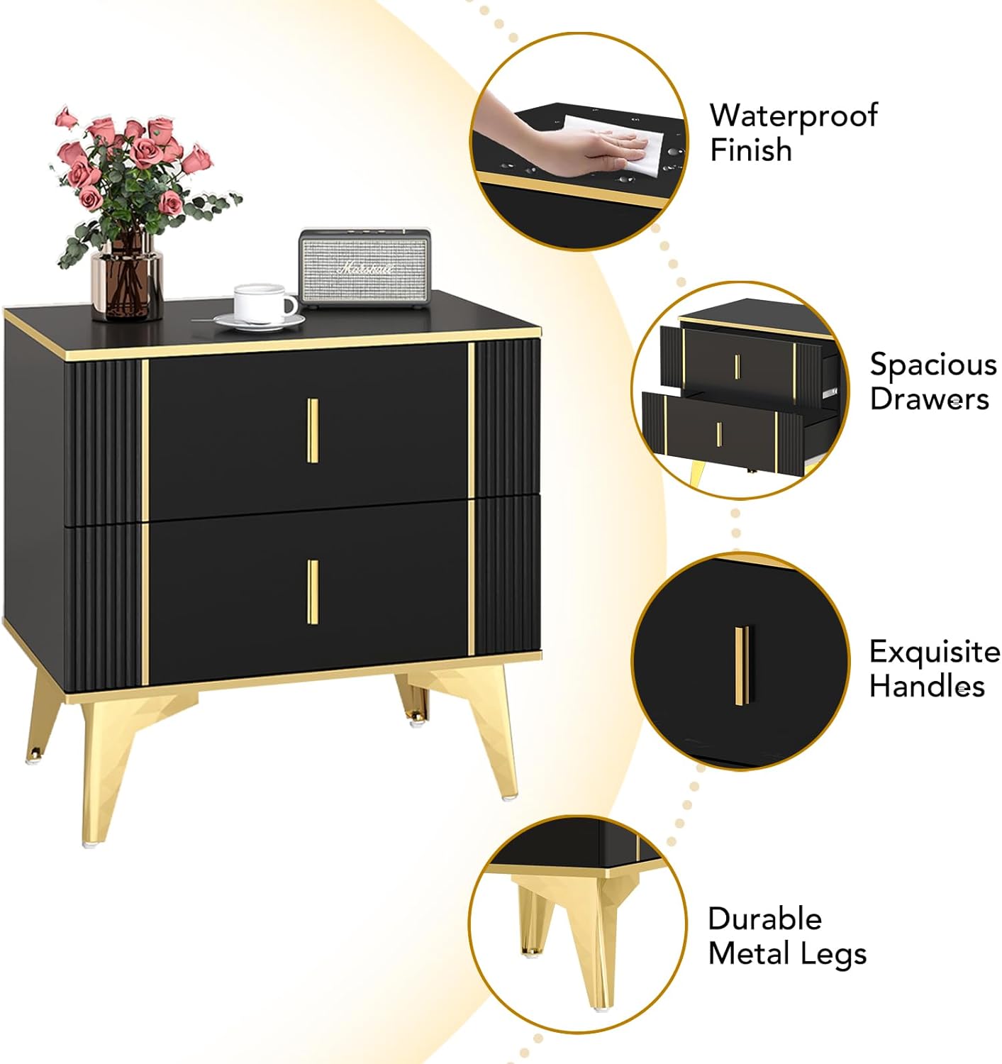 1. Light Luxury Side Table: Introducing you stylish bedside table with 2 drawers-the perfect blend office of functionality and minimal design .The small end side table with storage is a must-have your room furniture collection. 2. 2 Drawers for Storage: Crafted with modern design with a sturdy metal frame and an eye-catching black gold finish that will add a touch of elegance to any room. The opaque cabinet is perfect for tight spaces, but its two roomy drawers provide ample storage space. 3. Multifunctional Design: Its versatile design allow to be used as a bedside table in the bedroom,keeping your essentials within easy reach,or as a coffee table in the lying room, displaying your favorite decorative items. The top surface is perfect for placing a desk lamp, alarm clock or a refreshing glass of water. 4. Easy Assembly: The shoe cabinet comes with easy-to-follow instructions and all necessary hardware, making assembly a breeze. 5. Sturdy & Durable: Measures 23.62 “W x 15.6 “D x 23 “H. This side table is made of high quality MDF with a scratch-resistant and waterproof surface. Four legs made from metal legs , are stably placed in a splayed shape to prevent wobbling. Each table leg comes with non-slip rubber pads at the bottom, which can protect the floor from scratches more firmly and reduce noise when moving, giving you a quiet home environment.