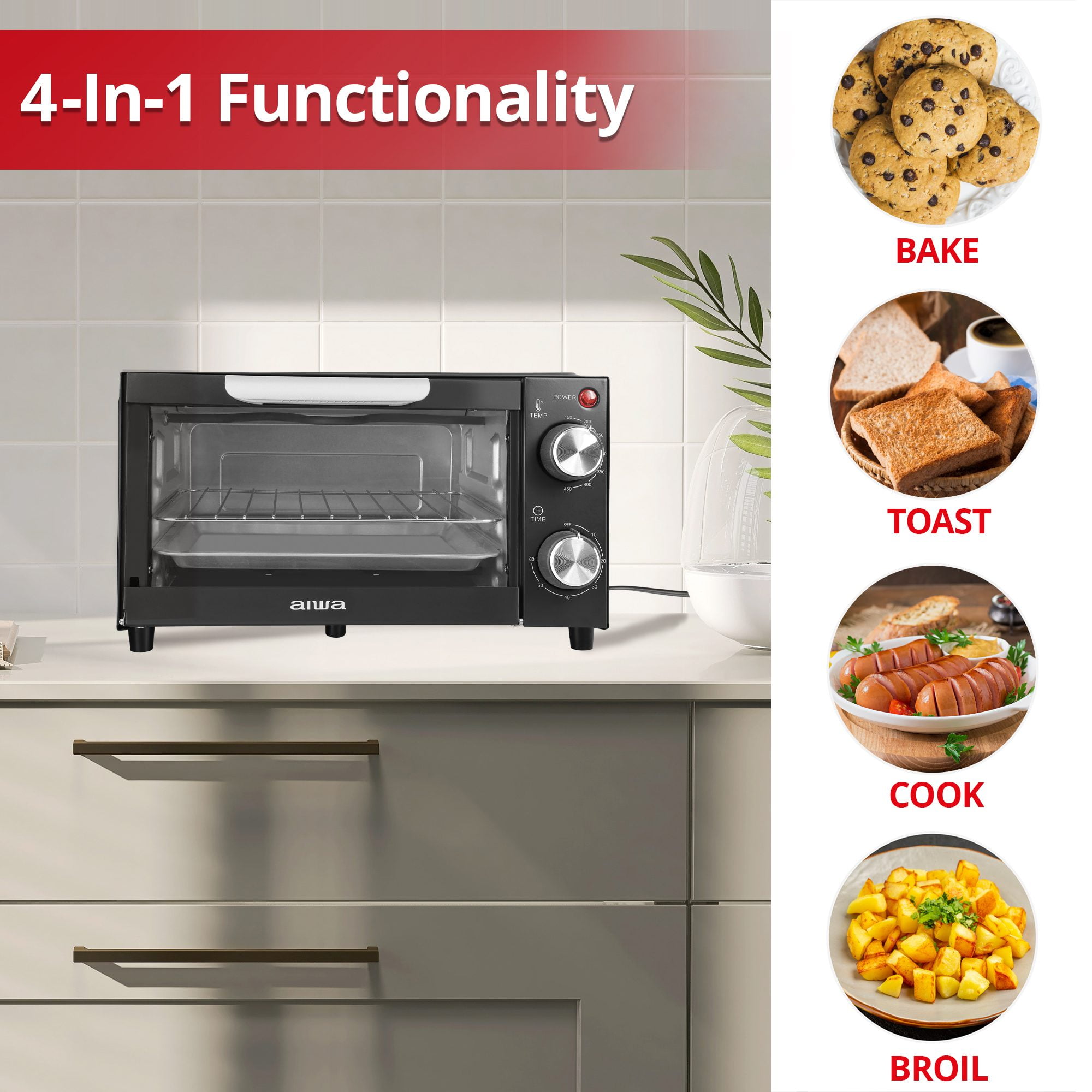 Introducing the new Aiwa 750W Black Toaster Oven 4 Slice with Baking Tray, the perfect appliance for any kitchen. With its sleek black finish and compact design, this toaster oven is sure to complement any décor. But don’t let its size fool you, this toaster oven is packed with features. With 4 slice capacity, you can easily toast bread, bagels, or waffles for breakfast. Or, use the toaster oven to bake cookies, cakes, or pizzas for dessert. The toaster oven also features a broil function, so you can cook chicken, fish, or vegetables to perfection. The toaster oven is easy to use. Simply set the temperature and timer, and the toaster oven will do the rest. The 60 minute timer ensures that your food will never overcook, and the automatic shutoff feature prevents fires. The toaster oven also includes a baking tray and a crumb tray for easy cleanup. So what are you waiting for? Order your Aiwa 750W Black Toaster Oven 4 Slice with Baking Tray today!