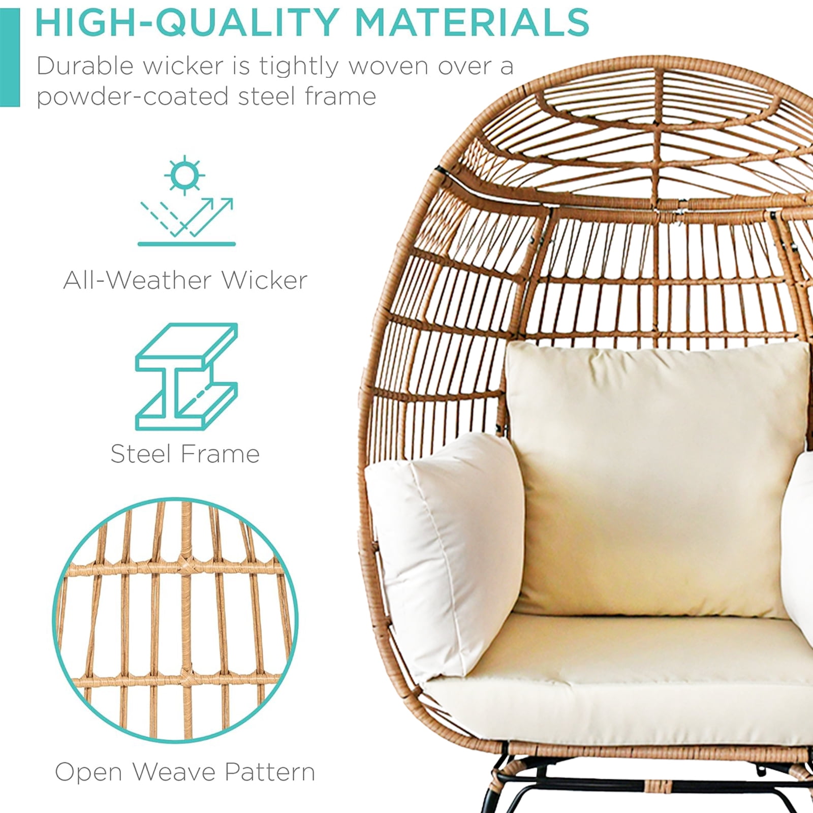 AKIUDEX Indoor Outdoor Stationary Wicker Egg Chair Oversized Thicken Cushions Egg Seat with Legs 450lbs Egg Basket Lounge Chair with Ottoman, Boho Rattan Chair for Patio Balcony Beige. Material: PE Rattan, Metal, Polyester, Sponge, Spray-bonded Non-woven Fabric Indoor Accent Seat: A distinct, open-weave pattern adds a bohemian touch and complements the decor of your living room, bedroom, or sunroom. 450 lbs Max Load: Supported by sturdy and rustproof metal frame, this oversized lounger chair ensures 450 lbs stronger stability while making it suitable for the outdoor environment. Likewise, the mix brown/light brown hand-woven PE wicker is colorfast and sun-protective for higher outdoor durability. Please do not let the product get wet for prolonged service time. 5in Thickened Cushions: The 5 inches thickened seat cushion makes you feel more comfortable. Meanwhile, other cushions are padded with high-density fillings as well for extra comfort. All the cushion covers are removable for easy cleaning. Note: please always keep cushions dry to prolong the service time.