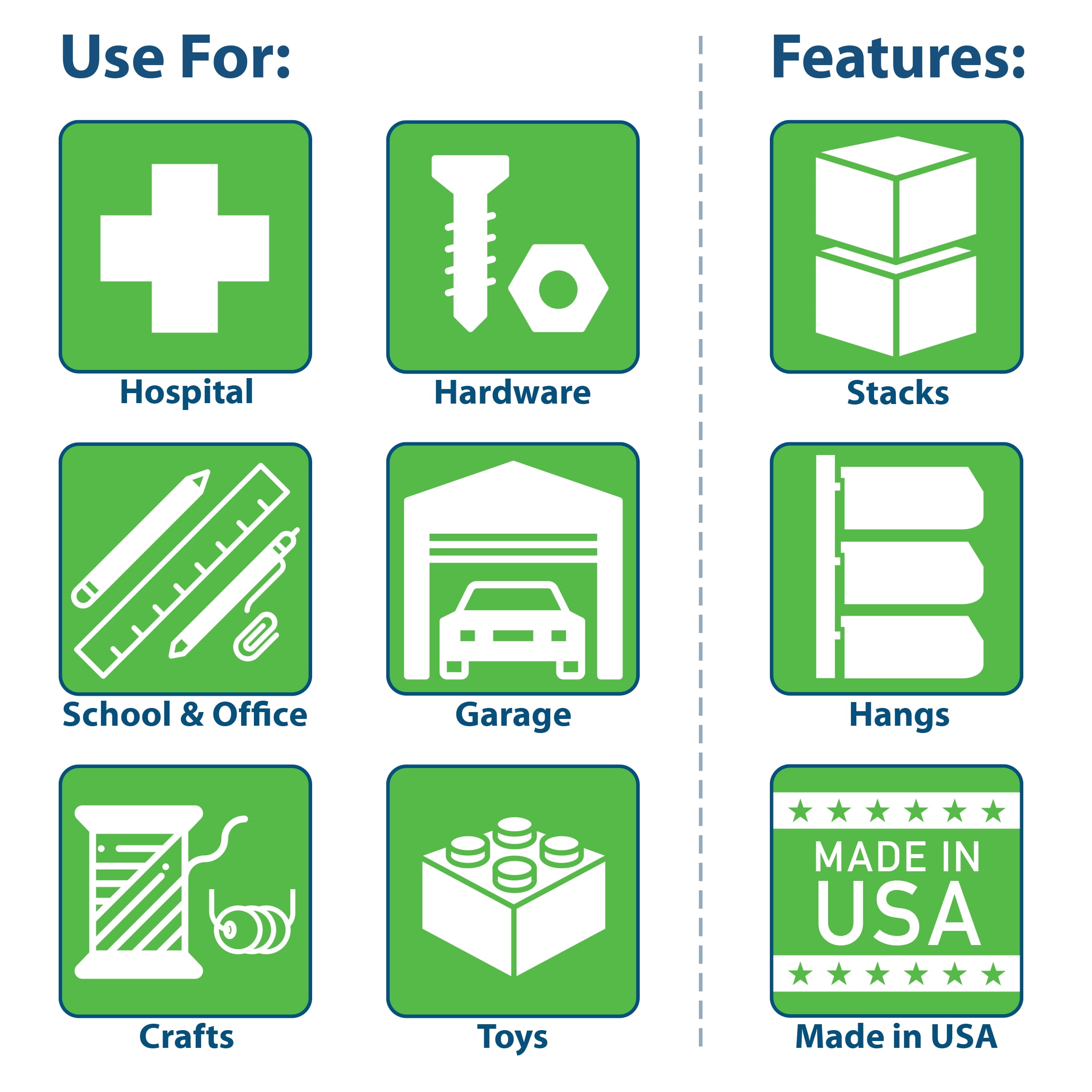 Do you need some extra storage space? Heavy-duty AkroBins help you organize everything from a workbench in a one car garage to a warehouse full of parts. Use our stacking bins for any job large or small! Turn your messy space into an organized, efficient work area. These plastic organizer bins can be stacked to make the most of your space while still keeping everything accessible. You can also hang our storage bins on Akro-Mils louvered panels or rails to free up work desk or shelf space. Perfect for classrooms, play areas, garages, or any other area that needs extra storage. All Akro-Mils products are Made in the USA. Stay organized with the Akro-Mils Stackable Storage Bins! Choose a set of stacking bins that you can count on! These heavy duty storage bins are made with a one-piece, industrial-strength plastic construction and are rust, water and corrosion-proof. You can count on them to last for the long term. AkroBins are available in a variety of sizes. The smaller ones can be used to keep screws, craft supplies, small toys, candy or snacks, while the largest ones are great for holding sporting equipment and garage items! Our storage bins are great for organizing classrooms, your workshop, and play areas. Started in 1946, Akro-Mils has provided high quality storage and material handling solutions for over 75 years. Our products are manufactured under rigorous standards and are quality tested to ensure they continuously meet your performance expectations When you need screw organizers and storage bins, we’re the brand to trust. Add the Akro-Mils Stackable Storage Bins to your cart today!