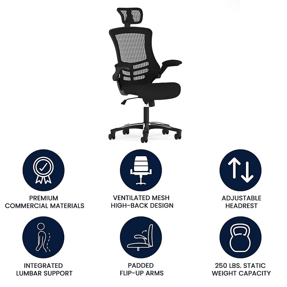 With its two-tone black nylon and chrome base, this comfortable desk chair with wheels lends a contemporary style to any space. The thick-padded seat and ventilated mesh material allow air to circulate without restriction, keeping you cool and comfortable, even when sitting for long periods of time. This swivel chair rotates 360 degrees and easily lowers and raises with a pneumatic seat height adjustment lever to deliver the perfect fit every time. Its flip-up arms provide the option of an armless office desk chair design ideal for projects that require a free range of motion, while the swivel chair’s adjustable headrest helps to support the neck. The tilt-lock mechanism allows users to enjoy a relaxing rocking or reclining motion while taking a quick break from working on the computer or answering phones. Featuring functional construction that doesn’t compromise on style, this high-back mesh office chair has: Dual-wheel casters that roll smoothly over hard or carpeted surfaces. A tilt tension adjustment knob that locks the chair in place. Ergonomic construction that keeps the back supported and the body properly aligned during work sessions. Fire-retardant foam filling that promotes increased safety without compromising on comfort. Designed to ensure extra comfort and support, our high-back executive office chair also features a waterfall seat edge made to remove pressure from the lower legs while improving circulation. Upgrade your work area with our high-back office chair featuring an attractive contemporary design and built-in lumbar support to help keep you productive and focused from task to task.